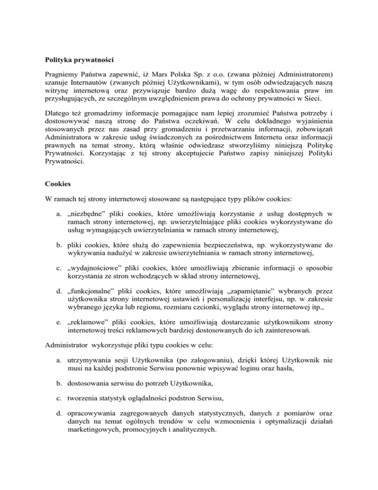 Polityka prywatności Pragniemy Państwa zapewnić, iż Mars Polska Sp. z o.o. (zwana później Administratorem) szanuje Internautów (zwanych później Użytkownikami), w tym osób odwiedzających naszą witrynę internetową oraz przywiązuje bardzo dużą wagę do respektowania praw im przysługujących, ze szczególnym uwzględnieniem prawa do ochrony prywatności w Sieci. Dlatego też gromadzimy informacje pomagające nam lepiej zrozumieć Państwa potrzeby i dostosowywać naszą stronę do Państwa oczekiwań. W celu dokładnego wyjaśnienia stosowanych przez nas zasad przy gromadzeniu i przetwarzaniu informacji, zobowiązań Administratora w zakresie usług świadczonych za pośrednictwem Internetu oraz informacji prawnych na temat strony, którą właśnie odwiedzasz stworzyliśmy niniejszą Politykę Prywatności. Korzystając z tej strony akceptujecie Państwo zapisy niniejszej Polityki Prywatności. Cookies W ramach tej strony internetowej stosowane są następujące typy plików cookies: a. „niezbędne” pliki cookies, które umożliwiają korzystanie z usług dostępnych w ramach strony internetowej, np. uwierzytelniające pliki cookies wykorzystywane do usług wymagających uwierzytelniania w ramach strony internetowej, b. pliki cookies, które służą do zapewnienia bezpieczeństwa, np. wykorzystywane do wykrywania nadużyć w zakresie uwierzytelniania w ramach strony internetowej, c. „wydajnościowe” pliki cookies, które umożliwiają zbieranie informacji o sposobie korzystania ze stron wchodzących w skład strony internetowej, d. „funkcjonalne” pliki cookies, które umożliwiają „zapamiętanie” wybranych przez użytkownika strony internetowej ustawień i personalizację interfejsu, np. w zakresie wybranego języka lub regionu, rozmiaru czcionki, wyglądu strony internetowej itp., e. „reklamowe” pliki cookies, które umożliwiają dostarczanie użytkownikom strony internetowej treści reklamowych bardziej dostosowanych do ich zainteresowań. Administrator wykorzystuje pliki typu cookies w celu: a. utrzymywania sesji Użytkownika (po zalogowaniu), dzięki której Użytkownik nie musi na każdej podstronie Serwisu ponownie wpisywać loginu oraz hasła, b. dostosowania serwisu do potrzeb Użytkownika, c. tworzenia statystyk oglądalności podstron Serwisu, d. opracowywania zagregowanych danych statystycznych, danych z pomiarów oraz danych na temat ogólnych trendów w celu wzmocnienia i optymalizacji działań marketingowych, promocyjnych i analitycznych. Administrator informuje, że Użytkownik może poprzez zmianę ustawień przeglądarki wyłączyć obsługę plików «cookies». Najczęściej odpowiednia opcja znajduje się w zakładce prywatność lub ustawienia danego programu. Poniżej Administrator opisuje, jak można zmienić ustawienia cookies w najpopularniejszych przeglądarkach internetowych: Internet Explorer: 1. Otwórz program Internet Explorer, klikając przycisk Start, a następnie klikając polecenie Internet Explorer. 2. Kliknij przycisk Narzędzia, a następnie kliknij polecenie Opcje internetowe. 3. Kliknij kartę Prywatność, a następnie w obszarze Ustawienia przesuń suwak do najwyższego położenia, aby zablokować wszystkie pliki cookies, lub do najniższego położenia, aby zezwolić na wszystkie pliki cookies, a następnie kliknij przycisk OK. Chrome: 1. 2. 3. 4. 5. Kliknij menu Chrome na pasku narzędzi przeglądarki. Wybierz Ustawienia. Kliknij Pokaż ustawienia zaawansowane. W sekcji „Prywatność” kliknij przycisk Ustawienia treści. W sekcji „Pliki cookies” możesz zmienić ustawienia plików cookies Firefox: 1. Na górze okna Firefoksa naciśnij przycisk Firefox, (w systemie Windows XP kliknij menu Narzędzia) i wybierz Opcje. 2. Wybierz panel Prywatność. 3. Z menu rozwijanego elementu Program Firefox: wybierz opcję: będzie używał ustawień historii użytkownika. 4. Zaznacz Akceptuj ciasteczka, by włączyć, odznacz, by wyłączyć obsługę ciasteczek. Opera: 1. Przejdź do zakładki Narzędzia w górnym menu Opery i z rozwijanego menu wybierz Preferencje. 2. W okienku, które się pojawi przejdź do zakładki Zaawansowane, z menu po lewej stronie wybierz Ciasteczka i zmień ustawienia plików cookies Administrator informuje, że w razie problemów ze zmianą ustawień plików cookies, najlepiej skorzystać z informacji znajdujących się na stronie internetowej producenta danego programu. Administrator informuje, że z momentem połączenia się przez Użytkownika z Serwisem, w logach systemowych Serwisu pojawia się informacja o numerze (w tym IP) i rodzaju urządzenia końcowego Użytkownika lub innej osoby fizycznej, z którego Użytkownik łączy się z Serwisem. Administrator informuje, że będzie przetwarzał, zgodnie z przepisami obowiązującego na terytorium Rzeczypospolitej Polskiej prawa, dane dotyczące numeru (w tym IP) i rodzaju urządzenia końcowego Użytkownika, a także czasu połączenia z Serwisem oraz inne dane eksploatacyjne dotyczące aktywności Użytkownika w Serwisie. Dane te przetwarzane są w celach technicznych. Administrator oświadcza, iż dołoży starań, aby zapewnić Użytkownikowi wysoki poziom bezpieczeństwa w zakresie korzystania z Serwisu, poprzez zastosowanie odpowiednich administracyjnych, technicznych i fizycznych zabezpieczeń danych przed ich przypadkowym lub bezprawnym zniszczeniem, utratą, nieupoważnionym ujawnieniem lub udostępnieniem. Niestety żaden sposób przekazywania danych za pośrednictwem Internetu nie jest w pełni bezpieczny. Wszelkie zdarzenia mające wpływ na bezpieczeństwo przekazu informacji, w tym np. dotyczące podejrzenia udostępnienia plików zawierających szkodliwe oprogramowanie należy zgłaszać na adres: Mars Polska Sp. z o.o. Kożuszki Parcel 42 96-500 Sochaczew Jakiekolwiek pytania dotyczące powyższej polityki prywatności prosimy kierować na adres: Mars Polska Sp. z o.o. Kożuszki Parcel 42 96-500 Sochaczew Linki 