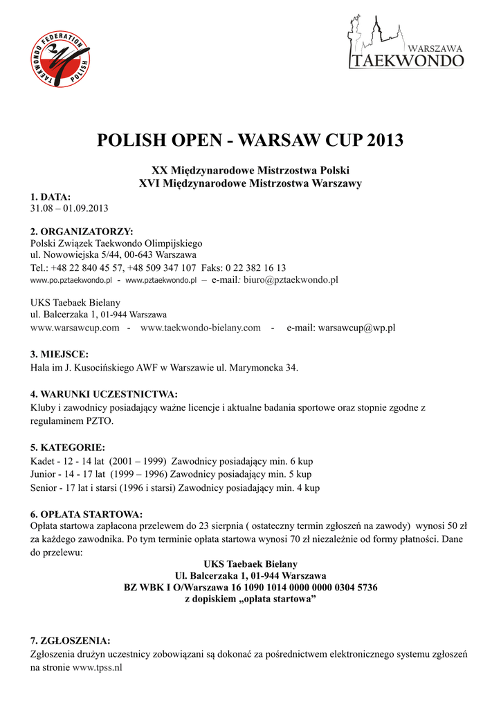 POLISH OPEN - WARSAW CUP 2013 XX Międzynarodowe Mistrzostwa Polski XVI Międzynarodowe Mistrzostwa Warszawy 1. DATA: 31.08 – 01.09.2013 2. ORGANIZATORZY: Polski Związek Taekwondo Olimpijskiego ul. Nowowiejska 5/44, 00-643 Warszawa Tel.: +48 22 840 45 57, +48 509 347 107 Faks: 0 22 382 16 13 www.po.pztaekwondo.pl - www.pztaekwondo.pl – e-mail: [email protected] UKS Taebaek Bielany ul. Balcerzaka 1, 01-944 Warszawa www.warsawcup.com - www.taekwondo-bielany.com - e-mail: [email protected] 3. MIEJSCE: Hala im J. Kusocińskiego AWF w Warszawie ul. Marymoncka 34. 4. WARUNKI UCZESTNICTWA: Kluby i zawodnicy posiadający ważne licencje i aktualne badania sportowe oraz stopnie zgodne z regulaminem PZTO. 5. KATEGORIE: Kadet - 12 - 14 lat (2001 – 1999) Zawodnicy posiadający min. 6 kup Junior - 14 - 17 lat (1999 – 1996) Zawodnicy posiadający min. 5 kup Senior - 17 lat i starsi (1996 i starsi) Zawodnicy posiadający min. 4 kup 6. OPŁATA STARTOWA: Opłata startowa zapłacona przelewem do 23 sierpnia ( ostateczny termin zgłoszeń na zawody) wynosi 50 zł za każdego zawodnika. Po tym terminie opłata startowa wynosi 70 zł niezależnie od formy płatności. Dane do przelewu: UKS Taebaek Bielany Ul. Balcerzaka 1, 01-944 Warszawa BZ WBK I O/Warszawa 16 1090 1014 0000 0000 0304 5736 z dopiskiem „opłata startowa” 7. ZGŁOSZENIA: Zgłoszenia drużyn uczestnicy zobowiązani są dokonać za pośrednictwem elektronicznego systemu zgłoszeń na stronie www.tpss.nl Ostateczny termin zgłoszeń upływa dnia 23.08.2013 Koszt każdej zmiany w zgłoszeniu dokonywanej po tym terminie wynosi 20 złotych. 8. NAGRODY: Medale za miejsca 1-3, certyfikaty udziału dla wszystkich zawodników, nagroda dla najlepszego zawodnika turnieju, klasyfikacja drużynowa, nagrody rzeczowe 9. ZAKWATEROWANIE I WYŻYWIENIE: Informacje na temat możliwości zakwaterowania i wyżywienia będą dostępne na stronie internetowej turnieju. 10. SPRZĘT: Zawody w kategorii kadet, junior i senior rozegrane będą na elektronicznych ochraniaczach firmy Dae do. Zawodnicy powinni posiadać własny komplet ochraniaczy osobistych. Po raz pierwszy w Polsce zawody w kategorii senior rozegrane będą przy użyciu systemu video replay. 11. PROGRAM ZAWODÓW: Piątek 30 sierpnia 12:00 - 20:00 rejestracja i waga dla zawodników startujących w sobotę i niedzielę w biurze zawodów Sobota 31 sierpnia 7:00 – 8:30 śniadanie 9:00 rozpoczęcie zawodów: Kadet: K: -29, -37, -44, -51, -59, M: -33, -41, -49, -57, -65, Junior: K: -42, -46, -52, -59, -68, M: -45, -51, -59,- 68, -78, Senior: K: -49,-57, -67,+73, M: -58,-68, -80,+87, 12:00 – 14:00 waga dla zawodników startujących w niedzielę 17:00 uroczyste otwarcie turnieju Niedziela 1 września 7:00 – 8:30 śniadanie 9:00 rozpoczęcie zawodów: Kadet: K: -33, -41, -47, -55, +59, M: -37, -45, -53, -61, +65, Junior: K: -44, -49, -55, -63, +68, M: -48,-55, -63, -73, +78, Senior: K: -46, -53, -62, -73, M: -54, -63,-74, -87, 12. INNE: Organizator ma prawo do zmiany podanych kategorii w zależności od faktycznych zgłoszeń zgodnie z przepisami PZTO, WTF i ETU. Kluby mają obowiązek ubezpieczyć zawodników w zakresie uprawiania sportów walki. Organizator nie ponosi odpowiedzialności za nieszczęśliwe wypadki i konsekwencje wynikające z braku powyższego ubezpieczenia. Serdecznie zapraszamy do udziału w zawodach! www.po.pztaekwondo.pl www.taekwondo-bielany.com www.warsawcup.com