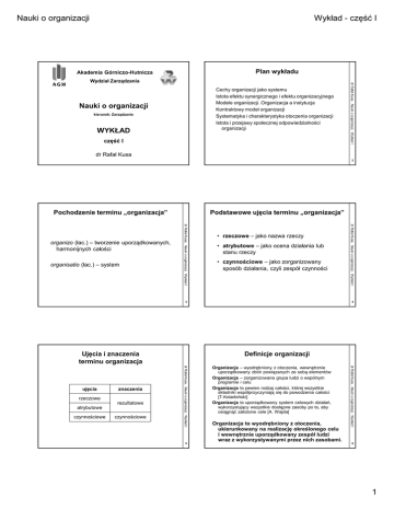 Nauki o organizacji Wykład - część I Plan wykładu Akademia Górniczo-Hutnicza Cechy organizacji jako systemu Istota efektu synergicznego i efektu organizacyjnego Modele organizacji. Organizacja a instytucja Kontraktowy model organizacji Systematyka i charakterystyka otoczenia organizacji Istota i przejawy społecznej odpowiedzialności organizacji Nauki o organizacji kierunek: Zarządzanie WYKŁAD część I dr Rafał Kusa, Nauki o organizacji, Wykład I Wydział Zarządzania dr Rafał Kusa 2 Pochodzenie terminu „organizacja” • rzeczowe – jako nazwa rzeczy • atrybutowe – jako ocena działania lub stanu rzeczy • czynnościowe – jako zorganizowany sposób działania, czyli zespół czynności 3 rezultatowe atrybutowe czynnościowe czynnościowe 5 Organizacja – wyodrębniony z otoczenia, wewnętrznie uporządkowany zbiór powiązanych ze sobą elementów Organizacja – zorganizowana grupa ludzi o wspólnym programie i celu Organizacja to pewien rodzaj całości, której wszystkie składniki współprzyczyniają się do powodzenia całości [T.Kotarbiński] Organizacja to uporządkowany system celowych działań, wykorzystujący wszystkie dostępne zasoby po to, aby osiągnąć założone cele [A. Wajda] Organizacja to wyodrębniony z otoczenia, ukierunkowany na realizację określonego celu i wewnętrznie uporządkowany zespół ludzi wraz z wykorzystywanymi przez nich zasobami. dr Rafał Kusa, Nauki o organizacji, Wykład I rzeczowe dr Rafał Kusa, Nauki o organizacji, Wykład I znaczenia 4 Definicje organizacji Ujęcia i znaczenia terminu organizacja ujęcia dr Rafał Kusa, Nauki o organizacji, Wykład I organisatio (łac.) – system dr Rafał Kusa, Nauki o organizacji, Wykład I organizo (łac.) – tworzenie uporządkowanych, harmonijnych całości Podstawowe ujęcia terminu „organizacja” 6 1 Nauki o organizacji Wykład - część I Organizacja a instytucja Instytucjonalizacja to proces tworzenia i wprowadzanie wzorców działań dla utrwalenia celów i struktur całości organizacyjnych System to zestaw składników, między którymi zachodzą wzajemne oddziaływania (interakcje) i gdzie każdy składnik jest połączony z każdym innym bezpośrednio lub pośrednio. Systemy konkretne – występują w nim co najmniej 2 składniki o charakterze materialnym (np. maszyna) Systemy abstrakcyjne – w ich skład wchodzą tylko pojęcia (np. teoria naukowa) 7 8 Organizacja jako system • • • • • • organizacje są systemami otwartymi, organizacje są uporządkowanymi systemami społeczno-technicznymi, organizacje mają budowę hierarchiczną, systemy organizacyjne mają zdolność doskonalenia się, systemy organizacyjne cechuje ekwifinalność, systemy organizacyjne charakteryzuje duża zmienność w czasie i zdolność do osiągania względnie stałych stanów równowagi dynamicznej 9 Systemowe spojrzenie na organizację (I) dr Rafał Kusa, Nauki o organizacji, Wykład I Organizacja w ujęciu systemowym to zbiór powiązanych ze sobą zasobów ludzkich i rzeczowych, posiadających cel i wewnętrzną strukturę. Cechy organizacji jako systemów dr Rafał Kusa, Nauki o organizacji, Wykład I Organizacja to konkretny otwarty system społeczno-techniczny ukierunkowany na uświadomione i sformułowane cele działania oraz mający określony sposób uporządkowania. [B. Kożuch] dr Rafał Kusa, Nauki o organizacji, Wykład I kryterium rozróżnienia instytucji i organizacji: powtarzalność podstawowej funkcji stałej dr Rafał Kusa, Nauki o organizacji, Wykład I Instytucja to rodzaj organizacji, której podstawowe funkcje stałe podlegają utrwaleniu przez stałe powtarzanie (odnawianie) Systemy 10 Systemowe spojrzenie na organizację (II) Tt – przedsiębiorstwo jako system transformujący („czarna skrzynka”) Y – wektor wielkości wyjściowych Y = [y1, y2, y3, … yn] y – wielkości wyjściowe (outputs) X – wektor wielkości wejściowych X = [x1, x2, x3, … xn] x – wielkości wejściowe (inputs) dr Rafał Kusa, Nauki o organizacji, Wykład I dr Rafał Kusa, Nauki o organizacji, Wykład I Yt = Tt (X, t) t – czas 11 12 2 Nauki o organizacji Wykład - część I Systemowe spojrzenie na organizację (III) Równowaga organizacyjna Sytuacyjne podejście do organizacji Efekt: sytuacyjne dyrektywy praktyczne dotyczące struktur, metod, stylów jakie należy stosować w konkretnej sytuacji Efekt synergiczny Efektywność – stosunek efektów do nakładów efektywność = efekty / nakłady Rentowność – stosunek zysku do kosztów rentowność = zysk / koszty w języku angielskim effectiveness oznacza skuteczność, natomiast efektywności i sprawności odpowiada termin efficiency 16 Efekt organizacyjny 17 Efekt organizacyjny – efekt osiągany dzięki połączeniu podmiotów osobowych i aparaturowych nośników działań trwałymi więziami organizacyjnymi w jedną zorganizowaną całość o wspólnym członie kierowniczym. dr Rafał Kusa, Nauki o organizacji, Wykład I dr Rafał Kusa, Nauki o organizacji, Wykład I różnica dodatnia synergia różnica ujemna dyssynergia Skuteczność – miara stopnia realizacji zamierzonych efektów (celów) Sprawność – skuteczność, efektywność i korzystność 15 Efekt synergiczny EFsyn – różnica między łącznym efektem EF działania zbioru podmiotów Pi, między którymi zachodzi współdziałanie V, a sumą efektów jednostkowych ef, jakie mogłyby te podmioty osiągnąć działając w pojedynkę, a więc nie wchodząc we współdziałanie 14 dr Rafał Kusa, Nauki o organizacji, Wykład I Podstawowy problem: funkcjonowanie organizacji w różnych warunkach [A.K. Koźmiński, K. Obłój] Ocena sprawności działań dr Rafał Kusa, Nauki o organizacji, Wykład I Podejście sytuacyjne koncentruje się na zależnościach między organizacjami i ich otoczeniem. Organizacje gospodarcze osiągają równowagę gdy maksymalizują ekonomiczną nadwyżkę. Organizacje nie nastawione na osiąganie zysku 
