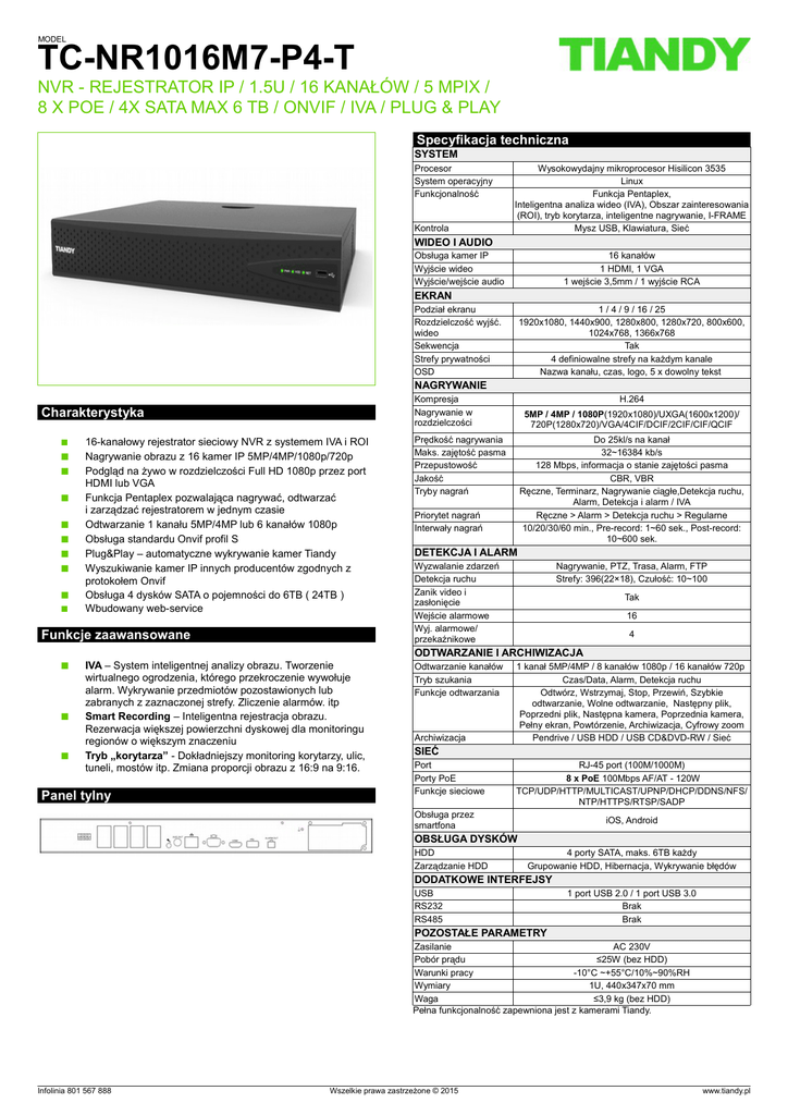MODEL TC-NR1016M7-P4-T NVR - REJESTRATOR IP / 1.5U / 16 KANAŁÓW / 5 MPIX / 8 X POE / 4X SATA MAX 6 TB / ONVIF / IVA / PLUG & PLAY Specyfikacja techniczna SYSTEM Procesor System operacyjny Funkcjonalność Kontrola Wysokowydajny mikroprocesor Hisilicon 3535 Linux Funkcja Pentaplex, Inteligentna analiza wideo (IVA), Obszar zainteresowania (ROI), tryb korytarza, inteligentne nagrywanie, I-FRAME Mysz USB, Klawiatura, Sieć WIDEO I AUDIO Obsługa kamer IP Wyjście wideo Wyjście/wejście audio 16 kanałów 1 HDMI, 1 VGA 1 wejście 3,5mm / 1 wyjście RCA EKRAN Podział ekranu Rozdzielczość wyjść. wideo Sekwencja Strefy prywatności OSD 1 / 4 / 9 / 16 / 25 1920x1080, 1440x900, 1280x800, 1280x720, 800x600, 1024x768, 1366x768 Tak 4 definiowalne strefy na każdym kanale Nazwa kanału, czas, logo, 5 x dowolny tekst NAGRYWANIE Kompresja Nagrywanie w rozdzielczości Charakterystyka 16-kanałowy rejestrator sieciowy NVR z systemem IVA i ROI Nagrywanie obrazu z 16 kamer IP 5MP/4MP/1080p/720p Podgląd na żywo w rozdzielczości Full HD 1080p przez port HDMI lub VGA Funkcja Pentaplex pozwalająca nagrywać, odtwarzać i zarządzać rejestratorem w jednym czasie Odtwarzanie 1 kanału 5MP/4MP lub 6 kanałów 1080p Obsługa standardu Onvif profil S Plug&Play – automatyczne wykrywanie kamer Tiandy Wyszukiwanie kamer IP innych producentów zgodnych z protokołem Onvif Obsługa 4 dysków SATA o pojemności do 6TB ( 24TB ) Wbudowany web-service Funkcje zaawansowane H.264 5MP / 4MP / 1080P(1920x1080)/UXGA(1600x1200)/ 720P(1280x720)/VGA/4CIF/DCIF/2CIF/CIF/QCIF Prędkość nagrywania Maks. zajętość pasma Przepustowość Jakość Tryby nagrań Do 25kl/s na kanał 32~16384 kb/s 128 Mbps, informacja o stanie zajętości pasma CBR, VBR Ręczne, Terminarz, Nagrywanie ciągłe,Detekcja ruchu, Alarm, Detekcja i alarm / IVA Ręczne > Alarm > Detekcja ruchu > Regularne 10/20/30/60 min., Pre-record: 1~60 sek., Post-record: 10~600 sek. Priorytet nagrań Interwały nagrań DETEKCJA I ALARM Wyzwalanie zdarzeń Detekcja ruchu Zanik video i zasłonięcie Wejście alarmowe Wyj. alarmowe/ przekaźnikowe Nagrywanie, PTZ, Trasa, Alarm, FTP Strefy: 396(22×18), Czułość: 10~100 Tak 16 4 ODTWARZANIE I ARCHIWIZACJA IVA – System inteligentnej analizy obrazu. Tworzenie wirtualnego ogrodzenia, którego przekroczenie wywołuje alarm. Wykrywanie przedmiotów pozostawionych lub zabranych z zaznaczonej strefy. Zliczenie alarmów. itp Smart Recording – Inteligentna rejestracja obrazu. Rezerwacja większej powierzchni dyskowej dla monitoringu regionów o większym znaczeniu Tryb „korytarza” - Dokładniejszy monitoring korytarzy, ulic, tuneli, mostów itp. Zmiana proporcji obrazu z 16:9 na 9:16. Panel tylny Odtwarzanie kanałów Tryb szukania Funkcje odtwarzania Archiwizacja 1 kanał 5MP/4MP / 8 kanałów 1080p / 16 kanałów 720p Czas/Data, Alarm, Detekcja ruchu Odtwórz, Wstrzymaj, Stop, Przewiń, Szybkie odtwarzanie, Wolne odtwarzanie, Następny plik, Poprzedni plik, Następna kamera, Poprzednia kamera, Pełny ekran, Powtórzenie, Archiwizacja, Cyfrowy zoom Pendrive / USB HDD / USB CD&DVD-RW / Sieć SIEĆ Port Porty PoE Funkcje sieciowe RJ-45 port (100M/1000M) 8 x PoE 100Mbps AF/AT - 120W TCP/UDP/HTTP/MULTICAST/UPNP/DHCP/DDNS/NFS/ NTP/HTTPS/RTSP/SADP Obsługa przez smartfona iOS, Android OBSŁUGA DYSKÓW HDD Zarządzanie HDD 4 porty SATA, maks. 6TB każdy Grupowanie HDD, Hibernacja, Wykrywanie błędów DODATKOWE INTERFEJSY USB RS232 RS485 1 port USB 2.0 / 1 port USB 3.0 Brak Brak POZOSTAŁE PARAMETRY Zasilanie AC 230V Pobór prądu ≤25W (bez HDD) Warunki pracy -10°C ~+55°C/10%~90%RH Wymiary 1U, 440x347x70 mm Waga ≤3,9 kg (bez HDD) Pełna funkcjonalność zapewniona jest z kamerami Tiandy. Infolinia 801 567 888 Wszelkie prawa zastrzeżone © 2015 www.tiandy.pl