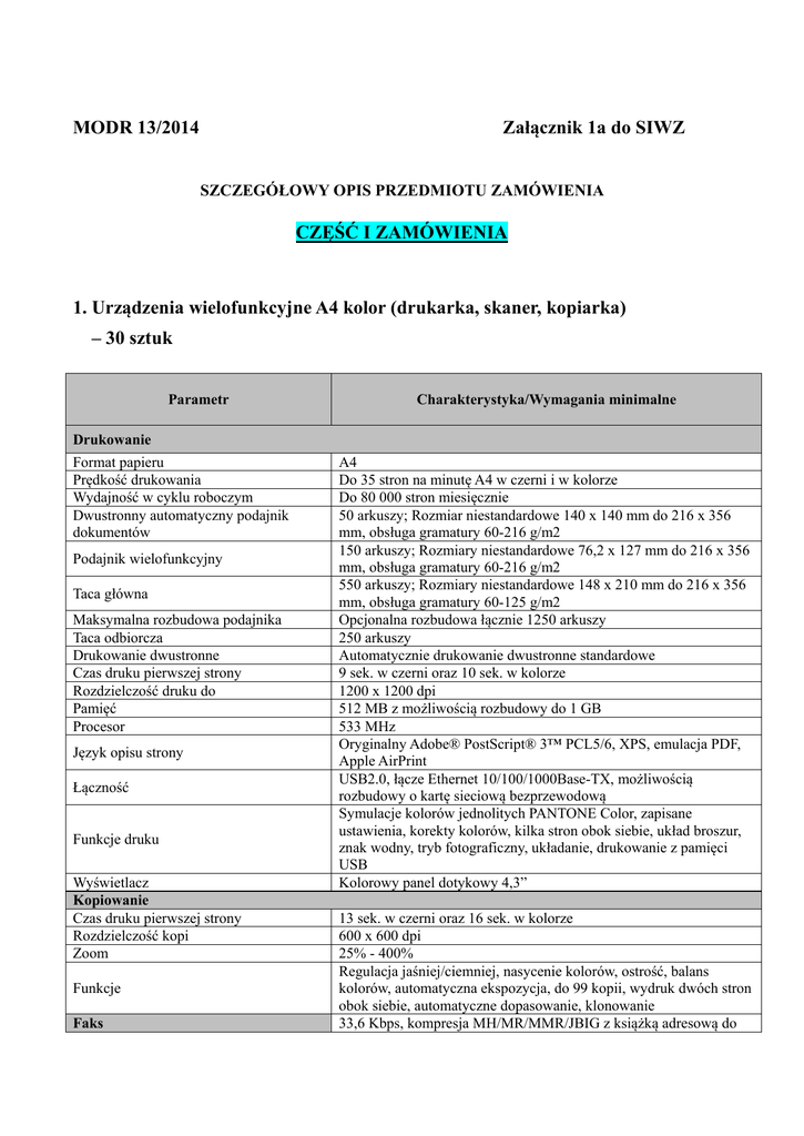 Załącznik 1a do SIWZ MODR 13/2014 SZCZEGÓŁOWY OPIS PRZEDMIOTU ZAMÓWIENIA CZĘŚĆ I ZAMÓWIENIA 1. Urządzenia wielofunkcyjne A4 kolor (drukarka, skaner, kopiarka) – 30 sztuk Parametr Charakterystyka/Wymagania minimalne Drukowanie Format papieru Prędkość drukowania Wydajność w cyklu roboczym Dwustronny automatyczny podajnik dokumentów Podajnik wielofunkcyjny Taca główna Maksymalna rozbudowa podajnika Taca odbiorcza Drukowanie dwustronne Czas druku pierwszej strony Rozdzielczość druku do Pamięć Procesor Język opisu strony Łączność Funkcje druku Wyświetlacz Kopiowanie Czas druku pierwszej strony Rozdzielczość kopi Zoom Funkcje Faks A4 Do 35 stron na minutę A4 w czerni i w kolorze Do 80 000 stron miesięcznie 50 arkuszy; Rozmiar niestandardowe 140 x 140 mm do 216 x 356 mm, obsługa gramatury 60-216 g/m2 150 arkuszy; Rozmiary niestandardowe 76,2 x 127 mm do 216 x 356 mm, obsługa gramatury 60-216 g/m2 550 arkuszy; Rozmiary niestandardowe 148 x 210 mm do 216 x 356 mm, obsługa gramatury 60-125 g/m2 Opcjonalna rozbudowa łącznie 1250 arkuszy 250 arkuszy Automatycznie drukowanie dwustronne standardowe 9 sek. w czerni oraz 10 sek. w kolorze 1200 x 1200 dpi 512 MB z możliwością rozbudowy do 1 GB 533 MHz Oryginalny Adobe® PostScript® 3™ PCL5/6, XPS, emulacja PDF, Apple AirPrint USB2.0, łącze Ethernet 10/100/1000Base-TX, możliwością rozbudowy o kartę sieciową bezprzewodową Symulacje kolorów jednolitych PANTONE Color, zapisane ustawienia, korekty kolorów, kilka stron obok siebie, układ broszur, znak wodny, tryb fotograficzny, układanie, drukowanie z pamięci USB Kolorowy panel dotykowy 4,3” 13 sek. w czerni oraz 16 sek. w kolorze 600 x 600 dpi 25% - 400% Regulacja jaśniej/ciemniej, nasycenie kolorów, ostrość, balans kolorów, automatyczna ekspozycja, do 99 kopii, wydruk dwóch stron obok siebie, automatyczne dopasowanie, klonowanie 33,6 Kbps, kompresja MH/MR/MMR/JBIG z książką adresową do 200 numerów szybkiego wybierania Skanowanie Funkcje Funkcje skanowania formaty plików TWAIN/WIA za pośrednictwem portu USB lub sieci, skanowanie do komputera za pomocą SMB, skanowania do serwera za pomocą FTP, skanowanie do poczty e-mail z obsługą LDAP, skanowanie do pamięci USB, skanowanie WSD JPEG/TIFF/wielostronicowy TIFF/PDF, książka adresowa e-mail (do 100 adresów e-mail, do 10 adresów grupowych e-mail) Materiały eksploatacyjne Dostępny z urządzeniem toner na ponad 3000 stron czarno-białych oraz 2000 stron kolorowych przy 5% pokryciu. Urządzenie ma być wyposażone w toner z oddzielnym bębnem Gwarancja 24 miesiące 2. Urządzenie wielofunkcyjne A4 czarno-białe (drukarka, skaner, kopiarka) – 85 sztuk Parametr Drukowanie Format papieru Prędkość drukowania Wydajność w cyklu roboczym Dwustronny automatyczny podajnik dokumentów Podajnik wielofunkcyjny Maksymalna rozbudowa podajników Taca odbiorcza Drukowanie dwustronne Druk Czas druku pierwszej strony Rozdzielczość Pamięć Procesor Język opisu strony Łączność Funkcje druku Zoom Kopiowanie Czas druku pierwszej Charakterystyka/Wymagania minimalne A4 Do 45 stron na minutę A4 Do 110 000 stron miesięcznie 60 arkuszy; Rozmiar niestandardowy 140 x 140 mm do 216 x 356 mm 150 arkuszy; Rozmiary niestandardowe 76 x 127 mm do 216 x 356 mm Opcjonalna rozbudowa do 2350 arkuszy 250 arkuszy Automatyczne drukowanie dwustronne standardowe Minimum 6,5 sekundy Do 1200 x 1200 dpi 1024 MB 525 MHz emulacja PCL6/5e, kompatybilność z PostScript 3™, emulacja PDF, Apple AirPrint USB 2.0, łącze Ethernet 10/100/1000Base-TX Automatyczny druk dwustronny, niestandardowy rozmiar strony, tryb oszczędzania tonera, bezpieczny wydruk, znaki wodne, wiele stron obok siebie, dopasowanie do strony Powiększanie/pomniejszanie, drukowanie broszur, drukowanie z pamięci USB Minimum 8,5 sekundy strony Rozdzielczość kopii Funkcje kopiowania Faks Skanowanie Do 600 x 600 dpi Automatyczny druk dwustronny, powiększanie/pomniejszanie, ukrywanie tła, wiele stron obok siebie, kopiowanie książek, kopiowanie dowodu osobistego (tylko z szyby) 33,6 Kbps, kompresja MH/MR/MMR/JBIG Skanowanie do poczty email (do 100 wpisów w książce adresowej), skanowanie do komputera poprzez sieć, skanowanie na serwer FTP lub SMB, bezpośrednie Funkcje skanowanie do aplikacji, w tym programów OCR (dołączone oprogramowanie), skanowanie do urządzeń USB Inne funkcje Skanowanie w kolorze, format plików; JPG, PDF, TIFF, wielostronicowy TIFF Materiały eksploatacyjne Dostępny z urządzeniem toner na ponad 5000 stron. Urządzenie ma być wyposażone w toner rozłączony z bębnem. Gwarancja 24 miesiące 3. Oprogramowanie do monitorowania stanu drukarek Charakterystyka/Wymagania minimalne Funkcje - Automatyczne wykrywanie oferowanych urządzeń w sieci lokalnej - Odczyt danych identyfikujących urządzenia - Odczyt stanów liczników oraz poziomów tonerów - Powiadamianie drogą e-mail o zdarzeniach polegających na wymianie toneru oraz cykliczne wysyłanie raportów o stanach liczników i poziomach tonerów, poszczególnych maszyn w lokalizacjach - Oprogramowanie ma wysyłać zebrane informacje na podany adres poczty elektronicznej - Oprogramowanie ma współdziałać z urządzeniami opisanymi w pkt. 1 i 2 niniejszego załącznika oraz Xerox Work Centre 3315 Xerox Work Centre 6505 Xerox Phaser 3600DN