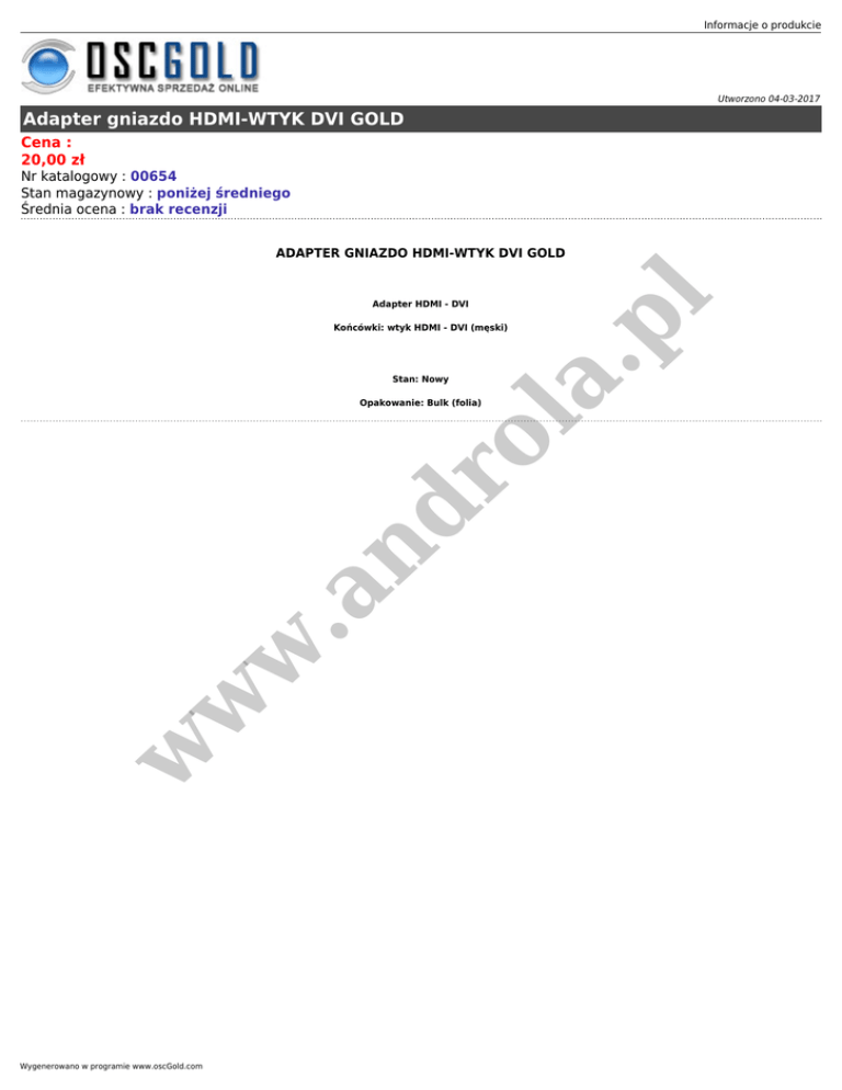 Informacje o produkcie Utworzono 04-03-2017 Adapter gniazdo HDMI-WTYK DVI GOLD Cena : 20,00 zł Nr katalogowy : 00654 Stan magazynowy : poniżej średniego Średnia ocena : brak recenzji Adapter HDMI - DVI Stan: Nowy la Końcówki: wtyk HDMI - DVI (męski) .p l ADAPTER GNIAZDO HDMI-WTYK DVI GOLD w w w .a nd ro Opakowanie: Bulk (folia) Wygenerowano w programie www.oscGold.com
