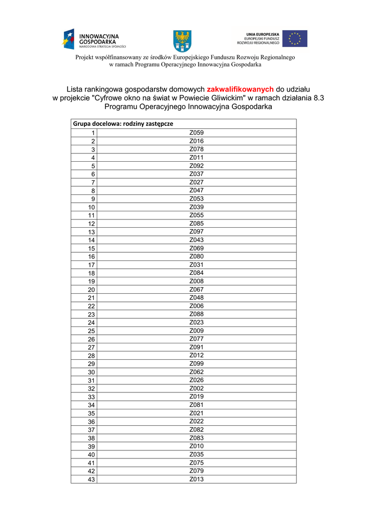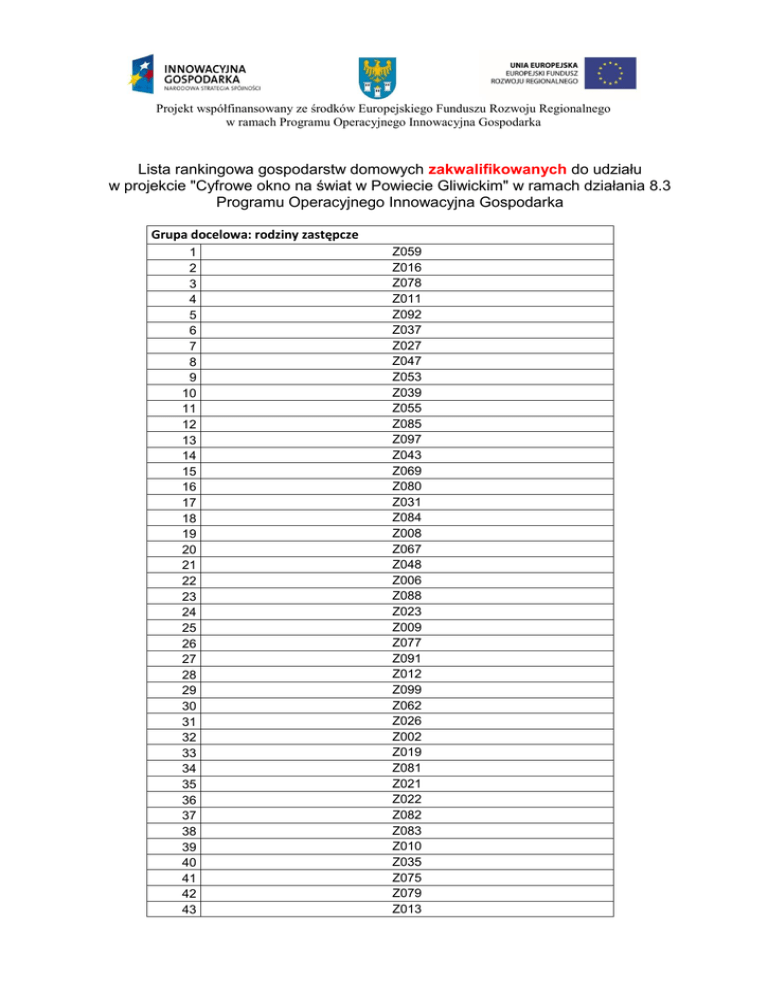 Projekt współfinansowany ze środków Europejskiego Funduszu Rozwoju Regionalnego w ramach Programu Operacyjnego Innowacyjna Gospodarka Lista rankingowa gospodarstw domowych zakwalifikowanych do udziału w projekcie "Cyfrowe okno na świat w Powiecie Gliwickim" w ramach działania 8.3 Programu Operacyjnego Innowacyjna Gospodarka Grupa docelowa: rodziny zastępcze 1 2 3 4 5 6 7 8 9 10 11 12 13 14 15 16 17 18 19 20 21 22 23 24 25 26 27 28 29 30 31 32 33 34 35 36 37 38 39 40 41 42 43 Z059 Z016 Z078 Z011 Z092 Z037 Z027 Z047 Z053 Z039 Z055 Z085 Z097 Z043 Z069 Z080 Z031 Z084 Z008 Z067 Z048 Z006 Z088 Z023 Z009 Z077 Z091 Z012 Z099 Z062 Z026 Z002 Z019 Z081 Z021 Z022 Z082 Z083 Z010 Z035 Z075 Z079 Z013 44 45 46 47 48 49 50 51 52 53 54 55 56 57 58 59 60 61 62 63 64 65 66 67 68 69 70 71 72 73 74 75 76 77 78 79 80 81 82 83 84 85 86 87 88 89 90 91 92 93 94 95 96 97 98 Z094 Z066 Z058 Z045 Z046 Z087 Z001 Z029 Z040 Z030 Z007 Z018 Z049 Z061 Z071 Z056 Z093 Z044 Z017 Z086 Z064 Z034 Z063 Z025 Z028 Z020 Z096 Z042 Z095 Z070 Z038 Z090 Z050 Z032 Z014 Z074 Z036 Z098 Z051 Z003 Z054 Z004 Z005 Z052 Z041 Z073 Z057 Z033 Z076 Z060 Z089 Z068 Z072 Z065 Z024 Grupa docelowa: osoby niepełnosprawne 1 2 3 4 5 6 7 8 9 10 11 12 13 14 15 16 17 18 19 20 21 22 23 24 25 26 27 28 29 30 31 32 33 34 35 36 37 38 39 40 41 42 43 44 45 46 47 48 49 50 51 52 53 54 N031 N035 N039 N073 N033 N037 N022 N104 N050 N112 N103 N052 N034 N109 N003 N113 N024 N016 N042 N020 N083 N066 N012 N075 N030 N085 N005 N044 N038 N010 N078 N009 N107 N100 N061 N056 N004 N023 N011 N036 N071 N021 N080 N081 N087 N079 N084 N074 N077 N047 N060 N114 N065 N045 55 56 57 58 59 60 61 62 63 64 65 66 67 68 69 70 71 72 73 74 N072 N007 N028 N002 N032 N017 N029 N015 N101 N105 N058 N018 N094 N088 N027 N089 N054 N026 N006 N019 Grupa docelowa: Dzieci/młodzieży ze szkół gimnazjalnych i ponadgimnazjalnych z bardzo dobrymi wynikami w nauce U001 U003 U006 U004 U005 U007 U002 1 2 3 4 5 6 7 Grupa docelowa: rodzinne domy dziecka 1 2 R001 R002 Osoby znajdujące się na powyższej liście rankingowej zapraszamy - zgodnie z zapisami Regulaminu rekrutacji i udziału w projekcie pn. „Cyfrowe okno na świat w Powiecie Gliwickim“ - do podpisania umowy uczestnictwa w projekcie w Starostwie Powiatowym w Gliwicach, w Wydziale Rozwoju i Promocji pok. 366 do dnia 11 września br. w godzinach urzędowania, czyli: od poniedziałku do środy 7.30 – 15.30, czwartek 7.30 – 17.30, piątek 7.30 – 13.30. W przypadkach losowych osobami wyznaczonymi do kontaktu są: p. Ewa Hajduk – koordynator projektu „Cyfrowe okno na świat w Powiecie Gliwickim”, tel. 32 230 68 64, e-mail: [email protected] oraz p. Szymon Błaszczyk – specjalista ds. projektu tel. 32 338 37 18, e-mail: [email protected]. Lista rezerwowa gospodarstw domowych, które przeszły pozytywną weryfikację pod względem formalnym niezakwalifikowanych (z powodu braku miejsc) do udziału w projekcie "Cyfrowe okno na świat w Powiecie Gliwickim" w ramach działania 8.3 Programu Operacyjnego Innowacyjna Gospodarka Grupa docelowa: osoby niepełnosprawne 1 2 3 4 5 6 7 8 9 10 11 12 13 14 15 16 17 18 19 N048 N041 N008 N086 N014 N025 N091 N067 N051 N053 N001 N055 N090 N013 N082 N110 N092 N099 N040 Lista gospodarstw domowych niezakwalifikowanych z przyczyn formalnych do udziału w projekcie "Cyfrowe okno na świat w Powiecie Gliwickim" w ramach działania 8.3 Programu Operacyjnego Innowacyjna Gospodarka LP numer nadany podczas procesu rekrutacji 1 2 3 4 5 6 7 8 9 10 11 12 13 14 15 16 17 18 19 20 21 22 N043 N046 N049 N057 N059 N062 N063 N064 N068 N069 N070 N076 N093 N095 N096 N097 N098 N102 N106 N108 N111 Z015