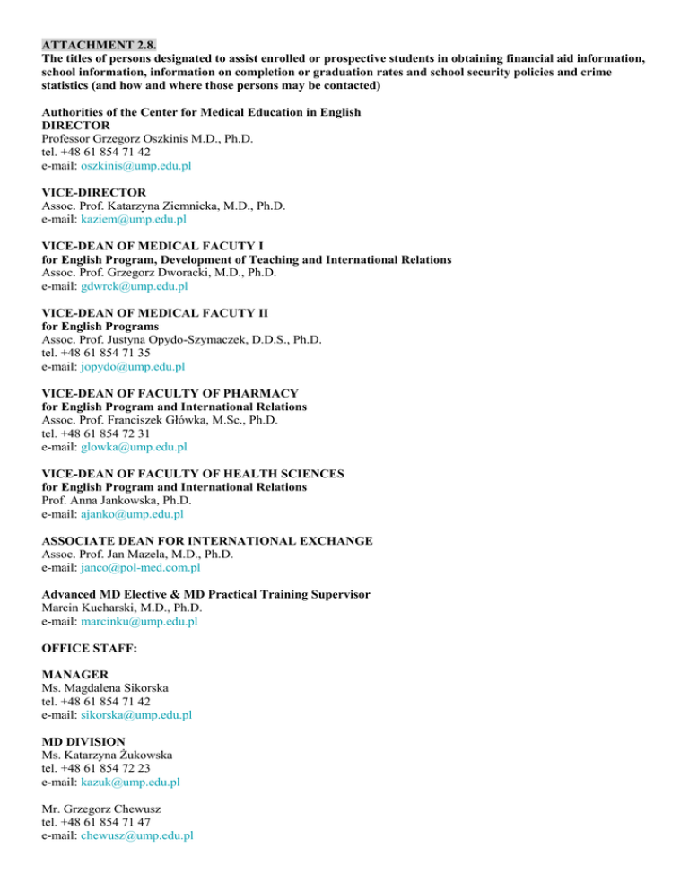 ATTACHMENT 2.8. The titles of persons designated to assist enrolled or prospective students in obtaining financial aid information, school information, information on completion or graduation rates and school security policies and crime statistics (and how and where those persons may be contacted) Authorities of the Center for Medical Education in English DIRECTOR Professor Grzegorz Oszkinis M.D., Ph.D. tel. +48 61 854 71 42 e-mail: [email protected] VICE-DIRECTOR Assoc. Prof. Katarzyna Ziemnicka, M.D., Ph.D. e-mail: [email protected] VICE-DEAN OF MEDICAL FACUTY I for English Program, Development of Teaching and International Relations Assoc. Prof. Grzegorz Dworacki, M.D., Ph.D. e-mail: [email protected] VICE-DEAN OF MEDICAL FACUTY II for English Programs Assoc. Prof. Justyna Opydo-Szymaczek, D.D.S., Ph.D. tel. +48 61 854 71 35 e-mail: [email protected] VICE-DEAN OF FACULTY OF PHARMACY for English Program and International Relations Assoc. Prof. Franciszek Główka, M.Sc., Ph.D. tel. +48 61 854 72 31 e-mail: [email protected] VICE-DEAN OF FACULTY OF HEALTH SCIENCES for English Program and International Relations Prof. Anna Jankowska, Ph.D. e-mail: [email protected] ASSOCIATE DEAN FOR INTERNATIONAL EXCHANGE Assoc. Prof. Jan Mazela, M.D., Ph.D. e-mail: [email protected] Advanced MD Elective & MD Practical Training Supervisor Marcin Kucharski, M.D., Ph.D. e-mail: [email protected] OFFICE STAFF: MANAGER Ms. Magdalena Sikorska tel. +48 61 854 71 42 e-mail: [email protected] MD DIVISION Ms. Katarzyna Żukowska tel. +48 61 854 72 23 e-mail: [email protected] Mr. Grzegorz Chewusz tel. +48 61 854 71 47 e-mail: [email protected] ADVANCED MD PROGRAM Mr. Michał Pasikiewicz tel. +48 61 854 71 47 e-mail: [email protected] Ms. Daria Stekiel - responsible for 3rd and 4th year students and graduates of 2015 and 2016 of Advanced MD Program substituted by Ms. Weronika Macków tel. +48 61 854 71 43 e-mail: [email protected] MD PROGRAM for high school graduates Ms. Joanna Zalewska - responsible for the 1st and 2nd year students tel. +48 61 854 71 44 e-mail: [email protected] Ms. Aneta Szymanska - responsible for 3rd and 4th year students of MD Program high school graduates, as well as graduates of Advanced MD Program tel. +48 61 854 71 46 e-mail: [email protected] Ms. Agata Bartoszewska - responsible for 5th and 6th year students and for graduates of the MD Program high school graduates tel. +48 61 854 71 45 e-mail: [email protected] DDS PROGRAM Ms. Ewa Stodolna tel./fax +48 61 854 71 35 e-mail: [email protected] Ms. Anna Tomczak tel. +48 61 854 72 24 e-mail: [email protected] PHARM.D. PROGRAM AND PHYSIOTHERAPY PROGRAM Mr. Paweł Kosacki tel. +48 61 854 72 31 e-mail: [email protected] FINANCIAL MATTERS Ms. Karolina Rogalska (Advanced MD, DDS) tel. +48 61 854 72 21 e-mail: [email protected] Ms. Beata Matyszewska (MD, PharmD, Physiotherapy) tel. +48 61 854 72 33 e-mail: [email protected] NEW YORK OFFICE Mr Andrew Wiktor – Bursar tel. 001 914-277-2300 e-mail: [email protected] Ms. Renata Decowska - Financial Aid Officer tel. 001 914-277-2300 e-mail: [email protected] The person designated to assist enrolled or prospective students in obtaining information on school security policies and crime statistics Mr. Rafał Staszewski, Ph.D. – Vice Chancellor tel. +48 61 854 62 45 e-mail: [email protected]