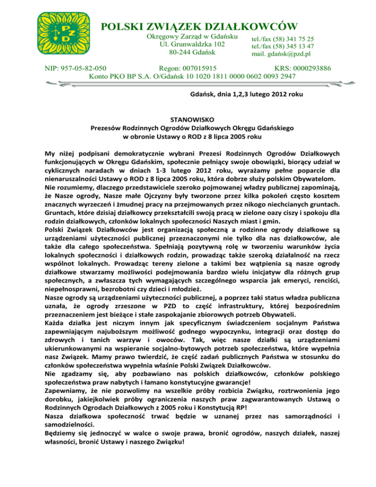 POLSKI ZWIĄZEK DZIAŁKOWCÓW Okręgowy Zarząd w Gdańsku Ul. Grunwaldzka 102 80-244 Gdańsk tel./fax (58) 341 75 25 tel./fax (58) 345 13 47 mail. gdań[email protected] NIP: 957-05-82-050 Regon: 007015915 KRS: 0000293886 Konto PKO BP S.A. O/Gdańsk 10 1020 1811 0000 0602 0093 2947 Gdaosk, dnia 1,2,3 lutego 2012 roku STANOWISKO Prezesów Rodzinnych Ogrodów Działkowych Okręgu Gdaoskiego w obronie Ustawy o ROD z 8 lipca 2005 roku My niżej podpisani demokratycznie wybrani Prezesi Rodzinnych Ogrodów Działkowych funkcjonujących w Okręgu Gdaoskim, społecznie pełniący swoje obowiązki, biorący udział w cyklicznych naradach w dniach 1-3 lutego 2012 roku, wyrażamy pełne poparcie dla nienaruszalności Ustawy o ROD z 8 lipca 2005 roku, która dobrze służy polskim Obywatelom. Nie rozumiemy, dlaczego przedstawiciele szeroko pojmowanej władzy publicznej zapominają, że Nasze ogrody, Nasze małe Ojczyzny były tworzone przez kilka pokoleo często kosztem znacznych wyrzeczeo i żmudnej pracy na przejmowanych przez nikogo niechcianych gruntach. Gruntach, które dzisiaj działkowcy przekształcili swoją pracą w zielone oazy ciszy i spokoju dla rodzin działkowych, członków lokalnych społeczności Naszych miast i gmin. Polski Związek Działkowców jest organizacją społeczną a rodzinne ogrody działkowe są urządzeniami użyteczności publicznej przeznaczonymi nie tylko dla nas działkowców, ale także dla całego społeczeostwa. Spełniają pozytywną rolę w tworzeniu warunków życia lokalnych społeczności i działkowych rodzin, prowadząc także szeroką działalnośd na rzecz wspólnot lokalnych. Prowadząc tereny zielone a takimi bez wątpienia są nasze ogrody działkowe stwarzamy możliwości podejmowania bardzo wielu inicjatyw dla różnych grup społecznych, a zwłaszcza tych wymagających szczególnego wsparcia jak emeryci, renciści, niepełnosprawni, bezrobotni czy dzieci i młodzież. Nasze ogrody są urządzeniami użyteczności publicznej, a poprzez taki status władza publiczna uznała, że ogrody zrzeszone w PZD to częśd infrastruktury, której bezpośrednim przeznaczeniem jest bieżące i stałe zaspokajanie zbiorowych potrzeb Obywateli. Każda działka jest niczym innym jak specyficznym świadczeniem socjalnym Paostwa zapewniającym najuboższym możliwośd godnego wypoczynku, integracji oraz dostęp do zdrowych i tanich warzyw i owoców. Tak, więc nasze działki są urządzeniami ukierunkowanymi na wspieranie socjalno-bytowych potrzeb społeczeostwa, które wypełnia nasz Związek. Mamy prawo twierdzid, że częśd zadao publicznych Paostwa w stosunku do członków społeczeostwa wypełnia właśnie Polski Związek Działkowców. Nie zgadzamy się, aby pozbawiano nas polskich działkowców, członków polskiego społeczeostwa praw nabytych i łamano konstytucyjne gwarancje! Zapewniamy, że nie pozwolimy na wszelkie próby rozbicia Związku, roztrwonienia jego dorobku, jakiejkolwiek próby ograniczenia naszych praw zagwarantowanych Ustawą o Rodzinnych Ogrodach Działkowych z 2005 roku i Konstytucją RP! Nasza działkowa społecznośd trwad będzie w uznanej przez nas samorządności i samodzielności. Będziemy się jednoczyd w walce o swoje prawa, bronid ogrodów, naszych działek, naszej własności, bronid Ustawy i naszego Związku! Wszak nie jesteśmy „ciemną masą”, ale dobrze zorganizowaną całością pełniącą istotne i ważne funkcje proekologiczne, prozdrowotne, integracyjne i społeczne. Działkowcy Okręgu Gdaoskiego będą wspierad działania podejmowane przez Krajową Radę PZD w obronie działkowców, ogrodów, Związku i Ustawy o ROD z 2005 roku. Apelujemy, zostawcie ogrody samym działkowcom i ich organizacji Polskiemu Związkowi Działkowców, która sprawdziła się w swoich działaniach. Pozwólcie nam w spokoju gospodarzyd i pracowad na naszych działkach korzystając z praw nabytych i cieszyd się z osiągnięd ogrodnictwa działkowego w Polsce, któremu nic już nie będzie zagrażad! Podpisem swoim pod niniejszym stanowiskiem wyrażamy wolę utrzymania takiego modelu ogrodnictwa działkowego, jaki jest realizowany już od 114 lat na ziemiach polskich. Ustawa o Rodzinnych Ogrodach Działkowych z 8 lipca 2005 roku dobrze służy nam i społeczeostwu a działkowcy bardzo wysoko ją cenią. W obronie i nienaruszalności jej zapisów swoje podpisy złożyło ponad 620 tysięcy Obywateli i najwyższy czas, by wreszcie szeroko pojęta władza publiczna to zauważyła. Niniejsze stanowisko postanawiamy skierowad do: - Prezydenta RP Bronisława Komorowskiego, - Prezesa Rady Ministrów Donalda Tuska, - Marszałka Sejmu RP Ewy Kopacz, - Marszałka Senatu RP Bogdana Borusewicza, - Prezesa Trybunału Konstytucyjnego Andrzeja Rzeplioskiego, - Sędziów Trybunału Konstytucyjnego, - Pierwszego Prezesa Sądu Najwyższego Stanisława Dąbrowskiego, - Klubów Parlamentarnych: Platformy Obywatelskiej, Prawa i Sprawiedliwości, Sojuszu Lewicy Demokratycznej, Polskiego Stronnictwa Ludowego, Ruchu Palikota i Solidarnej Polski. oraz przekazad do wiadomości Prezesa Polskiego Związku Działkowców Eugeniusza Kondrackiego. Z działkowym pozdrowieniem Pod niniejszym stanowiskiem swoje podpisy złożyło 175 uczestników narady z udziałem Prezesa OZ PZD Czesława Smoczyoskiego, Przewodniczącego Okręgowej Komisji Rewizyjnej PZD w Gdaosku Bogusława Dąbrowskiego i Przewodniczącego Okręgowej Komisji Rozjemczej PZD w Gdaosku Józefa Pisarskiego oraz pracowników Biura OZ PZD w Gdaosku. 2 0 2 l 0 0 / 2 0 1 20 g i 2 t F A I @oot Listapoparqia podjetego przezPreresdw dlaStanowiska Rodzinnvch Ogroddw Dztalkowych OkrqBu Gdadskiego blorl.ychudrlalwnaradzle w dniach1,3lutego2012r, w obronieustaw zdniaS lipca 2005r. o rodzinnych ogfodarh dziatkowych tp. r lmieiNazwisko M o .t a, ^ /{ MieJscowoSa la{*Alra knu,-^,L 4 4""t/"7o., 5 /l /t /1 /-,t/ '/fzttpa('Eeduns€ P-n1* " 4JLl"-_ 9c/L 6/c,cy (,La /e#e Z-'o/,-r't //tt n /{.*, B^.1*,*] 'd":**",fu Jd*/ &n .