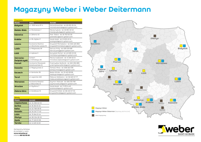 Magazyny Weber i Weber Deitermann Magazyny Miasto Adres Kontakt Białystok ul . 1000 lecia PP 4 Michał Brzeziński ∙ tel. 85 874 95 04 [email protected] Bielsko-Biała ul. Montażowa 7 Maciej Cybula ∙ tel. 33 810 33 53 [email protected] Katowice ul. Żeliwna 43 Piotr Tokarz ∙ tel. 32 753 50 30 [email protected] Kraków ul. Płk. Dąbka 17 Jacek Gażeł ∙ tel. 12 653 45 14 [email protected] Leszno Hurtownia Peamco ul. Obrońców Lwowa 19 Krzysztof Michalewicz ∙ tel. 602 420 893 [email protected] Lublin ul. Mełgiewska 9F Dariusz Piróg ∙ tel. 606 109 681 [email protected] Łódź ul. Łąkowa 11 Korzybski Michał ∙ tel. 42 639 53 30 [email protected] Cerkam Ostrowiec Świętokrzyski ul. Kilińskiego 28 Hurtownia Maszewski Poznań Maciej Czajkowski ∙ tel. 41 249 50 13 [email protected] Rzeszów ul. Magazynowa 3 Tomasz Miras ∙ tel. 508 322 578 [email protected] Szczecin ul. Santocka 39 Beata Górska ∙ tel. 91 453 08 86 [email protected] Toruń ul. Legionów 222 Mateusz Kotkiewicz ∙ tel. 56 623 57 77 [email protected] Warszawa Hurtownia Kwapisz ul. Bieżuńska 1A Szymon Walczak ∙ tel. 606 109 748 [email protected] Wrocław ul. Mydlana 7 Jacek Kozak ∙ tel. 71 375 14 40 [email protected] Zielona Góra ul. Działkowa 19 Krzysztof Królak∙ tel. 68 453 57 55 [email protected] Dziadoszańska 10 Koszalin Olsztyn Szczecin Białystok Toruń Poznań Przemysław Redlarski ∙ tel. 602 296 889 [email protected] Zielona Góra Warszawa Leszno Kalisz Łódź Lubin Lublin Wrocław Opole Częstochowa Składy Miasto Kontakt Częstochowa Gorlice Kalisz Koszalin Lubin Olsztyn Opole Tarnów tel. 34 366 62 05 Katowice tel. 18 353 61 04 tel. 62 768 08 18 Magazyn Weber tel. 94 347 77 40 Magazyn Weber Dieterman (zaprawy techniczne) tel. 76 844 16 44 tel. 89 534 28 50 tel. 77 453 10 99 tel. 14 629 50 81 Zachęcamy Państwa do kontaktu z nami: www.netweber.pl infolinia 801 62 00 00 Skład magazynowy Kraków Tarnów Bielsko-Biała Gorlice Rzeszów