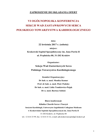 ZAPROSZENIE DO SKŁADANIA OFERT VI OGÓLNOPOLSKA KONFERENCJA SEKCJI WAD ZASTAWKOWYCH SERCA POLSKIEGO TOWARZYSTWA KARDIOLOGICZNEGO data: 22 kwietnia 2017 r. (sobota) miejsce: Krakowski Szpital Specjalistyczny im. Jana Pawła II ul. Prądnicka 80, 31-202 Kraków Organizator: Sekcja Wad Zastawkowych Serca Polskiego Towarzystwa Kardiologicznego Komitet Organizacyjny: Dr hab. n. med. Monika Komar Prof. dr hab. n. med. Piotr Podolec Dr hab. n. med. Lidia Tomkiewicz-Pająk Dr n. med. Bartosz Sobień Biuro konferencji: Klinika Chorób Serca i Naczyń Instytut Kardiologii, Uniwersytet Jagielloński Collegium Medicum w Krakowskim Szpitalu Specjalistycznym im. Jana Pawła II 31-202 Kraków, ul. Prądnicka 80 tel.: 12 614 33 99, fax: 12 614 33 32, e-mail: [email protected] 1 Szanowni Państwo, Jako Komitet Organizacyjny VI Ogólnopolskiej Konferencji Sekcji Wad Zastawkowych Serca Polskiego Towarzystwa Kardiologicznego („Konferencja”), zamierzamy powierzyć organizację ww. konferencji profesjonalnej firmie z odpowiednim doświadczeniem w organizacji podobnych wydarzeń. Do głównych zadań firmy odpowiedzialnej za zorganizowanie Konferencji („Wykonawca”) _ należeć będzie: 1. Nagłośnienie informacji o Konferencji (strona internetowa, fachowe czasopisma medyczne, media); 2. Przygotowanie, druk i rozesłanie komunikatów oraz zaproszeń na konferencję wraz z formularzami rejestracyjnymi; 3. Przygotowanie obiektu, sali wykładowej dla ok. 400 osób z całkowitą obsługą multimedialną oraz powierzchni wystawowej dla firm z możliwością ustawienia zróżnicowanych stoisk wystawienniczych; 4. Przygotowanie drugiej sali wykładowej dla ok. 150 osób z całkowitą obsługą multimedialną oraz powierzchni wystawowej dla firm z możliwością ustawienia zróżnicowanych stoisk wystawienniczych na potrzeby przygotowania i organizacji warsztatów echokardiograficznych dla uczestników ww. Konferencji; 5. Zorganizowanie zakwaterowania oraz kolacji dla ok. 30 VIP-ów PTK - Członkowie Zarządu Głównego, Przewodniczący Sekcji, wybitni Eksperci; 6. Zorganizowanie profesjonalnej recepcji Konferencji w miejscu jej odbywania; 7. Rejestracja uczestników Konferencji; 8. Przygotowanie do druku oraz wydrukowanie programu Konferencji, zaprojektowanie i wykonanie imiennych identyfikatorów dla uczestników Konferencji, zaprojektowanie i wykonanie imiennych certyfikatów dla uczestników Konferencji; 9. Zapewnienie profesjonalnej obsługi technicznej sesji, które odbędą się podczas Konferencji (nagłośnienie sal, ekrany, projektory multimedialne, odpowiedni sprzęt komputerowy); 10. Przygotowanie profesjonalnych transmisji multimedialnych (przekaz audio i video) z 2 sal zabiegowych (sali hybrydowej i kardiochirurgicznej sali operacyjnej) na obydwie sale wykładowe; 11. Przygotowanie miejsca/pokoju, w którym wykładowcy będą mogli przygotować się do wygłoszenia wykładów (centrum obsługi wykładowców - slide room); 2 12. Zapewnienie obsługi cateringowej konferencji (przerwy kawowe + lunch – zgodnie z programem Konferencji); 13. Przygotowanie planu stoisk wystawienniczych oraz profesjonalna pomoc firmom farmaceutycznym i sprzętowym w czasie rozkładania i składania stoisk wystawienniczych; 14. Zorganizowanie zabezpieczenia medycznego oraz ochrony Konferencji; 15. Ubezpieczenie Konferencji; 16. Przygotowanie niezbędnych dokumentów księgowych i współpraca w rozliczeniu Konferencji z Działem Finansowo-Księgowym PTK. Finanse i rozliczenia 1. Środki finansowe na przeprowadzenie Konferencji pozyskiwane od Sponsorów przez Komitet Organizacyjny Konferencji oraz Wykonawcę na przeprowadzenie Konferencji będą gromadzone na odpowiednim subkoncie PTK. 2. Przygotowanie niezbędnych dokumentów księgowych i współpraca w rozliczeniu Konferencji z Działem Finansowo-Księgowym PTK leży po stronie Wykonawcy . 3. Rozliczenie środków finansowych Konferencji zostanie dokonane przez Dział FinansowoKsięgowy PTK. 4. Wypłata honorarium Wykonawcy nastąpi po akceptacji powyższego rozliczenia przez Komitet Organizacyjny Konferencji oraz Zarząd PTK. Oferty, podpisane przez osoby umocowane do reprezentowania oferenta (z podaniem przewidywanego budżetu Konferencji) należy składać w terminie do 1 lutego 2017 roku na adres: Dr hab. n. med. Monika Komar Przewodnicząca Zarządu Sekcji Wad Zastawkowych Serca Polskiego Towarzystwa Kardiologicznego Klinika Chorób Serca i Naczyń Instytut Kardiologii UJ CM Krakowski Szpital Specjalistyczny im. Jana Pawła II ul. Prądnicka 80, 31-202 Kraków kopie ww. ofert można przesyłać drogą elektroniczną na adres e-mail: [email protected] 3 Oferta winna zawierać informacje na temat oferenta dotyczące jego dotychczasowych dokonań i doświadczeń w zakresie organizowania podobnych wydarzeń naukowych. Zalecane jest dołączenie informacji i dokumentów wykazanych poniżej, niezbędnych w przypadku podjęcia decyzji o zawarciu umowy: 1. Oświadczenie o braku konfliktu interesów pomiędzy Wykonawcą, jej przedstawicielami prawnymi oraz osobami reprezentującymi Komitet Organizacyjny Konferencji także biorącymi w niej udział. 2. Firma, siedziba i adres oferenta oraz dokumenty potwierdzające status prawny oferenta (aktualny odpis z właściwego rejestru albo zaświadczenie o wpisie do ewidencji działalności gospodarczej). 3. Koncesje, zezwolenia lub licencje, jeśli przepisy prawa nakładają obowiązek posiadania koncesji, zezwolenia lub licencji na podjęcie działalności gospodarczej w zakresie objętym ofertą. 4. Dokumenty stwierdzające, że osoby, które będą działać przy wykonaniu oferty (umowy) posiadają wymagane przepisami prawa uprawnienia. 5. W przypadku oferentów nie sporządzających bilansu – informacja o obrotach, zyskach oraz zobowiązaniach i należnościach ogółem za okres trzech ostatnich lat obrotowych, a w przypadku, gdy oferent prowadzi działalność krócej aniżeli trzy lata – za cały okres prowadzenia dzia