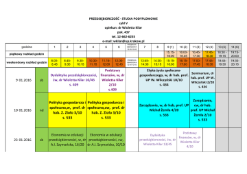 PRZEDSIĘBIORCZOŚĆ - STUDIA PODYPLOMOWE cykl V opiekun: dr Wioletta Kilar pok. 437 tel. 12-662-6255 e-mail: [email protected] godzina 1 2 3 4 5 6 PRZERWA OBIADOWA 12:45-13:45 7 8 piątkowy rozkład godzin weekendowy rozkład godzin 9 01.2016 10 01.2016 23 01.2016 8.008.45 8.459.30 9.3010:15 10.3011.15 11.1512.00 12.0012.45 PRZERWA OBIADOWA 12:45-13:45 13:4514:30 14:3015:15 9 (1) 10 (2) 11 (3) 12 (4) 13 (5) 14 (6) 15.1516:00 16:0016.45 16:4517:30 17.4518.30 18:30 19:15 19:1520:00 15:1516:00 16:1517:00 17:0017:45 17:4518:30 18:4519:30 19:3020:15 sb Podstawy Dydaktyka przedsiębiorczości, finansów, w, dr ćw, dr Wioletta Kilar 10/45 Wioletta Kilar s. 409 2/10 s.409 Etyka życia społecznoSeminarium, dr gospodarczego, w, dr hab. prof. hab. prof. UP W. UP W. Wilczyński 10/10 Wilczyński 2/20 s. 434 s. 434 nd Polityka gospodarcza i Polityka gospodarcza i społeczna,w, prof. dr społeczna,cw, prof. dr hab. Z. Zioło 3/10 hab. Z. Zioło 3/10 s. 533 s. 533 Zarządzanie, Zarządzanie, w, dr hab. prof. UP cw, dr hab. Michał Żemła 4/20 prof. UP Michał s. 533 Żemła 2/10 s. 533 sb Ekonomia w edukacji Ekonomia w edukacji przedsiębiorczości, w, dr przedsiębiorczości, cw, A.I. Szymańska, 16/20 dr A.I. Szymańska, 10/10 Podstawy Dydaktyka finansów, w, dr przedsiębiorczości, ćw, dr Wioletta Kilar Wioletta Kilar 13/45 4/10 24 01.2016 6 02.2016 7 02.2016 27 02.2016 nd Zarządzanie rozwojem lokalnym Zarządzanie rozwojem lokalnym i regionalnym, w, dr Sławomir i regionalnym, cw, dr Sławomir Dorocki Dorocki 7/10 8/10 sb Dydaktyka przedsiębiorczości, ćw, dr Wioletta Kilar 16/45 nd Zarządzanie Zarządzanie rozwojem rozwojem lokalnym i regionalnym, lokalnym i cw, dr Sławomir Dorocki regionalnym, w, 10/10 dr Sławomir Dorocki sb Polityka gospodarcza i społeczna,w, prof. dr hab. Z. Zioło 6/10 Komunikacja interpersonalna, ćw, dr hab. prof. UP Wiktor Osuch, 10/10 Seminariu m, dr hab. prof. UP W. Wilczyński 5/20 Zarządzanie, Zarządzanie, w, dr hab. prof. UP cw, dr hab. Michał Żemła 8/20 prof. UP Michał Żemła 4/10 Podstawy finansów, cw, dr Wioletta Kilar 3/10 Dydaktyka Podstawy przedsiębiorczości, ćw, Podstawy finansów, cw, finansów, w, dr dr Wioletta Kilar 19/45 dr Wioletta Kilar 6/10 Wioletta Kilar KOLOKWIUM 6/10 Ekonomia w edukacji przedsiębiorczości, w, dr A.I. Szymańska, 20/20 Dydaktyka przedsiębiorczości, ćw, dr Wioletta Kilar 22/45 Podstawy finansów, cw, dr Wioletta Kilar 10/10 28 02.2016 nd Podstawy finansów, w, dr Wioletta Kilar 10/10 Statystyka, w, dr S. Dorocki,3/10 Statystyka, w, dr S. Dorocki, 3/10 Seminarium, dr hab. prof. UP W. Wilczyński 7/20 (w ramach seminarium konsultacje elektroniczne) 12 03.2016 sb 13 03.2016 nd 2 04.2016 sb 3 04.2016 nd Procesy globalizacji i integracji europejskiej, w, dr Kinga Krzesiwo 9/10 Procesy globalizacji i integracji europejskiej, cw, dr Kinga Krzesiwo 8/10 Statystyka, cw, dr S. Dorocki,7/10 Statystyka, w, dr S. Dorocki, 6/10 Zarządzanie, Zarządzanie, w, dr hab. prof. UP cw, dr hab. Michał Żemła 16/20 prof. UP Michał Żemła 8/10 Seminarium, dr hab. prof. UP W. Wilczyński Statystyka, w, dr S. Dorocki, 10/20 10/10 (w ramach seminarium konsultacje elektroniczne) Zarządzanie, Zarządzanie, w, dr hab. prof. UP cw, dr hab. Michał Żemła 12/20 prof. UP Michał Żemła 6/10 Dydaktyka przedsiębiorczości, w, dr Tomasz Rachwał, 5/15 Wprowadzenie na rynek Dydaktyka przedsiębiorczości, pracy, w, dr ćw, dr Wioletta Kilar 26/45 A.I.Szymańska 3/10 Statystyka, cw, dr S. Dorocki, 10/10 9 04.2016 10 04.2016 23 04.2016 24 04.2016 7 05.2016 8 05.2016 sb Dydaktyka przedsiębiorczości, ćw, dr Wioletta Kilar 32/45 nd Wprowadzenie na rynek pracy, w, dr A.I.Szymańska 7/10 sb Wprowadzenie na rynekćw, dr Wioletta Kilar pracy 10/10 nd sb nd Wprowadzenie na rynekćw, dr Wioletta Dydaktyka Kilar pracy przedsiębiorczości, ćw, 5/10 dr Wioletta Kilar 35/45 Dydaktyka przedsiębiorczości, w, dr Tomasz Rachwał, 10/15 Polityka gospodarcza i społeczna,cw, prof. dr hab. Z. Zioło 6/10 Procesy globalizacji i integracji europejskiej, w, dr Kinga Krzesiwo 6/10 Zarządzanie, Zarządzanie, w, dr hab. prof. UP cw, dr hab. Michał Żemła 20/20 prof. UP Michał Żemła 10/10 Zarządzanie EGZAMIN Procesy globalizacji i integracji europejskiej, cw, dr Kinga Krzesiwo 5/10 Dydaktyka przedsiębiorczości, ćw, dr Wioletta Kilar 42/45 Procesy globalizacji i integracji europejskiej, Dydaktyka 1h w, 2h ćw, dr Kinga przedsiębiorczości, ćw, Krzesiwo 10/10 dr Wioletta Kilar 45/45 12:45-15:00 13:00-17:00 Dydaktyka przedsiębiorczości, w, dr Tomasz Rachwał, 15/15 Wprowadzenie na rynek pracy, w, dr A.I.Szymańska 10/10 21 05.2016 sb Polityka gospodarcza i społeczna,w, prof. dr hab. Z. Zioło 9/10 22 05.2016 nd 11 06.2016 sb 12 06.2016 nd Polityka gospodarcza i społeczna,w, prof. dr hab. Z. Zioło 10/10 Procesy globalizacji i integracji europejskiej, w, dr Kinga Krzesiwo 3/10 Polityka gospodarcza i społeczna,w, prof. dr hab. Z. Zioło 10/10 Podstawy prawa gospodarczego,w., Rożnowska Maria, dr, 5/10 Seminarium, dr hab. prof. UP W. Wilczyński 13/20 (w ramach seminarium konsultacje elektroniczne) 18 06.2016 sb 19 06.2016 nd 2 07.2016 3 07.2016 sb nd Procesy globalizacji i integracji europejskiej, cw, dr Kinga Krzesiwo 2/10 Podstawy prawa gospodarczego,w., Rożnowska Maria, dr, 10/10 godziny kontaktowe zajęć w grupach W A Ekonomia w Szymańska edukacji Anna Irena, przedsiębiorczo dr ści 20 Podstawy Rożnowska prawa Maria, dr gospodarczego 10 Zioło Zbigniew, prof. Polityka gospodarcza i społeczna 10 Dorocki Sławomir, dr Statystyka 10 Zarządzanie 20 Etyka życia społecznogospodarczego 10 Podstawy finansów 10 Żemła Michał, dr hab. prof. UP Wilczyński Witold, dr hab. prof. UP Kilar Wioletta, dr K L S 10 P 30 10 20 10 10 10 30 5 2 E 20 5 3 E 5 10 2 20 3 10 2 3 10 Szymańska Anna Irena, Wprowadzenie dr na rynek pracy Kilar Wioletta, dr 10 10 20 10 10 20 Procesy globalizacji i integracji europejskiej E 10 Korzeniows Zarządzanie ka Joanna,
