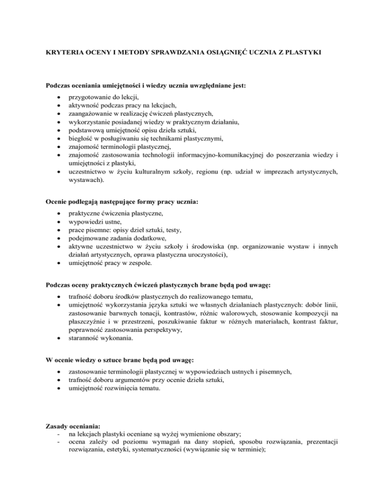 kryteria oceny i metody sprawdzania osiągnięć ucznia z plastyki