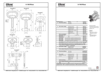 6-100 Klucz 6-100 Klucz www.dirak.pl www.dirak.pl Kształt B Kształt A Kształt C wybranie pod naklejkę Kształt Typ klucza A Dwustronny kołkowy B Kształt D Kształt E wybranie pod naklejkę 20x6x1 C Kształt F Wymiar 3mm Dorn 5mm Dorn d Nr części 204-0107 204-0108 Klucz żeński, wklęsły Kwadratowy 6mm 11,5 204-0111 Kwadratowy 7mm 14,2 204-0102 Kwadratowy 8mm 14,2 204-0103 Trójkątny 6.5mm 11,5 204-0112 Trójkątny 6.5mm CNOMO 14,2 204-0106 Trójkątny 7mm 14,2 204-0104 Trójkątny 8mm 14,2 204-0105 Trójkątny 9mm EDF 15,9 204-0113 Belcore sześciokątny 7/16“ 15,6 204-0134.30 typu Daimler Benz 11,5204-0109 typu Crown 15,9 204-0110 Crescent Czech 15,9 204-0116 Klucz męski do uruchomień z gniazdem kwadratowym 6mm 204-0119 Klucz męski do uruchomień z gniazdem kwadratowym 7mm 204-0120 Klucz męski do uruchomień z gniazdem kwadratowym 8mm 204-0121 Klucz męski 5/16“ (8mm) z otworem na kołek 3mm 204-0133.30 (do uruchomień 200-9172 i 200-9178, także do uruchomień z gniazdem sześciokątnym 8mm bez kołka) klucz awaryjny do podwójnych uchwytów cylindrowych (nie pokazany na rysunku) 204-0301 Klucze mogą posiadać Państwa znak firmowy w przypadku zamówienia od 2000 W celu uzyskania dodatkowych informacji prosimy skontaktować się z nami. Przykład zamówienia: 204-0111 - znak firmowy Klucz żeński, z wgłęb. Kwadratowy 6mm 204-0501 Trójkątny 6.5mm 204-0502 Klucze mogą posiadać Państwa znak firmowy w przypadku zamówienia od 2000 W celu uzyskania dodatkowych informacji prosimy skontaktować się z nami. D Dwustronny kołkowy E Klucz żeński Znak firmowy po obu stronach 3mm Dorn 5mm Dorn Klucze do zamków ćwierćobrotowych serii 200 i 220 i dla uruchomień, patrz produkt 2-141. Materiał: A), B) i C) • Klucz: odlew cynkowy, niepoddany obróbce D) i E) • Klucz poliamidowy: poliamid, czarny 204-0407.03 204-0408.03 Kwadratowy 6mm 11,5 204-0401.03 Kwadratowy 7mm 15,5 204-0402.03* Kwadratowy 8mm 15,5 204-0403.03* Trójkątny 6.5mm 11,5 204-0404.03 Trójkątny 7mm 15,5 204-0405.03* Trójkątny 8mm 15,5 204-0406.03* Rodzaj śrubokręta 10 x 1,4 204-0409.03 Klucze mogą posiadać Państwa znak firmowy w przypadku zamówienia od 5000 sztuk. W celu uzyskania dodatkowych informacji prosimy skontaktować się z nami. F Klucz FIAT 204-0302.42 *niniejsze klucze żeńskie nie mogą być stosowane z ćwierćobrotowymi zamkami bezpieczeństwa 1-085 i z uchwytami wpuszczanymi 6-1380 mocowanymi na zawiasach. 01.09.08 © copyright by DIRAK / Germany DIRAK GmbH - Königsfelder Str. 1 - D-58256 Ennepetal - Tel.: ++49 (0) 2333/837-0 - Fax: ++49 (0) 2333/837-100 DIRAK GmbH - Königsfelder Str. 1 - D-58256 Ennepetal - Tel.: ++49 (0) 2333/837-0 - Fax: ++49 (0) 2333/837-100