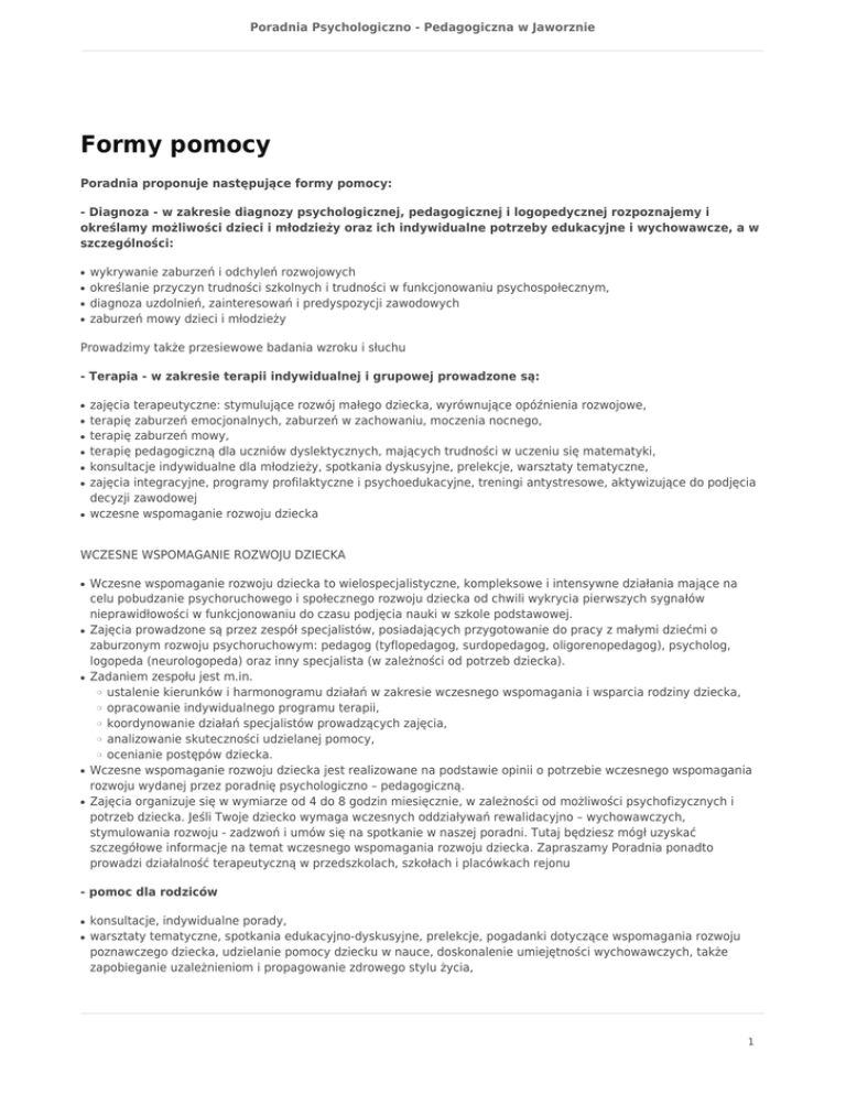 Poradnia Psychologiczno - Pedagogiczna w Jaworznie Formy pomocy Poradnia proponuje następujące formy pomocy: - Diagnoza - w zakresie diagnozy psychologicznej, pedagogicznej i logopedycznej rozpoznajemy i określamy możliwości dzieci i młodzieży oraz ich indywidualne potrzeby edukacyjne i wychowawcze, a w szczególności: ● ● ● ● wykrywanie zaburzeń i odchyleń rozwojowych określanie przyczyn trudności szkolnych i trudności w funkcjonowaniu psychospołecznym, diagnoza uzdolnień, zainteresowań i predyspozycji zawodowych zaburzeń mowy dzieci i młodzieży Prowadzimy także przesiewowe badania wzroku i słuchu - Terapia - w zakresie terapii indywidualnej i grupowej prowadzone są: ● ● ● ● ● ● ● zajęcia terapeutyczne: stymulujące rozwój małego dziecka, wyrównujące opóźnienia rozwojowe, terapię zaburzeń emocjonalnych, zaburzeń w zachowaniu, moczenia nocnego, terapię zaburzeń mowy, terapię pedagogiczną dla uczniów dyslektycznych, mających trudności w uczeniu się matematyki, konsultacje indywidualne dla młodzieży, spotkania dyskusyjne, prelekcje, warsztaty tematyczne, zajęcia integracyjne, programy profilaktyczne i psychoedukacyjne, treningi antystresowe, aktywizujące do podjęcia decyzji zawodowej wczesne wspomaganie rozwoju dziecka WCZESNE WSPOMAGANIE ROZWOJU DZIECKA ● ● ● Wczesne wspomaganie rozwoju dziecka to wielospecjalistyczne, kompleksowe i intensywne działania mające na celu pobudzanie psychoruchowego i społecznego rozwoju dziecka od chwili wykrycia pierwszych sygnałów nieprawidłowości w funkcjonowaniu do czasu podjęcia nauki w szkole podstawowej. Zajęcia prowadzone są przez zespół specjalistów, posiadających przygotowanie do pracy z małymi dziećmi o zaburzonym rozwoju psychoruchowym: pedagog (tyflopedagog, surdopedagog, oligorenopedagog), psycholog, logopeda (neurologopeda) oraz inny specjalista (w zależności od potrzeb dziecka). Zadaniem zespołu jest m.in. ustalenie kierunków i harmonogramu działań w zakresie wczesnego wspomagania i wsparcia rodziny dziecka, opracowanie indywidualnego programu terapii, koordynowanie działań specjalistów prowadzących zajęcia, analizowanie skuteczności udzielanej pomocy, ocenianie postępów dziecka. Wczesne wspomaganie rozwoju dziecka jest realizowane na podstawie opinii o potrzebie wczesnego wspomagania rozwoju wydanej przez poradnię psychologiczno – pedagogiczną. Zajęcia organizuje się w wymiarze od 4 do 8 godzin miesięcznie, w zależności od możliwości psychofizycznych i potrzeb dziecka. Jeśli Twoje dziecko wymaga wczesnych oddziaływań rewalidacyjno – wychowawczych, stymulowania rozwoju - zadzwoń i umów się na spotkanie w naszej poradni. Tutaj będziesz mógł uzyskać szczegółowe informacje na temat wczesnego wspomagania rozwoju dziecka. Zapraszamy Poradnia ponadto prowadzi działalność terapeutyczną w przedszkolach, szkołach i placówkach rejonu ❍ ❍ ❍ ❍ ❍ ● ● - pomoc dla rodziców ● ● konsultacje, indywidualne porady, warsztaty tematyczne, spotkania edukacyjno-dyskusyjne, prelekcje, pogadanki dotyczące wspomagania rozwoju poznawczego dziecka, udzielanie pomocy dziecku w nauce, doskonalenie umiejętności wychowawczych, także zapobieganie uzależnieniom i propagowanie zdrowego stylu życia, 1 Poradnia Psychologiczno - Pedagogiczna w Jaworznie ● ● ● grupy wsparcia, spotkania terapeutyczne dla rodzin z różnymi problemami związanymi z wychowaniem dziecka, mediacje, negocjacje pomiędzy rodzicami i dzieckiem. - pomoc dla nauczycieli i wychowawców ● ● ● ● ● indywidualne konsultacje, pomoc w rozwiązywaniu bieżących problemów dydaktycznych i wychowawczych, szkolenia, warsztaty tematyczne, spotkania edukacyjno-dyskusyjne, grupy wsparcia dla nauczycieli rozpoczynających pracę zawodową, organizowanie zajęć otwartych w poradni propagujących programy terapeutyczne - opiniowanie - wydajemy opinie w sprawach ● ● ● ● ● ● ● ● ● ● przyspieszenia i odroczenia obowiązku szkolnego pozostawienia ucznia klas I-III szkoły podstawowej na drugi rok w tej samej klasie objęcia nauką w klasie terapeutycznej dostosowania wymagań edukacyjnych wynikających z programu nauczania do indywidualnych potrzeb psychofizycznych i edukacyjnych ucznia, u którego stwierdzono zaburzenia i odchylenia rozwojowe lub specyficzne trudności w uczeniu się, uniemożliwiające sprostanie tym wymaganiom zwolnienia ucznia z wadą słuchu lub głęboką dysleksją rozwojową z nauki drugiego języka udzielenia zezwolenia na indywidualny program lub tok nauki przyjęcia ucznia gimnazjum do oddziału przysposabiającego do pracy przyjęcia do klasy pierwszej szkoły ponadgimnazjalnej: zasadniczej szkoły zawodowej, liceum ogólnokształcącego, liceum profilowanego i technikum, a także klasy pierwszej szkoły średniej na podbudowie programowej szkoły zasadniczej, szkoły policealnej i szkoły pomaturalnej, kandydata z problemami zdrowotnymi, ograniczającymi możliwoćci wyboru kierunku kształcenia ze względu na stan zdrowia przystąpienia ucznia lub absolwenta z zaburzeniami i odchyleniami rozwojowymi lub ze specyficznymi trudnoćciami w uczeniu się odpowiednio do sprawdzianu przeprowadzanego w ostatnim roku nauki w szkole podstawowej, egzaminu przeprowadzanego w ostatnim roku nauki w gimnazjum, egzaminu maturalnego lub egzaminu potwierdzającego kwalifikacje zawodowe, w warunkach i formie dostosowanych do indywidualnych potrzeb psychofizycznych ucznia lub absolwenta innych określonych w odrębnych przepisach - orzekanie - poradnia orzeka w sprawach: ● ● ● indywidualnego nauczania dzieci i młodzieży, których stan zdrowia uniemożliwia lub znacznie utrudnia uczęszczanie do szkoły kształcenia specjalnego dzieci i młodzieży z zaburzeniami i odchyleniami rozwojowymi, wymagającymi stosowania specjalnej organizacji nauki i metod pracy, w tym o potrzebie zajęć rewalidacyjno-wychowawczych dla dzie