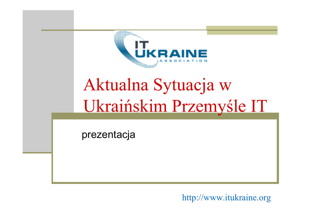 Aktualna Sytuacja w Ukraińskim Przemyśle IT prezentacja http://www.itukraine.org Wielkość Ukraińskiego Rynku Usług i Produktów IT 160 150 140 mil. USD 120 100 100 80 60 40 60 32 70 39 20 0 2000 2001 2002 2003 2004 2005 50% 45% 40% 35% 30% 25% 20% 15% 10% 5% 0% 2001 2002 2003 2004 2005 http://www.itukraine.org Podział rynku na usługi i produkty IT Duże i średnie firmy 35% 65% Małe firmy mniej niż 15 pracowników, niezależne grupy programistów http://www.itukraine.org Czynniki wpływajace na eksport ukraińskich usług i produktów IT Czynniki negatywne: 1. 2. 3. 4. Problemy komunikacyjne (język, poziom telekomunikacij w kraju). Brak inwestycij. Negatywna percepcja Ukrainy na rynku globalnym. Brak poparcia rządowego oraz odpowiedniego ustawodawstwa. Czynniki pozytywne: 1. Wzrost gospodarki ukraińskiej w ostatnim roku. 2. Położenie Ukrainy w Europie. 3. Konkurencyjne zarobki ukraińskich programistów. 4. Profesjonalni specjaliści i wysoki poziom wyksztalczenia. Certyfikacja firm ukraińskich w 2003-2005r. (według standartów ISO/CMMI) 50 45 40 35 30 25 20 15 10 5 0 Przed 2003 2003 2004 2005 2006 2007 http://www.itukraine.org Sektory gospodarki, dla których firmy IT proponują pionowe rozwiązania Ochrona zdrowia 43,8 Przemysł/Produkcja 43,8 Usługi społeczne 37,5 Handel 37,5 Transport 31,3 Telekomunikacja 31,3 Badania naukowe/Edukacja 25 Finanse/Ubezpieczenia 18,8 Media/Wydawnictwa 12,5 Inne 0 10 20 30 40 50 http://www.itukraine.org Stowarzyszenie “IT Ukrainy” zostało założone w kwietniu 2004 r. Był to wspólny wysiłek grupy liderów ukraińskich firm zajmujących się oprogramowaniem. http://www.itukraine.org Dlaczego założyliśmy “IT Ukrainy”? Aby: skonsolidować wysiłki ukraińskich firm w lansowaniu konkurencyjnych produktów na światowym rynku; połączyć naukowy, edukacyjny i przemysłowy potencjał Ukrainy; stworzyć sprzyjające warunki do dalszego rozwoju ukraińskiego przemysłu IT. http://www.itukraine.org O Naszym Stowarzyszeniu Stowarzyszenie reprezentuje prywatne firmy, które produkują około 80 % ukraińskiego exportu, o wartości $150 mln. http://www.itukraine.org Nasze Cele: Połączyć większość ukraińskich firm i instytucji badawczych zorientowanych na eksport; Poprawić aktualne ustawodawstwo dotyczące IT; Umocnić relacje ze strukturami władzy wyższych uczeni, szkolących przyszłych pracowników sektora IT; Zorganizować nowoczesną infrastrukturę, m.in., specjalistyczne bazy IT w największych miastach na Ukrainie; Powiększyć udział Ukrainy w wystawach dotyczących IT zarówno na Ukrainie jak i za granicą; Pomagać w aktywnym wprowadzaniu standardów CMMI i ISO 9000/2000 w kontekście zarządzania projektami i zapewnieniu jakości. http://www.itukraine.org Nasze Demokratyczne Zasady regularna rotacja wybieranego Prezesa; poziomy członkowstwa – pełne, członkowie- korespondenci, akademickie; możliwość zachęcenia do członkowstwa małych i średnich firm z całej Ukrainy; http://www.itukraine.org Pełni i Członkowie-Korespondenci Stowarzyszenia Prywatne firmy zajmujące się oprogramowaniem (od wielkich ponad 500 do małych- nie więcej niż 100 pracowników), łącznie ponad 6 tys. pracowników ukraińskiego rynku IT liczącego 20-25 tys. http://www.itukraine.org Akademiccy Członkowie Stowarzyszenia Najlepsze ośrodki kształcące w sektorze IT: Kijowski Nacionalny Uniwersytet Szewczenki, Kijowski Nacionalny Politechniczny Uniwersytet, Kijowski Nacionalny Aerokosmiczny Uniwersytet, (liczba studentów IT – ok.10 tys.) Znane na świecie Instytuty Ukraińskiej Narodowej Akademi Nauk – Instytut Systemów Komputerowych, Akademia Badań Komputerowych. Inne instytucje naukowe i badawcze. http://www.itukraine.org Dziekuję! http://www.itukraine.org