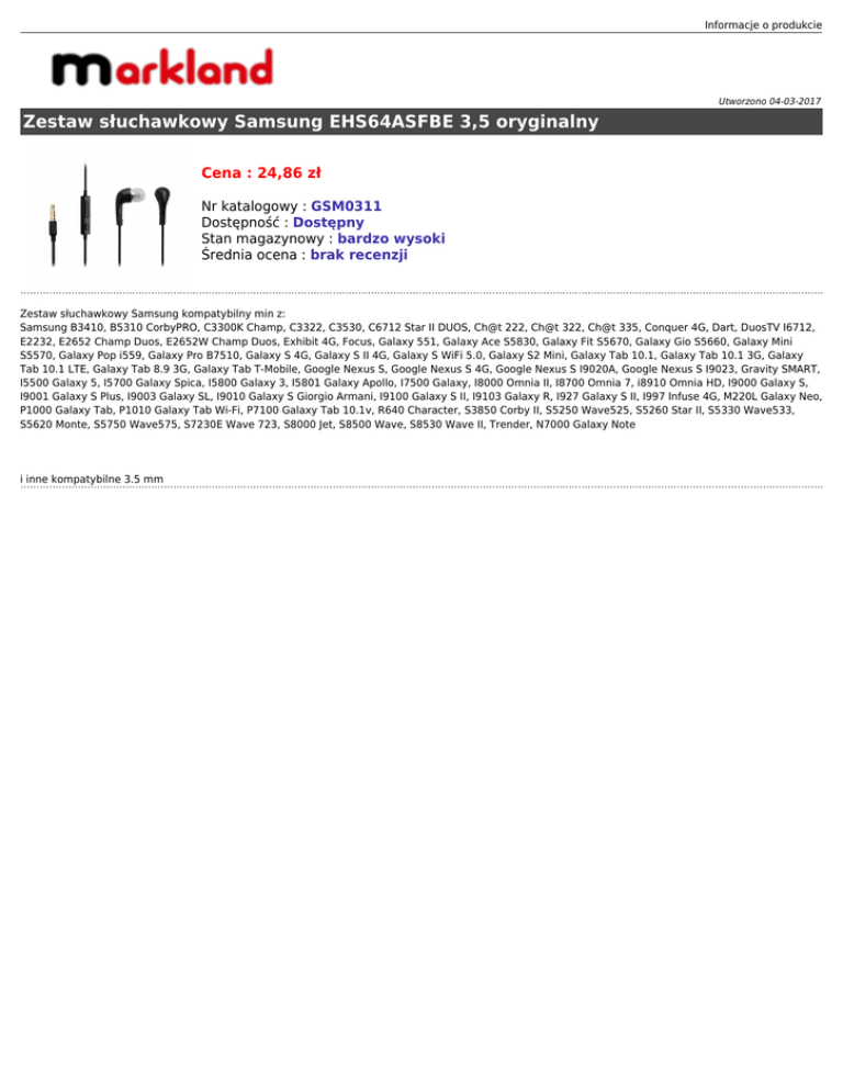 Informacje o produkcie Utworzono 04-03-2017 Zestaw słuchawkowy Samsung EHS64ASFBE 3,5 oryginalny Cena : 24,86 zł Nr katalogowy : GSM0311 Dostępność : Dostępny Stan magazynowy : bardzo wysoki Średnia ocena : brak recenzji Zestaw słuchawkowy Samsung kompatybilny min z: Samsung B3410, B5310 CorbyPRO, C3300K Champ, C3322, C3530, C6712 Star II DUOS, Ch@t 222, Ch@t 322, Ch@t 335, Conquer 4G, Dart, DuosTV I6712, E2232, E2652 Champ Duos, E2652W Champ Duos, Exhibit 4G, Focus, Galaxy 551, Galaxy Ace S5830, Galaxy Fit S5670, Galaxy Gio S5660, Galaxy Mini S5570, Galaxy Pop i559, Galaxy Pro B7510, Galaxy S 4G, Galaxy S II 4G, Galaxy S WiFi 5.0, Galaxy S2 Mini, Galaxy Tab 10.1, Galaxy Tab 10.1 3G, Galaxy Tab 10.1 LTE, Galaxy Tab 8.9 3G, Galaxy Tab T-Mobile, Google Nexus S, Google Nexus S 4G, Google Nexus S I9020A, Google Nexus S I9023, Gravity SMART, I5500 Galaxy 5, I5700 Galaxy Spica, I5800 Galaxy 3, I5801 Galaxy Apollo, I7500 Galaxy, I8000 Omnia II, I8700 Omnia 7, i8910 Omnia HD, I9000 Galaxy S, I9001 Galaxy S Plus, I9003 Galaxy SL, I9010 Galaxy S Giorgio Armani, I9100 Galaxy S II, I9103 Galaxy R, I927 Galaxy S II, I997 Infuse 4G, M220L Galaxy Neo, P1000 Galaxy Tab, P1010 Galaxy Tab Wi-Fi, P7100 Galaxy Tab 10.1v, R640 Character, S3850 Corby II, S5250 Wave525, S5260 Star II, S5330 Wave533, S5620 Monte, S5750 Wave575, S7230E Wave 723, S8000 Jet, S8500 Wave, S8530 Wave II, Trender, N7000 Galaxy Note i inne kompatybilne 3.5 mm