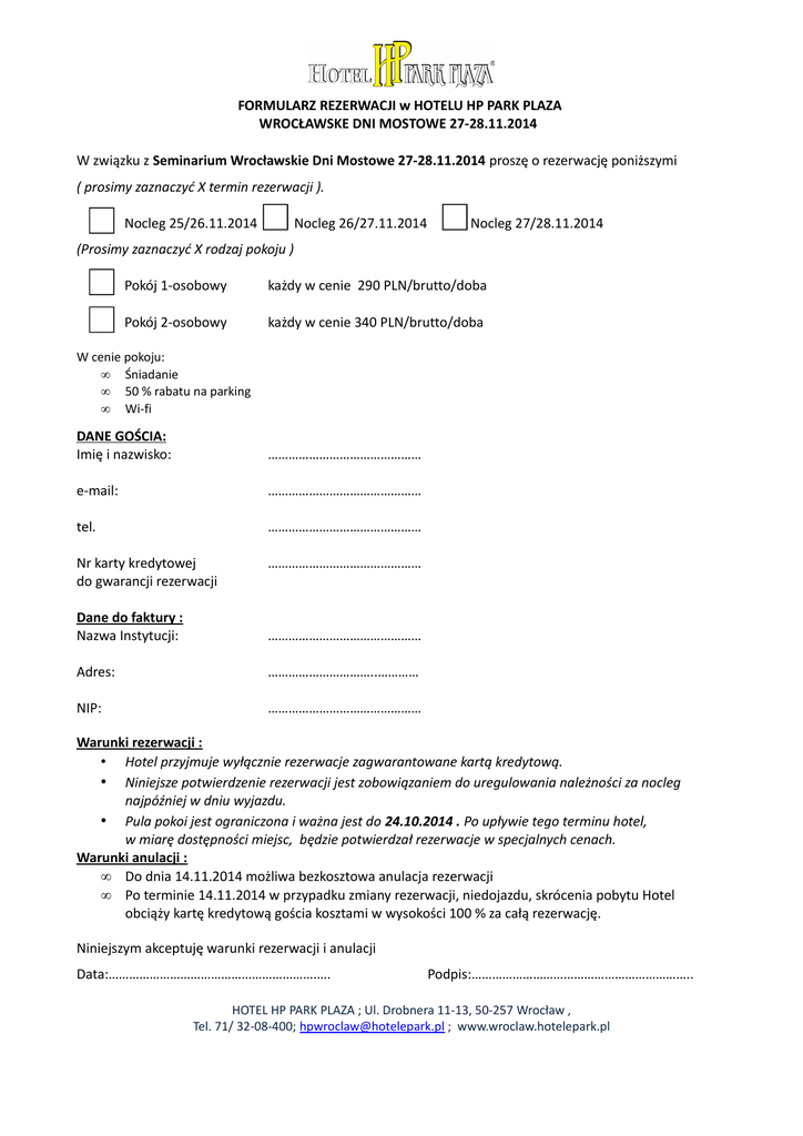 FORMULARZ REZERWACJI w HOTELU HP PARK PLAZA WROCŁAWSKE DNI MOSTOWE 27-28.11.2014 W związku z Seminarium Wrocławskie Dni Mostowe 27-28.11.2014 proszę o rezerwację poniższymi ( prosimy zaznaczyć X termin rezerwacji ). Nocleg 25/26.11.2014 Nocleg 26/27.11.2014 Nocleg 27/28.11.2014 (Prosimy zaznaczyć X rodzaj pokoju ) Pokój 1-osobowy każdy w cenie 290 PLN/brutto/doba Pokój 2-osobowy każdy w cenie 340 PLN/brutto/doba W cenie pokoju: • Śniadanie • 50 % rabatu na parking • Wi-fi DANE GOŚCIA: Imię i nazwisko: ……………………………………… e-mail: ……………………………………… tel. ……………………………………… Nr karty kredytowej do gwarancji rezerwacji ……………………………………… Dane do faktury : Nazwa Instytucji: ……………………………………… Adres: …………………………..………… NIP: ……………………………………… Warunki rezerwacji : • Hotel przyjmuje wyłącznie rezerwacje zagwarantowane kartą kredytową. • Niniejsze potwierdzenie rezerwacji jest zobowiązaniem do uregulowania należności za nocleg najpóźniej w dniu wyjazdu. • Pula pokoi jest ograniczona i ważna jest do 24.10.2014 . Po upływie tego terminu hotel, w miarę dostępności miejsc, będzie potwierdzał rezerwacje w specjalnych cenach. Warunki anulacji : • Do dnia 14.11.2014 możliwa bezkosztowa anulacja rezerwacji • Po terminie 14.11.2014 w przypadku zmiany rezerwacji, niedojazdu, skrócenia pobytu Hotel obciąży kartę kredytową gościa kosztami w wysokości 100 % za całą rezerwację. Niniejszym akceptuję warunki rezerwacji i anulacji Data:…………………………………………………….…. Podpis:……………………………………………………….. HOTEL HP PARK PLAZA ; Ul. Drobnera 11-13, 50-257 Wrocław , Tel. 71/ 32-08-400; [email protected] ; www.wroclaw.hotelepark.pl