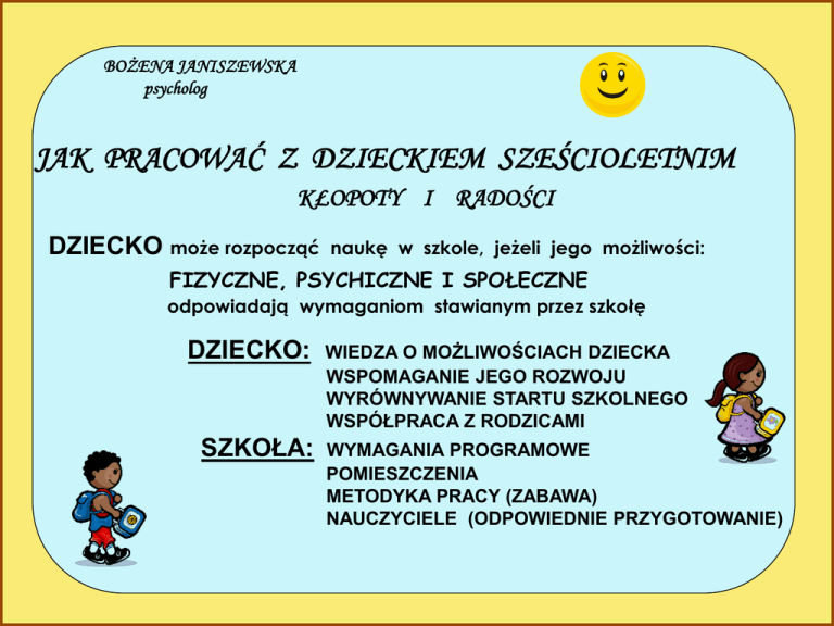 BOŻENA JANISZEWSKA psycholog JAK PRACOWAĆ Z DZIECKIEM SZEŚCIOLETNIM KŁOPOTY I RADOŚCI DZIECKO może rozpocząć naukę w szkole, jeżeli jego możliwości: FIZYCZNE, PSYCHICZNE I SPOŁECZNE odpowiadają wymaganiom stawianym przez szkołę DZIECKO: SZKOŁA: WIEDZA O MOŻLIWOŚCIACH DZIECKA WSPOMAGANIE JEGO ROZWOJU WYRÓWNYWANIE STARTU SZKOLNEGO WSPÓŁPRACA Z RODZICAMI WYMAGANIA PROGRAMOWE POMIESZCZENIA METODYKA PRACY (ZABAWA) NAUCZYCIELE (ODPOWIEDNIE PRZYGOTOWANIE) DZIECKO SZEŚCIOLETNIE FUNKCJONUJE W SZKOLE, GDY MA KU TEMU MOŻLIWOŚCI to inaczej i CHCE TO ROBIĆ to inaczej PROCESY INSTRUMENTALNE PROCESY REGULACYJNE CZYNNOŚCI WYKONAWCZE (RUCHY) PROCESY ORIENTACYJNE: PROCESY EMOCJONALNE POTRZEBY BIOLOGICZNE UWAGA, PAMIĘD, SPOSTRZEGANIE PROCESY INTELEKTUALNE: WYOBRAŻENIA MYŚLENIE (SĄ ONE WRODZONE) POTRZEBY PSYCHICZNE (NABYTE, WYUCZONE, WEWNĘTRZNE) WEWNĘTRZNE, NABYTE MECHANIZMY OSOBOWOŚCI WYMAGANIA ZEWNĘTRZNE WZMOCNIENIA: NAGRODY I KARY NORMY, ZASADY POSTĘPOWANIA PROCESY INSTRUMENTALNE UMOŻLIWIAJĄ DZIAŁANIE, SĄ NARZĘDZIEM, „INSTRUMENTEM” POZWALAJĘCYM, POZNAWAD ŚWIAT PROCESY REGULACYJNE STYMULUJĄ DO DZIAŁANIA, NADAJĄ DZIAŁANIOM KIERUNEK, DECYDUJĄ O WYBORZE DZIAŁAO LUB O ICH UNIKANIU. W klasie i we wrześniu 2012 roku znajdą się dzieci urodzone w 2006 roku, a więc: Dzieci najstarsze, mające SZEŚĆ LAT i osiem miesięcy (ich możliwości dobrze znamy); Dzieci najmłodsze, mające PIĘĆ lat i osiem miesięcy! ( nie znamy dobrze ich możliwości i właściwości). Różnica wiekowa wynosi miedzy nimi wynosi jeden rok, a w tym okresie rozwojowym jest to bardzo dużo! Koniecznością staje się znajomość prawidłowości rozwojowych dzieci młodszych i starszych, tak by praca ze zróżnicowaną wiekowo klasą mogła dawać radość dzieciom i nauczycielom i by kłopotów było mało! SKĄD SIĘ BIORĄ TAK DUŻE RÓŻNICE?? Skok rozwojowy w wieku około pięć i pół – sześć i pół roku. W tym okresie uaktywnia się układ hormonalny, który powoduje, że w krótkim czasie dokonuje się wiele zmian rozwojowych w układach: kostnym (szybki przyrost kości długich i zmiana ich grubości; pierwszy etap kostnienia nadgarstka) – następuje zmiana proporcji ciała; u mięśniowym (grupy mięśni dopasowują się do długości kości); wzrasta siła mięśni i odporność na zmęczenie; u chłopców obserwuje się „głód ruchu”; u nerwowym – dojrzewają receptory narządów zmysłowych: polep sza się ostrość wzroku, słuchu, dotyku itp. – dziecko odbiera więcej i lepiej bodźce z otoczenia; dojrzewają struktury kory mózgowej odpowiadające za: spostrzeganie wzrokowe, słuchowe itp., za myślenie ogólne i matematyczne, dojrzewają struktury mózgowe odpowiedzialne za kontrolę ekspresji emocji, za poziom uwagi i pamięci; dojrzewają nerwy czuciowe i ruchowe – szybciej i lepiej przewodzone są impulsy nerwowe, wzrasta koordynacja ruchów i integracja zmysłowo-ruchowa; u dojrzewają wszystkie układy wewnętrzne – wzrasta odporność na choroby, poprawia się oddychanie, krążenie, trawienie, poprawia się zdolność do odroczenia zaspokajania potrzeb biologicznych itp. u Dziecko przed zmianami rozwojowymi: u u u u u chce się głównie bawić; uczy się okazjonalnie – w zabawie i poprzez zabawę; kieruje się w swoim postępowaniu nie normami, zasadami, ale EMOCJAMI. Chce robić to, co lubi, unika czynności, których nie lubi, niechętnie pokonuje trudności; nie ma poczucia obowiązkowości i odpowiedzialności itp. w jego ruchach brak jeszcze koordynacji, brak płynności ruchów nadgarstka; ma mimowolną uwagę i pamięć, jego spostrzeganie wzrokowe i słuchowe nie jest dostatecznie analityczno-syntetyczne, nie ma jeszcze myślenia logicznego itp. Dziecko po skoku rozwojowym: u u u u w jego aktywności zabawa już nie dominuje, ale także jest ważna; obserwuje się początki zdolności do uczenia się zamierzonego; lepiej kontroluje ekspresję emocji, coraz bardziej uwzględnia normy w postępowaniu, próbuje pokonywać trudności; obserwuje się początki odpowiedzialności i obowiązkowości; procesy ruchowe i poznawcze mają inną jakość – obserwuje się początek dowolności uwagi, pamięci, lepsze spostrzegania i początki myślenia logicznego. JAKIE SĄ WIĘC TE SZEŚCIOLATKI PRZED LUB W TRAKCIE SKOKU ROZWOJOWEGO??? DZIECI CHCĄ SIĘ GŁÓWNIE BAWIĆ – każda forma zabawowa zachęca je do: słuchania, działania, pokonywania przeszkód. t BARDZO DOBRZE REAGUJĄ NA ZACHĘTY, POCHWAŁY – PRZY NIEPOWODZENIACH ODMAWIAJĄ DZIAŁANIA. t ZMĘCZONE, ŚPIĄCE LUB GŁODNE STAJĄ SIĘ „ NIEZNOŚNE” - nie uświadamiają sobie jeszcze przyczyn swego zachowania; po zjedzeniu czegoś lub po krótkim odpoczynku szybko się regenerują. t ŁATWO ROZPRASZAJĄ SIĘ – CHCĄC JE SKONCENTROWAĆ TRZEBA BYĆ „AKTOREM”. t POTRAFIĄ BYĆ UPARTE – ARGUMENTY LOGICZNE NIE SKUTKUJĄ – kierują się własnymi chęciami. t SĄ UFNE I ŁATWOWIERNE, PODATNE NA EMOCJONALNIE PODANE INFORMACJE. t MAJĄ JESZCZE „MAGICZNE” MYŚLENIE. t t SĄ EGOCENTRYCZNE. PONADTO: MAJĄ WIOTKI, MIĘKKI KOŚCIEC I SŁABE MIĘŚNIE – muszą więc często zmieniać pozycję – kładą się, podpierają, klękają itp. – nie należy wymagać spokojnego siedzenia. t MAJĄ JESZCZE SILNE NAPIĘCIE MIĘŚNIOWE (palców, nadgarstka, przedramienia i barków) – piszą duże drukowane litery, często od dołu do góry, rysują szlaczki typu: I_I_I_I ; //////;\\\\\\\; XXXX; VVVV, a nie literopodobne typu: UUUU; boli je ręka przy pisaniu i rysowaniu, rysunki są schematyczne, zgeometryzowane, kłopot w pisaniu w liniach itp. t MAJĄ KŁOPOT Z OCENĄ STOSUNKÓW PRZESTRZENNYCH: prawo - lewo; góra – dół, pod, nad. obok, za, między itp. t W ANALIZIE I SYNTEZIE WZROKOWEJ często odwracają elementy asymetryczne, nie różnicują dobrze liter i cyfr o podobnych kształtach, nie uwzględniają przerw między wyrazami itp. ; w opisie obrazka nie spostrzegają