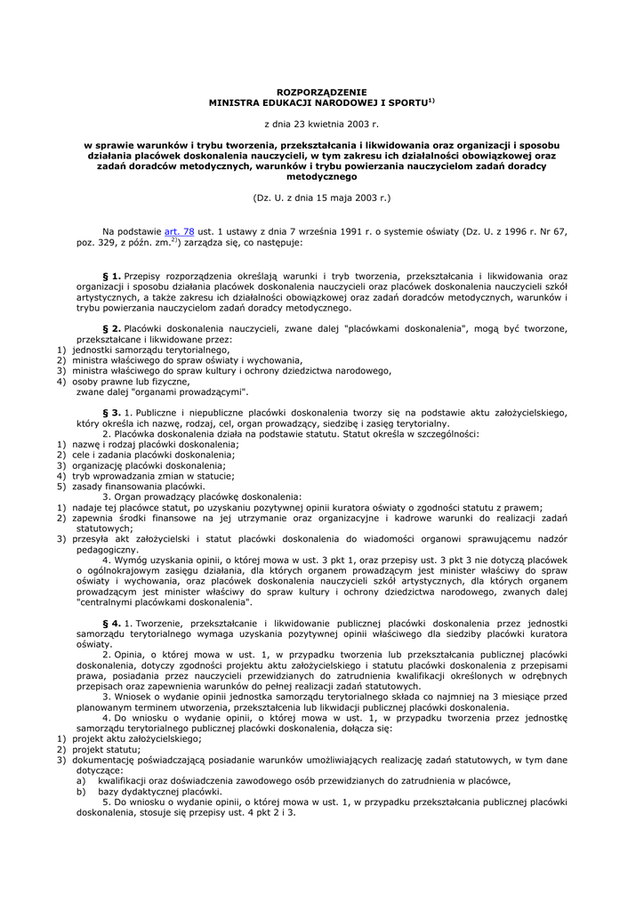 ROZPORZĄDZENIE MINISTRA EDUKACJI NARODOWEJ I SPORTU1) z dnia 23 kwietnia 2003 r. w sprawie warunków i trybu tworzenia, przekształcania i likwidowania oraz organizacji i sposobu działania placówek doskonalenia nauczycieli, w tym zakresu ich działalności obowiązkowej oraz zadań doradców metodycznych, warunków i trybu powierzania nauczycielom zadań doradcy metodycznego (Dz. U. z dnia 15 maja 2003 r.) Na podstawie art. 78 ust. 1 ustawy z dnia 7 września 1991 r. o systemie oświaty (Dz. U. z 1996 r. Nr 67, poz. 329, z późn. zm.2)) zarządza się, co następuje: § 1. Przepisy rozporządzenia określają warunki i tryb tworzenia, przekształcania i likwidowania oraz organizacji i sposobu działania placówek doskonalenia nauczycieli oraz placówek doskonalenia nauczycieli szkół artystycznych, a takŜe zakresu ich działalności obowiązkowej oraz zadań doradców metodycznych, warunków i trybu powierzania nauczycielom zadań doradcy metodycznego. 1) 2) 3) 4) 1) 2) 3) 4) 5) 1) 2) 3) § 2. Placówki doskonalenia nauczycieli, zwane dalej "placówkami doskonalenia", mogą być tworzone, przekształcane i likwidowane przez: jednostki samorządu terytorialnego, ministra właściwego do spraw oświaty i wychowania, ministra właściwego do spraw kultury i ochrony dziedzictwa narodowego, osoby prawne lub fizyczne, zwane dalej "organami prowadzącymi". § 3. 1. Publiczne i niepubliczne placówki doskonalenia tworzy się na podstawie aktu załoŜycielskiego, który określa ich nazwę, rodzaj, cel, organ prowadzący, siedzibę i zasięg terytorialny. 2. Placówka doskonalenia działa na podstawie statutu. Statut określa w szczególności: nazwę i rodzaj placówki doskonalenia; cele i zadania placówki doskonalenia; organizację placówki doskonalenia; tryb wprowadzania zmian w statucie; zasady finansowania placówki. 3. Organ prowadzący placówkę doskonalenia: nadaje tej placówce statut, po uzyskaniu pozytywnej opinii kuratora oświaty o zgodności statutu z prawem; zapewnia środki finansowe na jej utrzymanie oraz organizacyjne i kadrowe warunki do realizacji zadań statutowych; przesyła akt załoŜycielski i statut placówki doskonalenia do wiadomości organowi sprawującemu nadzór pedagogiczny. 4. Wymóg uzyskania opinii, o której mowa w ust. 3 pkt 1, oraz przepisy ust. 3 pkt 3 nie dotyczą placówek o ogólnokrajowym zasięgu działania, dla których organem prowadzącym jest minister właściwy do spraw oświaty i wychowania, oraz placówek doskonalenia nauczycieli szkół artystycznych, dla których organem prowadzącym jest minister właściwy do spraw kultury i ochrony dziedzictwa narodowego, zwanych dalej "centralnymi placówkami doskonalenia". § 4. 1. Tworzenie, przekształcanie i likwidowanie publicznej placówki doskonalenia przez jednostki samorządu terytorialnego wymaga uzyskania pozytywnej opinii właściwego dla siedziby placówki kuratora oświaty. 2. Opinia, o której mowa w ust. 1, w przypadku tworzenia lub przekształcania publicznej placówki doskonalenia, dotyczy zgodności projektu aktu załoŜycielskiego i statutu placówki doskonalenia z przepisami prawa, posiadania przez nauczycieli przewidzianych do zatrudnienia kwalifikacji określonych w odrębnych przepisach oraz zapewnienia warunków do pełnej realizacji zadań statutowych. 3. Wniosek o wydanie opinii jednostka samorządu terytorialnego składa co najmniej na 3 miesiące przed planowanym terminem utworzenia, przekształcenia lub likwidacji publicznej placówki doskonalenia. 4. Do wniosku o wydanie opinii, o której mowa w ust. 1, w przypadku tworzenia przez jednostkę samorządu terytorialnego publicznej placówki doskonalenia, dołącza się: 1) projekt aktu załoŜycielskiego; 2) projekt statutu; 3) dokumentację poświadczającą posiadanie warunków umoŜliwiających realizację zadań statutowych, w tym dane dotyczące: a) kwalifikacji oraz doświadczenia zawodowego osób przewidzianych do zatrudnienia w placówce, b) bazy dydaktycznej placówki. 5. Do wniosku o wydanie opinii, o której mowa w ust. 1, w przypadku przekształcania publicznej placówki doskonalenia, stosuje się przepisy ust. 4 pkt 2 i 3. § 5. 1. Publiczna placówka doskonalenia moŜe być zlikwidowana przez organ prowadzący, po zapewnieniu przez ten organ moŜliwości zakończenia rozpoczętych w likwidowanej placówce doskonalenia form doskonalenia zawodowego nauczycieli. 2. Organ prowadzący publiczną placówkę doskonalenia jest zobowiązany, co najmniej na 6 miesięcy przed terminem likwidacji, zawiadomić właściwego kuratora oświaty o zamiarze i przyczynach likwidacji. 3. Przepis ust. 2 nie dotyczy centralnych placówek doskonalenia. 1) 2) 3) 4) 1) 2) 3) 4) 5) § 6. 1. Publiczną placówką doskonalenia kieruje dyrektor. 2. Stanowisko dyrektora publicznej placówki doskonalenia powierza organ prowadzący. 3. Kandydata na stanowisko dyrektora wyłania się w drodze konkursu. 4. Komisję konkursową powołuje organ prowadzący placówkę w składzie: dwóch przedstawicieli organu prowadzącego placówkę; dwóch przedstawicieli organu sprawującego nadzór pedagogiczny; po jednym przedstawicielu zakładowych organizacji związkowych; jeden nauczyciel zatrudniony w placówce, wyłoniony na zasadach określonych w statucie placówki doskonalenia. 5. W przypadku centralnych placówek doskonalenia w skład komisji konkursowej wchodzą czterej przedstawiciele organu prowadzącego oraz osoby, o których mowa w ust. 4 pkt 3 i 4. 6. Kandydat na stanowisko dyrektora powinien posiadać: kwalifikacje wymagane do zajmowania stanowiska nauczyciela w placówce doskonalenia; stopień nauczyciela mianowanego lub dyplomowanego; co najmniej siedmioletni staŜ pracy pedagogicznej; przygotowanie z zakresu zarządzania, uzyskane w formie studiów magisterskich, wyŜszych studiów zawodowych lub studiów podyplomowych albo w formie kursu kwalifikacyjnego z zakresu zarządzania oświatą; zaświadczenie lekarskie o braku przeciwwskazań