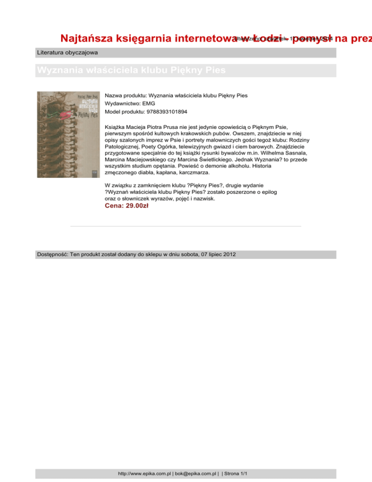 czwartek,- 17 kwiecień 2014 na prez Najtańsza księgarnia internetowaUtworzono: w Łodzi pomysł Literatura obyczajowa Wyznania właściciela klubu Piękny Pies Nazwa produktu: Wyznania właściciela klubu Piękny Pies Wydawnictwo: EMG Model produktu: 9788393101894 Książka Macieja Piotra Prusa nie jest jedynie opowieścią o Pięknym Psie, pierwszym spośród kultowych krakowskich pubów. Owszem, znajdziecie w niej opisy szalonych imprez w Psie i portrety malowniczych gości tegoż klubu: Rodziny Patologicznej, Poety Ogórka, telewizyjnych gwiazd i ciem barowych. Znajdziecie przygotowane specjalnie do tej książki rysunki bywalców m.in. Wilhelma Sasnala, Marcina Maciejowskiego czy Marcina Świetlickiego. Jednak Wyznania? to przede wszystkim studium opętania. Powieść o demonie alkoholu. Historia zmęczonego diabła, kapłana, karczmarza. W związku z zamknięciem klubu ?Piękny Pies?, drugie wydanie ?Wyznań właściciela klubu Piękny Pies? zostało poszerzone o epilog oraz o słowniczek wyrazów, pojęć i nazwisk. Cena: 29.00zł Dostępność: Ten produkt został dodany do sklepu w dniu sobota, 07 lipiec 2012 http://www.epika.com.pl | [email protected] | | Strona 1/1