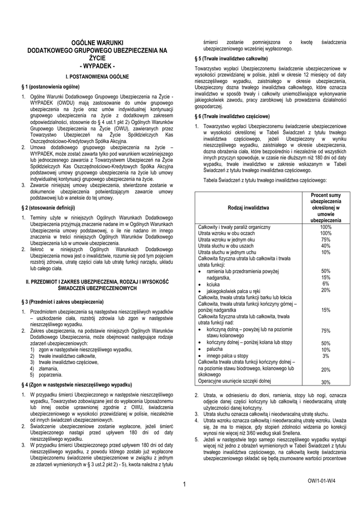 OGÓLNE WARUNKI DODATKOWEGO GRUPOWEGO UBEZPIECZENIA NA ŻYCIE - WYPADEK - śmierci zostanie pomniejszona o ubezpieczeniowego wcześniej wypłaconego. kwotę świadczenia § 5 (Trwałe inwalidztwo całkowite) Towarzystwo wypłaci Ubezpieczonemu świadczenie ubezpieczeniowe w wysokości przewidzianej w polisie, jeżeli w okresie 12 miesięcy od daty nieszczęśliwego wypadku, zaistniałego w okresie ubezpieczenia, Ubezpieczony dozna trwałego inwalidztwa całkowitego, które oznacza inwalidztwo w sposób trwały i całkowity uniemożliwiające wykonywanie jakiegokolwiek zawodu, pracy zarobkowej lub prowadzenia działalności gospodarczej. I. POSTANOWIENIA OGÓLNE § 1 (postanowienia ogólne) 1. Ogólne Warunki Dodatkowego Grupowego Ubezpieczenia na Życie WYPADEK (OWDU) mają zastosowanie do umów grupowego ubezpieczenia na życie oraz umów indywidualnej kontynuacji grupowego ubezpieczenia na życie z dodatkowym zakresem odpowiedzialności, stosownie do § 4 ust.1 pkt 2 Ogólnych Warunków Grupowego Ubezpieczenia na Życie (OWU), zawieranych przez Towarzystwo Ubezpieczeń na Życie Spółdzielczych Kas Oszczędnościowo-Kredytowych Spółka Akcyjna. 2. Umowa dodatkowego grupowego ubezpieczenia na życie – WYPADEK, może zostać zawarta tylko pod warunkiem wcześniejszego lub jednoczesnego zawarcia z Towarzystwem Ubezpieczeń na Życie Spółdzielczych Kas Oszczędnościowo-Kredytowych Spółka Akcyjna podstawowej umowy grupowego ubezpieczenia na życie lub umowy indywidualnej kontynuacji grupowego ubezpieczenia na życie. 3. Zawarcie niniejszej umowy ubezpieczenia, stwierdzone zostanie w dokumencie ubezpieczenia potwierdzającym zawarcie umowy podstawowej lub w aneksie do tej umowy. § 6 (Trwałe inwalidztwo częściowe) 1. Towarzystwo wypłaci Ubezpieczonemu świadczenie ubezpieczeniowe w wysokości określonej w Tabeli Świadczeń z tytułu trwałego inwalidztwa częściowego, jeżeli Ubezpieczony w wyniku nieszczęśliwego wypadku, zaistniałego w okresie ubezpieczenia, dozna obrażenia ciała, które bezpośrednio i niezależnie od wszystkich innych przyczyn spowoduje, w czasie nie dłuższym niż 180 dni od daty wypadku, trwałe inwalidztwo w zakresie wskazanym w Tabeli Świadczeń z tytułu trwałego inwalidztwa częściowego. Tabela Świadczeń z tytułu trwałego inwalidztwa częściowego: Rodzaj inwalidztwa § 2 (stosowanie definicji) 1. Terminy użyte w niniejszych Ogólnych Warunkach Dodatkowego Ubezpieczenia przyjmują znaczenie nadane im w Ogólnych Warunkach Ubezpieczenia umowy podstawowej, o ile nie nadano im innego znaczenia w treści niniejszych Ogólnych Warunków Dodatkowego Ubezpieczenia lub w umowie ubezpieczenia. 2. Ilekroć w niniejszych Ogólnych Warunkach Dodatkowego Ubezpieczenia mowa jest o inwalidztwie, rozumie się pod tym pojęciem rozstrój zdrowia, utratę części ciała lub utratę funkcji narządu, układu lub całego ciała. Całkowity i trwały paraliż organiczny Utrata wzroku w obu oczach Utrata wzroku w jednym oku Utrata słuchu w obu uszach Utrata słuchu w jednym uchu Całkowita fizyczna utrata lub całkowita i trwała utrata funkcji: ramienia lub przedramienia powyżej nadgarstka, kciuka jakiegokolwiek palca u ręki Całkowita, trwała utrata funkcji barku lub łokcia Całkowita, trwała utrata funkcji kończyny górnej – poniżej nadgarstka Całkowita fizyczna utrata lub całkowita, trwała utrata funkcji nad: kończyną dolną – powyżej lub na poziomie stawu kolanowego kończyny dolnej – poniżej kolana lub stopy palucha innego palca u stopy Całkowita trwała utrata funkcji kończyny dolnej – na poziomie stawu biodrowego, kolanowego lub skokowego Operacyjne usunięcie szczęki dolnej II. PRZEDMIOT I ZAKRES UBEZPIECZENIA, RODZAJ I WYSOKOŚĆ ŚWIADCZEŃ UBEZPIECZENIOWYCH § 3 (Przedmiot i zakres ubezpieczenia) 1. Przedmiotem ubezpieczenia są następstwa nieszczęśliwych wypadków – uszkodzenie ciała, rozstrój zdrowia lub zgon w następstwie nieszczęśliwego wypadku. 2. Zakres ubezpieczenia, na podstawie niniejszych Ogólnych Warunków Dodatkowego Ubezpieczenia, może obejmować następujące rodzaje zdarzeń ubezpieczeniowych: 1) zgon w następstwie nieszczęśliwego wypadku, 2) trwałe inwalidztwo całkowite, 3) trwałe inwalidztwo częściowe, 4) złamania, 5) poparzenia. § 4 (Zgon w następstwie nieszczęśliwego wypadku) 1. W przypadku śmierci Ubezpieczonego w następstwie nieszczęśliwego wypadku, Towarzystwo zobowiązane jest do wypłacenia Uposażonemu lub innej osobie uprawnionej zgodnie z OWU, świadczenia ubezpieczeniowego w wysokości przewidzianej w polisie, niezależnie od innych świadczeń ubezpieczeniowych. 2. Świadczenie ubezpieczeniowe zostanie wypłacone, jeżeli śmierć Ubezpieczonego nastąpi przed upływem 180 dni od daty nieszczęśliwego wypadku. 3. W przypadku śmierci Ubezpieczonego przed upływem 180 dni od daty nieszczęśliwego wypadku, z powodu którego zostało już wypłacone Ubezpieczonemu świadczenie ubezpieczeniowe w związku z jednym ze zdarzeń wymienionych w § 3 ust.2 pkt 2 - 5, kwota należna z tytułu Procent sumy ubezpieczenia określonej w umowie ubezpieczenia 100% 100% 75% 40% 10% 50% 15% 6% 20% 15% 75% 50% 10% 3% 20% 30% 2. Utrata, w odniesieniu do dłoni, ramienia, stopy lub nogi, oznacza odjęcie danej części kończyny lub całkowitą i nieodwracalną utratę użyteczności danej kończyny. 3. Utrata słuchu oznacza całkowitą i nieodwracalną utratę słuchu. 4. Utrata wzroku oznacza całkowitą i nieodwracalną utratę wzroku. Uważa się, że ma to miejsce, gdy stopień zdolności widzenia po korekcji wynosi nie więcej niż 3/60 według skali Snellena. 5. Jeżeli w następstwie tego samego nieszczęśliwego wypadku wystąpi więcej niż jedno z obrażeń wymienionych w Tabeli Świadczeń z tytułu trwałego inwalidztwa częściowego, na całkowitą kwotę świadczenia ubezpieczeniowego składać się będą zsumowane wartości procentowe 1 OW/1-01-W/4 6. 7. 8. 9. 10. 