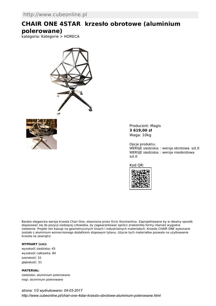 http://www.cubeonline.pl CHAIR ONE 4STAR krzesło obrotowe (aluminium polerowane) kategoria: Kategorie > HORECA Producent: Magis 3 619,00 zł Waga: 10kg Opcje produktu: WERSJE siedziska: : wersja obrotowa szt.0 WERSJE siedziska: : wersja nieobrotowa szt.0 Kod QR: Bardzo elegancka wersja krzesła Chair One, stworzona przez Grcic Konstantina. Zaprojektowane by w idealny sposób dopasować się do pozycji siedzącej człowieka, by zagwarantować oprócz znakomitej formy również wygodne siedzenie. Projekt ten bazuje na geometrycznych liniach i industrialnych materiałach. Krzesło CHAIR ONE wykonane zostało z aluminium wzmocnionego dodatkiem stopowym tytanu. Użycie tych materiałów pozwala na użytkowanie krzesła na zewnątrz. WYMIARY (cm): wysokość siedziska: 45 wysokość całkowita: 84 szerokość: 51 głębokość: 51 MATERIAŁ: siedzisko: aluminium polerowane nogi: aluminium polerowane strona: 1/2 wydrukowano: 04-03-2017 http://www.cubeonline.pl/chair-one-4star-krzeslo-obrotowe-aluminium-polerowane.html UWAGI: wersja obrotowa lub nie obrotowa Inne produkty Magis: MAGIS Inne produkty projektanta: http://www.cubeonline.pl/designer/grcic-konstantin strona: 2/2 wydrukowano: 04-03-2017 http://www.cubeonline.pl/chair-one-4star-krzeslo-obrotowe-aluminium-polerowane.html