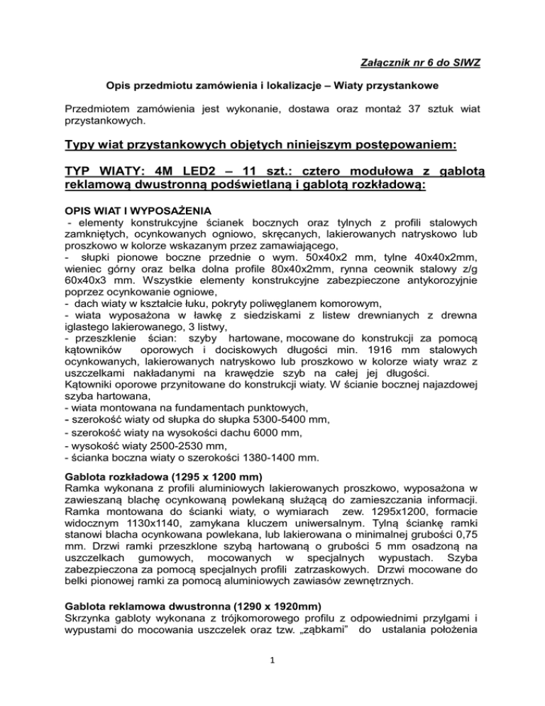 Załącznik nr 6 do SIWZ Opis przedmiotu zamówienia i lokalizacje – Wiaty przystankowe Przedmiotem zamówienia jest wykonanie, dostawa oraz montaż 37 sztuk wiat przystankowych. Typy wiat przystankowych objętych niniejszym postępowaniem: TYP WIATY: 4M LED2 – 11 szt.: cztero modułowa z gablotą reklamową dwustronną podświetlaną i gablotą rozkładową: OPIS WIAT I WYPOSAŻENIA - elementy konstrukcyjne ścianek bocznych oraz tylnych z profili stalowych zamkniętych, ocynkowanych ogniowo, skręcanych, lakierowanych natryskowo lub proszkowo w kolorze wskazanym przez zamawiającego, - słupki pionowe boczne przednie o wym. 50x40x2 mm, tylne 40x40x2mm, wieniec górny oraz belka dolna profile 80x40x2mm, rynna ceownik stalowy z/g 60x40x3 mm. Wszystkie elementy konstrukcyjne zabezpieczone antykorozyjnie poprzez ocynkowanie ogniowe, - dach wiaty w kształcie łuku, pokryty poliwęglanem komorowym, - wiata wyposażona w ławkę z siedziskami z listew drewnianych z drewna iglastego lakierowanego, 3 listwy, - przeszklenie ścian: szyby hartowane, mocowane do konstrukcji za pomocą kątowników oporowych i dociskowych długości min. 1916 mm stalowych ocynkowanych, lakierowanych natryskowo lub proszkowo w kolorze wiaty wraz z uszczelkami nakładanymi na krawędzie szyb na całej jej długości. Kątowniki oporowe przynitowane do konstrukcji wiaty. W ścianie bocznej najazdowej szyba hartowana, - wiata montowana na fundamentach punktowych, - szerokość wiaty od słupka do słupka 5300-5400 mm, - szerokość wiaty na wysokości dachu 6000 mm, - wysokość wiaty 2500-2530 mm, - ścianka boczna wiaty o szerokości 1380-1400 mm. Gablota rozkładowa (1295 x 1200 mm) Ramka wykonana z profili aluminiowych lakierowanych proszkowo, wyposażona w zawieszaną blachę ocynkowaną powlekaną służącą do zamieszczania informacji. Ramka montowana do ścianki wiaty, o wymiarach zew. 1295x1200, formacie widocznym 1130x1140, zamykana kluczem uniwersalnym. Tylną ściankę ramki stanowi blacha ocynkowana powlekana, lub lakierowana o minimalnej grubości 0,75 mm. Drzwi ramki przeszklone szybą hartowaną o grubości 5 mm osadzoną na uszczelkach gumowych, mocowanych w specjalnych wypustach. Szyba zabezpieczona za pomocą specjalnych profili zatrzaskowych. Drzwi mocowane do belki pionowej ramki za pomocą aluminiowych zawiasów zewnętrznych. Gablota reklamowa dwustronna (1290 x 1920mm) Skrzynka gabloty wykonana z trójkomorowego profilu z odpowiednimi przylgami i wypustami do mocowania uszczelek oraz tzw. „ząbkami” do ustalania położenia 1 profili obudowy. Drzwi gabloty otwierane na bok, zamontowane do ościeżnicy za pomocą specjalnych zawiasów wewnętrznych ze stali nierdzewnej. Drzwi muszą posiadać specjalne zamki na wklęsły klucz trójkątny pasujący do wszystkich zamków. Drzwi w gablocie przeszklone szybą hartowaną o grubości 5 mm klejoną do aluminiowej ramki. Widoczny format przeszklenia 1150 mm x 1785 mm. Systemowe uszczelki ościeżnicy muszą chronić wnętrze gabloty przed przedostawaniem się pyłów i wody, a otwory wentylacyjne mają zapobiegać parowaniu. Drzwi wyposażone w zabezpieczenie wykonane ze stali nierdzewnej, chroniące otwarte drzwi przed wyrywaniem przez podmuchy wiatru. Gablota reklamowa wyposażona w matówkę z PMMA rozpraszającą światło grubości 4 mm, która służy jako tło dla eksponowanych plakatów i do rozproszenia światła. Matówka zawieszana na uchwytach. Matówka z otworami umożliwiającymi włożenie dłoni. Na matówce zamontowane rolkowo – grawitacyjne uchwyty plakatu pozwalające na wielokrotne, szybkie zawieszanie plakatu bez jego uszkodzenia. Uchwyty mają pozwalać na wielokrotną wymianę plakatu oraz poprawienie jego położenia. Wewnętrzna instalacja elektryczna gabloty o napięciu 230V wraz z wyłącznikiem różnicowo – prądowym, służąca do podświetlenia skrzynki gabloty. Do oświetlenia zastosowane moduły LED o mocy min. 36 W rozmieszczone na 2 pionowych wewnętrznych krawędziach ościeżnicy, zapewniające równomierne podświetlenie całej powierzchni. Gablota musi posiadać certyfikat CE potwierdzający, że gablota spełnia wymagania aktualnych norm w przypadku urządzeń niskonapięciowych, wydane przez niezależny organ certyfikujący. TYP WIATY: 4M LED1 – 17 szt. cztero modułowa z gablotą reklamową jednostronną podświetlaną (do wnętrza) i gablotą rozkładową: OPIS WIAT I WYPOSAŻENIA - elementy konstrukcyjne ścianek bocznych oraz tylnych z profili stalowych zamkniętych, ocynkowanych ogniowo, skręcanych, lakierowanych natryskowo lub proszkowo w kolorze wskazanym przez zamawiającego, - słupki pionowe boczne przednie o wym. 50x40x2 mm, tylne 40x40x2mm, wieniec górny oraz belka dolna profile 80x40x2mm, rynna ceownik stalowy z/g 60x40x3 mm. Wszystkie elementy konstrukcyjne zabezpieczone antykorozyjnie poprzez ocynkowanie ogniowe, - dach wiaty w kształcie łuku, pokryty poliwęglanem komorowym, - wiata wyposażona w ławkę z siedziskami z listew drewnianych z drewna iglastego lakierowanego, 3 listwy, - przeszklenie ścian: szyby hartowane, mocowane do konstrukcji za pomocą kątowników oporowych i dociskowych długości min. 1916 mm stalowych ocynkowanych, lakierowanych natryskowo lub proszkowo w kolorze wiaty wraz z uszczelkami nakładanymi na krawędzie szyb na całej jej długości. Kątowniki oporowe przynitowane do konstrukcji wiaty. W ścianie bocznej najazdowej szyba hartowana, - wiata montowana na fundamentach punktowych, - szerokość wiaty od słupka do słupka 5300-5400 mm, - szerokość wiaty na wysokości dachu 6000 mm, 2 - wysokość wiaty 2500-2530 mm, - ścianka boczna wiaty o szerokości 1380-1400 mm. Gablota rozkładowa (1295 x 1200 mm) Ramka wykonana z profili aluminiowych lakierowanych proszkowo, wyposażona w zawieszaną blachę ocynkowaną powlekaną służącą do zamieszczania informacji. Ramka montowana do ścianki wiaty, o wymiarach zew. 1295x1200, formacie widocznym 11