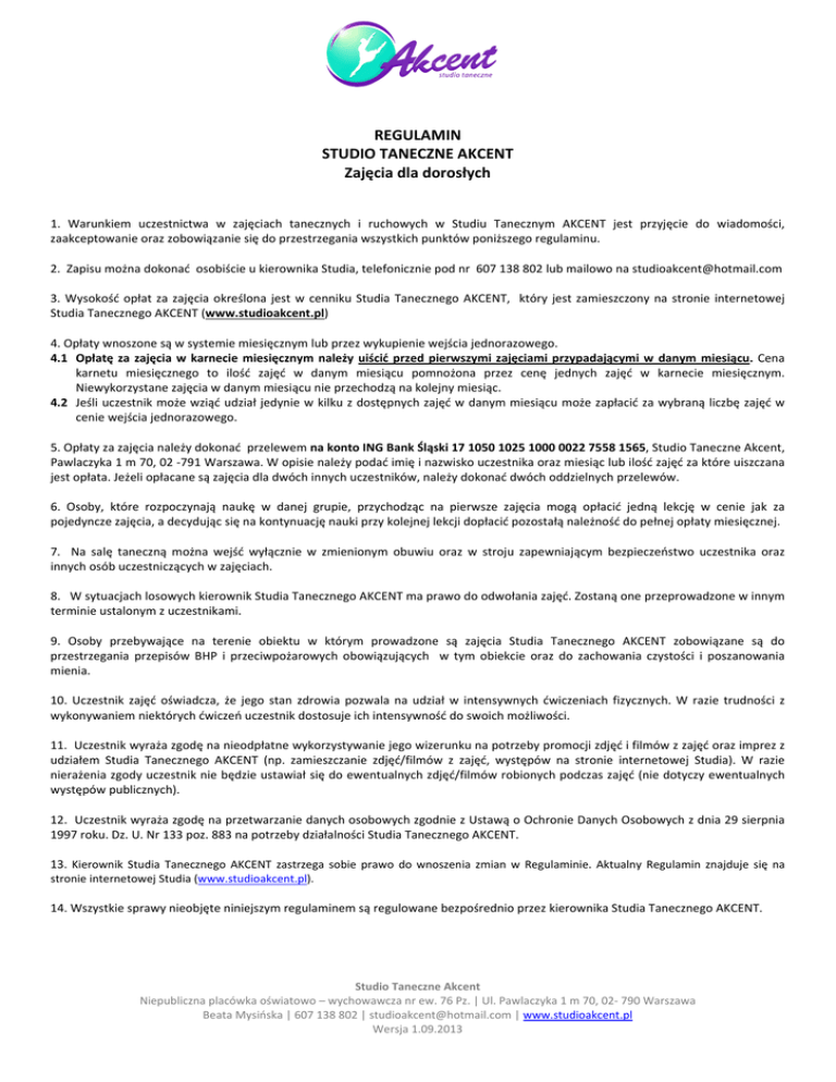 REGULAMIN STUDIO TANECZNE AKCENT Zajęcia dla dorosłych 1. Warunkiem uczestnictwa w zajęciach tanecznych i ruchowych w Studiu Tanecznym AKCENT jest przyjęcie do wiadomości, zaakceptowanie oraz zobowiązanie się do przestrzegania wszystkich punktów poniższego regulaminu. 2. Zapisu można dokonać osobiście u kierownika Studia, telefonicznie pod nr 607 138 802 lub mailowo na [email protected] 3. Wysokość opłat za zajęcia określona jest w cenniku Studia Tanecznego AKCENT, który jest zamieszczony na stronie internetowej Studia Tanecznego AKCENT (www.studioakcent.pl) 4. Opłaty wnoszone są w systemie miesięcznym lub przez wykupienie wejścia jednorazowego. 4.1 Opłatę za zajęcia w karnecie miesięcznym należy uiścić przed pierwszymi zajęciami przypadającymi w danym miesiącu. Cena karnetu miesięcznego to ilość zajęć w danym miesiącu pomnożona przez cenę jednych zajęć w karnecie miesięcznym. Niewykorzystane zajęcia w danym miesiącu nie przechodzą na kolejny miesiąc. 4.2 Jeśli uczestnik może wziąć udział jedynie w kilku z dostępnych zajęć w danym miesiącu może zapłacić za wybraną liczbę zajęć w cenie wejścia jednorazowego. 5. Opłaty za zajęcia należy dokonać przelewem na konto ING Bank Śląski 17 1050 1025 1000 0022 7558 1565, Studio Taneczne Akcent, Pawlaczyka 1 m 70, 02 -791 Warszawa. W opisie należy podać imię i nazwisko uczestnika oraz miesiąc lub ilość zajęć za które uiszczana jest opłata. Jeżeli opłacane są zajęcia dla dwóch innych uczestników, należy dokonać dwóch oddzielnych przelewów. 6. Osoby, które rozpoczynają naukę w danej grupie, przychodząc na pierwsze zajęcia mogą opłacić jedną lekcję w cenie jak za pojedyncze zajęcia, a decydując się na kontynuację nauki przy kolejnej lekcji dopłacić pozostałą należność do pełnej opłaty miesięcznej. 7. Na salę taneczną można wejść wyłącznie w zmienionym obuwiu oraz w stroju zapewniającym bezpieczeństwo uczestnika oraz innych osób uczestniczących w zajęciach. 8. W sytuacjach losowych kierownik Studia Tanecznego AKCENT ma prawo do odwołania zajęć. Zostaną one przeprowadzone w innym terminie ustalonym z uczestnikami. 9. Osoby przebywające na terenie obiektu w którym prowadzone są zajęcia Studia Tanecznego AKCENT zobowiązane są do przestrzegania przepisów BHP i przeciwpożarowych obowiązujących w tym obiekcie oraz do zachowania czystości i poszanowania mienia. 10. Uczestnik zajęć oświadcza, że jego stan zdrowia pozwala na udział w intensywnych ćwiczeniach fizycznych. W razie trudności z wykonywaniem niektórych ćwiczeń uczestnik dostosuje ich intensywność do swoich możliwości. 11. Uczestnik wyraża zgodę na nieodpłatne wykorzystywanie jego wizerunku na potrzeby promocji zdjęć i filmów z zajęć oraz imprez z udziałem Studia Tanecznego AKCENT (np. zamieszczanie zdjęć/filmów z zajęć, występów na stronie internetowej Studia). W razie nierażenia zgody uczestnik nie będzie ustawiał się do ewentualnych zdjęć/filmów robionych podczas zajęć (nie dotyczy ewentualnych występów publicznych). 12. Uczestnik wyraża zgodę na przetwarzanie danych osobowych zgodnie z Ustawą o Ochronie Danych Osobowych z dnia 29 sierpnia 1997 roku. Dz. U. Nr 133 poz. 883 na potrzeby działalności Studia Tanecznego AKCENT. 13. Kierownik Studia Tanecznego AKCENT zastrzega sobie prawo do wnoszenia zmian w Regulaminie. Aktualny Regulamin znajduje się na stronie internetowej Studia (www.studioakcent.pl). 14. Wszystkie sprawy nieobjęte niniejszym regulaminem są regulowane bezpośrednio przez kierownika Studia Tanecznego AKCENT. Studio Taneczne Akcent Niepubliczna placówka oświatowo – wychowawcza nr ew. 76 Pz. | Ul. Pawlaczyka 1 m 70, 02- 790 Warszawa Beata Mysińska | 607 138 802 | [email protected] | www.studioakcent.pl Wersja 1.09.2013