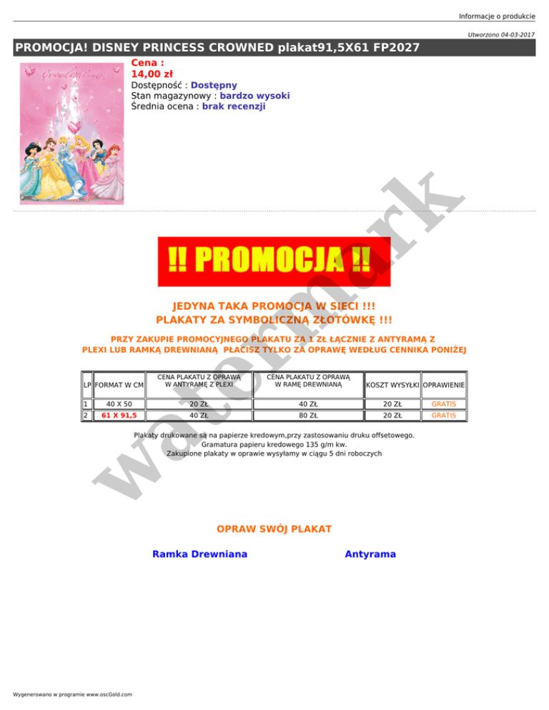Informacje o produkcie Utworzono 04-03-2017 PROMOCJA! DISNEY PRINCESS CROWNED plakat91,5X61 FP2027 Cena : 14,00 zł er m ar k Dostępność : Dostępny Stan magazynowy : bardzo wysoki Średnia ocena : brak recenzji JEDYNA TAKA PROMOCJA W SIECI !!! PLAKATY ZA SYMBOLICZNĄ ZŁOTÓWKĘ !!! PRZY ZAKUPIE PROMOCYJNEGO PLAKATU ZA 1 ZŁ ŁĄCZNIE Z ANTYRAMĄ Z PLEXI LUB RAMKĄ DREWNIANĄ PŁACISZ TYLKO ZA OPRAWĘ WEDŁUG CENNIKA PONIŻEJ LP FORMAT W CM 2 40 X 50 CENA PLAKATU Z OPRAWĄ W RAMĘ DREWNIANĄ 20 ZŁ 40 ZŁ 20 ZŁ GRATIS 80 ZŁ 20 ZŁ GRATIS at 1 CENA PLAKATU Z OPRAWĄ W ANTYRAMĘ Z PLEXI 61 X 91,5 40 ZŁ KOSZT WYSYŁKI OPRAWIENIE w Plakaty drukowane są na papierze kredowym,przy zastosowaniu druku offsetowego. Gramatura papieru kredowego 135 g/m kw. Zakupione plakaty w oprawie wysyłamy w ciągu 5 dni roboczych OPRAW SWÓJ PLAKAT Ramka Drewniana Wygenerowano w programie www.oscGold.com Antyrama er m ar k at ZOBACZ RÓWNIEŻ RAMY DREWNIANE w ANTYRAMY TABLICE KORKOWE PLAKATY w at er m ar k Informacje o produkcie Wygenerowano w programie www.oscGold.com
