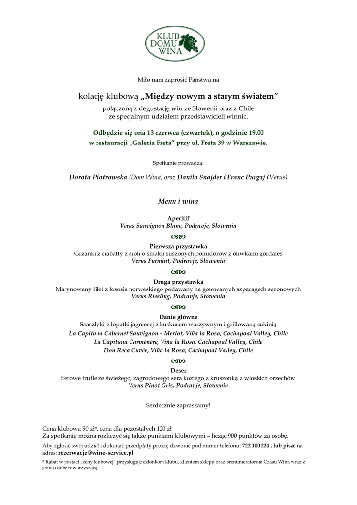 Miło nam zaprosić Państwa na kolację klubową „Między nowym a starym światem” połączoną z degustację win ze Słowenii oraz z Chile ze specjalnym udziałem przedstawicieli winnic. Odbędzie się ona 13 czerwca (czwartek), o godzinie 19.00 w restauracji „Galeria Freta” przy ul. Freta 39 w Warszawie. Spotkanie prowadzą: Dorota Piotrowska (Dom Wina) oraz Danilo Snajder i Franc Purgaj (Verus) Menu i wina Aperitif Verus Sauvignon Blanc, Podravje, Słowenia Pierwsza przystawka Grzanki z ciabatty z aioli o smaku suszonych pomidorów z oliwkami gordales Verus Furmint, Podravje, Słowenia Druga przystawka Marynowany filet z łososia norweskiego podawany na gotowanych szparagach sezonowych Verus Riesling, Podravje, Słowenia Danie główne Szaszłyki z łopatki jagnięcej z kuskusem warzywnym i grillowaną cukinią La Capitana Cabernet Sauvignon – Merlot, Viña la Rosa, Cachapoal Valley, Chile La Capitana Carménère, Viña la Rosa, Cachapoal Valley, Chile Don Reca Cuvée, Viña la Rosa, Cachapoal Valley, Chile Deser Serowe trufle ze świeżego, zagrodowego sera koziego z kruszonką z włoskich orzechów Verus Pinot Gris, Podravje, Słowenia Serdecznie zapraszamy! Cena klubowa 90 zł*, cena dla pozostałych 120 zł Za spotkanie można rozliczyć się także punktami klubowymi – licząc 900 punktów za osobę. Aby zgłosić swój udział i dokonać przedpłaty proszę dzwonić pod numer telefonu: 722 100 224 , lub pisać na adres: [email protected] * Rabat w postaci „ceny klubowej” przysługuje członkom klubu, klientom sklepu oraz prenumeratorom Czasu Wina wraz z jedną osobę towarzyszącą.