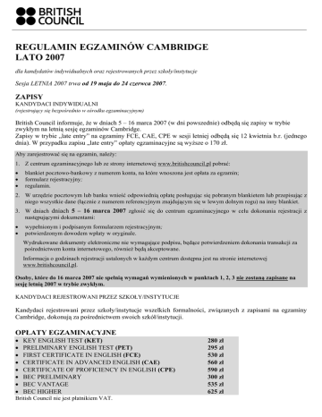 REGULAMIN EGZAMINÓW CAMBRIDGE LATO 2007 dla kandydatów indywidualnych oraz rejestrowanych przez szkoły/instytucje Sesja LETNIA 2007 trwa od 19 maja do 24 czerwca 2007. ZAPISY KANDYDACI INDYWIDUALNI (rejestrujący się bezpośrednio w ośrodku egzaminacyjnym) British Council informuje, że w dniach 5 – 16 marca 2007 (w dni powszednie) odbędą się zapisy w trybie zwykłym na letnią sesję egzaminów Cambridge. Zapisy w trybie „late entry” na egzaminy FCE, CAE, CPE w sesji letniej odbędą się 12 kwietnia b.r. (jednego dnia). W przypadku zapisu „late entry” opłaty egzaminacyjne są wyższe o 170 zł. Aby zarejestrować się na egzamin, należy: 1. Z centrum egzaminacyjnego lub ze strony internetowej www.britishcouncil.pl pobrać: • • • blankiet pocztowo-bankowy z numerem konta, na które wnoszona jest opłata za egzamin; formularz rejestracyjny; regulamin. 2. W urzędzie pocztowym lub banku wnieść odpowiednią opłatę posługując się pobranym blankietem lub przepisując z niego wszystkie dane (łącznie z numerem referencyjnym znajdującym się w lewym dolnym rogu) na inny blankiet. 3. W dniach dniach 5 – 16 marca 2007 zgłosić się do centrum egzaminacyjnego w celu dokonania rejestracji z następującymi dokumentami: • • wypełnionym i podpisanym formularzem rejestracyjnym; potwierdzonym dowodem wpłaty w oryginale. Wydrukowane dokumenty elektroniczne nie wymagające podpisu, będące potwierdzeniem dokonania transakcji za pośrednictwem konta internetowego, również będą akceptowane. Informacja o godzinach rejestracji ustalonych w każdym centrum dostępna jest na stronie internetowej www.britishcouncil.pl. Osoby, które do 16 marca 2007 nie spełnią wymagań wymienionych w punktach 1, 2, 3 nie zostaną zapisane na sesję letnią 2007 w trybie zwykłym. KANDYDACI REJESTROWANI PRZEZ SZKOŁY/INSTYTUCJE Kandydaci rejestrowani przez szkoły/instytucje wszelkich formalności, związanych z zapisami na egzaminy Cambridge, dokonują za pośrednictwem swoich szkół/instytucji. OPŁATY EGZAMINACYJNE • • • • • • • • KEY ENGLISH TEST (KET) PRELIMINARY ENGLISH TEST (PET) FIRST CERTIFICATE IN ENGLISH (FCE) CERTIFICATE IN ADVANCED ENGLISH (CAE) CERTIFICATE OF PROFICIENCY IN ENGLISH (CPE) BEC PRELIMINARY BEC VANTAGE BEC HIGHER British Council nie jest płatnikiem VAT. 280 zł 295 zł 530 zł 560 zł 590 zł 300 zł 535 zł 625 zł Jeżeli liczba kandydatów zarejestrowanych na dany egzamin w określonym centrum egzaminacyjnym nie osiągnie wymaganego przepisami University of Cambridge ESOL Examinations minimum, British Council, w miarę możliwości organizacyjnych, przeprowadzi ten egzamin w innym centrum egzaminacyjnym lub zwróci kandydatom wniesioną przez nich opłatę egzaminacyjną. W takim przypadku o przystąpieniu do egzaminu lub zwrocie pieniędzy decyduje kandydat. SZCZEGÓLNE UDOGODNIENIA a) Osoby niepełnosprawne Osoby wymagające szczególnych udogodnień (np. niedowidzące, niedosłyszące) powinny zgłosić swoje potrzeby przedstawicielowi centrum egzaminacyjnego przed dokonaniem wpłaty. Wymagane dokumenty z tym związane zaświadczenie lekarskie oraz wypełniony i podpisany formularz (druk dostępny w ośrodkach egzaminacyjnych) powinny być złożone podczas rejestracji. b) Dysleksja Osoby, które chcą ubiegać się o wydłużenie czasu egzaminów pisemnych o 25%, z powodu dysleksji, dysgrafii lub dysortografii powinny dostarczyć następujące dokumenty podczas rejestracji: 1. zaświadczenie z poradni psychologicznej, które musi: a) być wystawione nie wcześniej niż w marcu 2005 roku b) zawierać informację o stopniu zaawansowania dysleksji, dysgrafii lub dysortografii c) zawierać nazwy testów użytych w celu zdiagnozowania dysleksji, dysgrafii lub dysortografii; 2. wypełniony i podpisany formularz - druk dostępny w centrach egzaminacyjnych. Po zakończeniu rejestracji żadne dokumenty związane ze szczególnymi udogodnieniami nie będą uwzględniane. SESJA EGZAMINACYJNA Kandydaci, którzy do 16 maja nie otrzymają zawiadomienia o terminach i miejscach poszczególnych części egzaminów (Statement of Entry) proszeni są o niezwłoczny kontakt z centrum egzaminacyjnym, w którym są zarejestrowani na egzamin. W sesji letniej 2007 egzaminy odbędą się w następujących terminach: Egzamin Termin części pisemnych Zakres dat egzaminów ustnych i ze słuchu KET PET FCE 9 czerwca (sobota) 9 czerwca (sobota) 12 czerwca (wtorek, tylko w Warszawie i w Krakowie); 16 czerwca (sobota, we wszystkich centrach w Polsce) 13 czerwca (środa) 14 czerwca (czwartek) 26 maja (sobota) 2 czerwca (sobota) 19 maja (sobota) 1 - 11 czerwca 1 - 11 czerwca 21 maja - 24 czerwca CAE CPE BEC Preliminary BEC Vantage BEC Higher 21 maja - 24 czerwca 21 maja - 24 czerwca 19 - 28 maja 19 maja – 4 czerwca 19 – 21 maja Indywidualny plan sesji egzaminacyjnej dla każdego kandydata zostanie podany w zawiadomieniu o terminach i miejscach egzaminu (Statement of Entry). Na każdą część egzaminu należy stawić się: punktualnie (osoby, które się spóźnią, nie zostaną wpuszczone do sali egzaminacyjnej) z dowodem tożsamości (dokument z aktualnym zdjęciem) z zawiadomieniem o terminach i miejscach egzaminu (Statement of Entry) z ołówkiem, długopisem i gumką Zakazuje się przynoszenia na egzamin następujących przedmiotów: walkmanów, odtwarzaczy CD i MP3, przenośnych komputerów, dyktafonów i innego sprzętu elektronicznego. Prosimy również o nie przynoszenie przedmiotów wartościowych. TELEFONY KOMÓRKOWE W czasie trwania całego egzaminu telefony komórkowe muszą być wyłączone i złożone na biurku ekranem do dołu. Osoba korzystająca z telefonu komórkowego podczas egzaminu będzie zdyskwalifikowana. EGZAMIN USTNY Na potrzeby części ustnej egzaminu kandydaci dobierani są w pary przez pracowników centrum egzaminacyjnego i nie mogą sami wybierać osoby, z którą będą zdawać egzamin. Wszelkie uwagi dotyczące przebiegu 