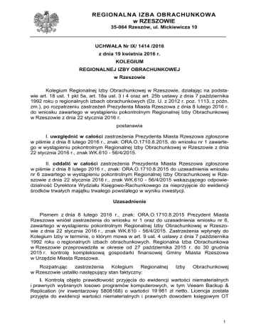 REGIONALNA IZBA OBRACHUNKOWA w RZESZOWIE 35-064 Rzeszów, ul. Mickiewicza 10 UCHWAŁA Nr IX/ 1414 /2016 z dnia 19 kwietnia 2016 r. KOLEGIUM REGIONALNEJ IZBY OBRACHUNKOWEJ w Rzeszowie Kolegium Regionalnej Izby Obrachunkowej w Rzeszowie, działając na podstawie art. 18 ust. 1 pkt 5a, art. 18a ust. 3 i 4 oraz art. 25b ustawy z dnia 7 października 1992 roku o regionalnych izbach obrachunkowych (Dz. U. z 2012 r. poz. 1113, z późn. zm.), po rozpatrzeniu zastrzeŜeń Prezydenta Miasta Rzeszowa z dnia 8 lutego 2016 r. do wniosku zawartego w wystąpieniu pokontrolnym Regionalnej Izby Obrachunkowej w Rzeszowie z dnia 22 stycznia 2016 r. postanawia I. uwzględnić w całości zastrzeŜenia Prezydenta Miasta Rzeszowa zgłoszone w piśmie z dnia 8 lutego 2016 r., znak: ORA.O.1710.8.2015, do wniosku nr 1 zawartego w wystąpieniu pokontrolnym Regionalnej Izby Obrachunkowej w Rzeszowie z dnia 22 stycznia 2016 r., znak WK.610 - 56/4/2015. II. oddalić w całości zastrzeŜenia Prezydenta Miasta Rzeszowa zgłoszone w piśmie z dnia 8 lutego 2016 r., znak: ORA.O.1710.8.2015 do uzasadnienia wniosku nr 6 zawartego w wystąpieniu pokontrolnym Regionalnej Izby Obrachunkowej w Rzeszowie z dnia 22 stycznia 2016 r., znak WK.610 - 56/4/2015 wskazującego odpowiedzialność Dyrektora Wydziału Księgowo-Rachunkowego za nieprzyjęcie do ewidencji środków trwałych majątku trwałego powstałego w wyniku inwestycji. Uzasadnienie Pismem z dnia 8 lutego 2016 r., znak: ORA.O.1710.8.2015 Prezydent Miasta Rzeszowa wniósł zastrzeŜenia do wniosku nr 1 oraz do uzasadnienia wniosku nr 6, zawartego w wystąpieniu pokontrolnym Regionalnej Izby Obrachunkowej w Rzeszowie z dnia 22 stycznia 2016 r., znak WK.610 - 56/4/2015. ZastrzeŜenia wpłynęły do Kolegium Izby w terminie, o którym mowa w art. 9 ust. 4 ustawy z dnia 7 października 1992 roku o regionalnych izbach obrachunkowych. Regionalna Izba Obrachunkowa w Rzeszowie przeprowadziła w okresie od 27 października 2015 r. do 30 grudnia 2015 r. kontrolę kompleksową gospodarki finansowej Gminy Miasta Rzeszowa w Urzędzie Miasta Rzeszowa. Rozpatrując zastrzeŜenia Kolegium Regionalnej w Rzeszowie ustaliło następujący stan faktyczny: Izby Obrachunkowej I. Kontrolą objęto prawidłowość przyjęcia do ewidencji wartości niematerialnych i prawnych wybranych losowo programów komputerowych, w tym Veeam Backup & Replication (nr inwentarzowy 5808168) o wartości 19 981 zł netto. Licencja została przyjęta do ewidencji wartości niematerialnych i prawnych dowodem księgowym OT 1 „Przyjęcie środka trwałego” nr 12/OT/03/2014 z dnia 31 marca 2014 r. Ustalono, Ŝe zakupiona licencja została ujęta na koncie 020 w wartości netto (bez podatku od towarów i usług), co było niezgodne zarówno z przepisem z art. 28 ust. 1 pkt. 1 i art. 33 ust. 1 ustawy z dnia 29 września 1994 r. o rachunkowości (Dz. U. z 2013 r. poz. 330 z późn. zm.) jak i § 4 ust. 1 Zasad prowadzenia rachunkowości w Urzędzie Miasta Rzeszowa – jednostka budŜetowa, wprowadzonych Zarządzeniem Nr 49/2012 Prezydenta Miasta Rzeszowa z dnia 13 sierpnia 2012 r., zgodnie z którym „wartości niematerialne nabyte z własnych środków wprowadza się do ewidencji w cenie nabycia (cena obejmuje równieŜ niepodlegający odliczeniu podatek od towarów i usług)”; Na podstawie wyników kontroli Regionalna Izba Obrachunkowa w Rzeszowie w wystąpieniu pokontrolnym z dnia 22 stycznia 2016 r., znak WK.610 - 56/4/2015 „W zakresie księgowości i sprawozdawczości budŜetowej” wskazała jako nieprawidłowość „Ujęcie na koncie 020 – „Wartości niematerialne i prawne” ewidencji księgowej Urzędu Miasta Rzeszowa, zakupionej w 2014 r. licencji Veeam Backup & Replication wg wartości netto, tj. bez uwzględnienia podatku od towarów i usług. Odpowiedzialność za nieprawidłowość ponosi Inspektor Wydziału Księgowo-Rachunkowego oraz z tytułu nadzoru Zastępca Dyrektora tego Wydziału. Regionalna Izba Obrachunkowa w Rzeszowie w przywołanym wystąpieniu pokontrolnym sformułowała wniosek nr 1 o treści: „Zakupione licencje i programy komputerowe naleŜy wprowadzać do ewidencji księgowej wartości niematerialnych i prawnych w cenie nabycia, obejmującej niepodlegający odliczeniu podatek od towarów i usług, zgodnie z art. 28 ust. 1 pkt. 1 i art. 33 ust.1 ustawy z dnia 29 września 1994 r. o rachunkowości (tekst jednolity: Dz. U. z 2013 r. poz. 330 z późn. zm.) oraz § 4 ust. 1 „Zasad prowadzenia rachunkowości w Urzędzie Miasta Rzeszowa”, wprowadzonych Zarządzeniem Nr 49/2012 Prezydenta Miasta Rzeszowa z dnia 13 sierpnia 2012 roku.” Prezydent Miasta Rzeszowa w zastrzeŜeniach do wniosku nr 1 zarzucił niewłaściwe zastosowanie normy prawnej wynikającej z treści przepisu art. 28 ust. 2 ustawy z dnia 28 września 1994 r. o rachunkowości (Dz. U. z 2013 r. poz. 330 z późn. zm.). Według wnoszącego zastrzeŜenie błędnie wskazano równieŜ art. 33 ust. 1 ww. ustawy, który w rozpatrywanym zakresie nie ma zastosowania. Uzasadniając swój pogląd Prezydent Miasta Rzeszowa stwierdził, Ŝe „Kwestionowany wniosek zobowiązujący do wprowadzania zakupionych licencji i programów komputerowych do ewidencji księgowej wartości niematerialnych i prawnych w cenie nabycia, obejmującej niepodlegający odliczeniu podatek od towarów i usług, w zakresie jakim dotyczy zakupionej w 2014 r. licencji Veeam Backup & Replication, jest nieprawidłowy. NaleŜy wskazać, Ŝe podmiot kontrolowany w transakcji zakupu wyŜej wymienionej licencji skorzystał z prawa do odliczenia podatku naliczonego. Skoro zatem od wskazanego zakupu dokonano odliczenia podatku VAT, to słusznie w ewidencji księgowej Urzędu Miasta Rzeszowa ujęto na koncie 020 - „Wartości niematerialne i prawne" zakupioną w 2014 r. licencję Veeam Backup & Replication. Mając na względzie wyjaśnienie tego zagadnienia Regionalna Izba Obrachunkowa zwróciła się w dniu 11 marca 2016 r. do Prezydenta Miasta Rzeszo