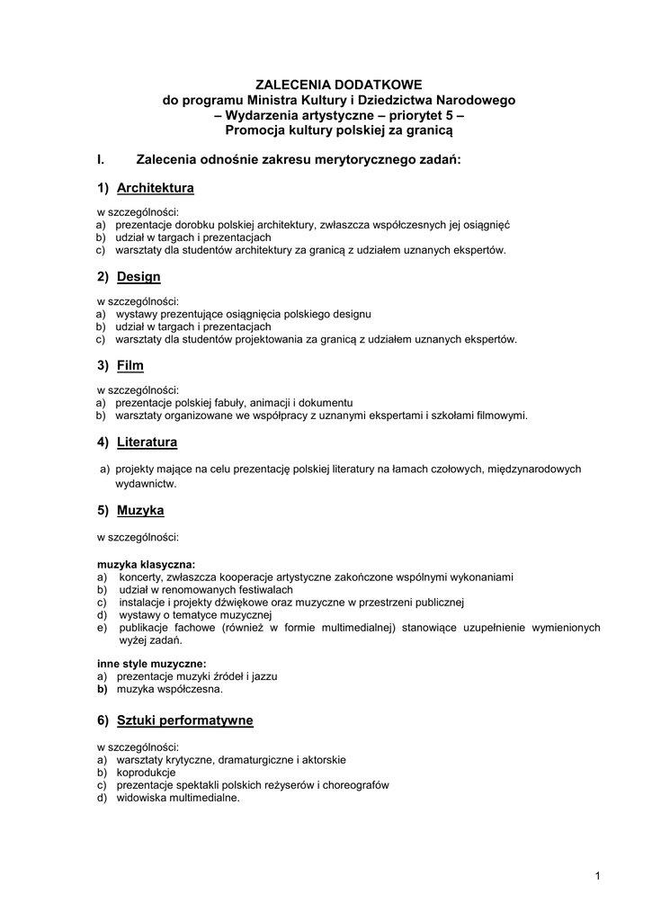 ZALECENIA DODATKOWE do programu Ministra Kultury i Dziedzictwa Narodowego – Wydarzenia artystyczne – priorytet 5 – Promocja kultury polskiej za granicą I. Zalecenia odnośnie zakresu merytorycznego zadań: 1) Architektura w szczególności: a) prezentacje dorobku polskiej architektury, zwłaszcza współczesnych jej osiągnięć b) udział w targach i prezentacjach c) warsztaty dla studentów architektury za granicą z udziałem uznanych ekspertów. 2) Design w szczególności: a) wystawy prezentujące osiągnięcia polskiego designu b) udział w targach i prezentacjach c) warsztaty dla studentów projektowania za granicą z udziałem uznanych ekspertów. 3) Film w szczególności: a) prezentacje polskiej fabuły, animacji i dokumentu b) warsztaty organizowane we współpracy z uznanymi ekspertami i szkołami filmowymi. 4) Literatura a) projekty mające na celu prezentację polskiej literatury na łamach czołowych, międzynarodowych wydawnictw. 5) Muzyka w szczególności: muzyka klasyczna: a) koncerty, zwłaszcza kooperacje artystyczne zakończone wspólnymi wykonaniami b) udział w renomowanych festiwalach c) instalacje i projekty dźwiękowe oraz muzyczne w przestrzeni publicznej d) wystawy o tematyce muzycznej e) publikacje fachowe (również w formie multimedialnej) stanowiące uzupełnienie wymienionych wyżej zadań. inne style muzyczne: a) prezentacje muzyki źródeł i jazzu b) muzyka współczesna. 6) Sztuki performatywne w szczególności: a) warsztaty krytyczne, dramaturgiczne i aktorskie b) koprodukcje c) prezentacje spektakli polskich reżyserów i choreografów d) widowiska multimedialne. 1 7) Sztuki wizualne w szczególności: a) projekty obejmujące prezentację sztuki, tworzące platformę dla działań eksponujących zwłaszcza podobieństwa i wspólne inspiracje b) projekty realizowane w przestrzeni miejskiej (akcje artystyczne, site-specific i inne) c) warsztaty, publikacje i konferencje uzupełniające projekty artystyczne. artystycznych 8) Inne a) projekty realizowane z użyciem nowych mediów, mające na celu włączenie kultury polskiej i polskich twórców w obieg międzynarodowy b) szczególnie istotne dla realizacji celów programu będą też projekty interdyscyplinarne umiejętnie łączące wybrane spośród wskazanych wyżej zakresów merytorycznych. II. Pozostałe zalecenia odnośnie zakresu merytorycznego zadań: Obok rekomendacji wymienionych dla poszczególnych dziedzin warto także mieć na uwadze: a) traktowanie kontekstu historycznego jako podstawy do budowania intelektualnie mocnych i wartościowych projektów we wszystkich dziedzinach b) realizacja projektów powinna się odbywać z poszanowaniem kontekstu społeczno–kulturowego c) położenie nacisku na realizację wspólnych projektów; zaangażowanie obu stron zarówno merytoryczne jak i finansowe wpłynie na skuteczną realizację projektów tak od strony produkcyjnej jak i komunikacyjnej d) wypracowanie projektów, które zainicjują kolejne wydarzenia i przełożą się na długoletnią współpracę e) położenie nacisku na projekty skierowane do młodego pokolenia. III. Priorytety geograficzne a) b) c) Kraje europejskie: Niemcy, Francja, kraje basenu Morza Bałtyckiego Kraje Partnerstwa Wschodniego Kraje pozaeuropejskie: Japonia, Indie, Chiny, Brazylia, Izrael Uzasadnienie: Niemcy i Francja są jednymi z najważniejszych partnerów gospodarczych i kulturalnych Polski. Kraje basenu Morza Bałtyckiego to obszar priorytetowy MKiDN na lata 2014 – 2016 w związku z objęciem przez Polskę koordynacji Obszaru Priorytetowego Kultura w Strategii UE dla Regionu Morza Bałtyckiego. Powodem są także przygotowania (w 2014 r.) oraz objęcie Prezydencji w Radzie Państw Morza Bałtyckiego w 2015-2016 r. Kraje Partnerstwa Wschodniego są priorytetem polskiej polityki zagranicznej, a dzięki coraz większej liczbie projektów kulturalnych, inicjowanych przez Polskę, można zaobserwować rozwój kontaktów i aktywizację współpracy społeczno-kulturalnej. Rok 2014 będzie, z inicjatywy premierów krajów Grupy Wyszehradzkiej, „Rokiem Wymiany V4+Japonia”. Ponadto, trwające negocjacje nad EU-Japan Strategic Partnership Agreement, liczne wizyty na szczeblu rządowym oraz rocznica powstania Muzeum Sztuki i Techniki Japońskiej Manggha w 2014 r. tworzą dobre czynniki do realizacji projektów kulturalnych w tym kraju. Z kolei Indie, Chiny i Brazylia, to kraje, w których odbywać się będą sezony kultury polskiej w następnych latach. Współpraca z Izraelem natomiast związana będzie z planowanym otwarciem Muzeum Historii Żydów Polskich a także intensyfikacją projektów kulturalnych po polsko-izraelskich konsultacjach międzyrządowych. 2