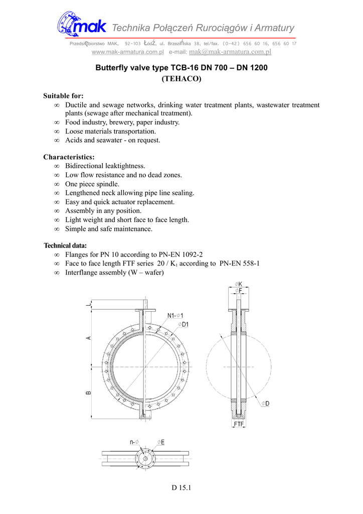 Technika Połączeń Rurociągów i Armatury Przedsiębiorstwo MAK, 92-103 Łódź, ul. Brzezińska 38, tel/fax. (0-42) 656 60 16, 656 60 17 www.mak-armatura.com.pl e-mail: [email protected] Butterfly valve type TCB-16 DN 700 – DN 1200 (TEHACO) Suitable for: • Ductile and sewage networks, drinking water treatment plants, wastewater treatment plants (sewage after mechanical treatment). • Food industry, brewery, paper industry. • Loose materials transportation. • Acids and seawater - on request. Characteristics: • Bidirectional leaktightness. • Low flow resistance and no dead zones. • One piece spindle. • Lengthened neck allowing pipe line sealing. • Easy and quick actuator replacement. • Assembly in any position. • Light weight and short face to face length. • Simple and safe maintenance. Technical data: • Flanges for PN 10 according to PN-EN 1092-2 • Face to face length FTF series 20 / K1 according to PN-EN 558-1 • Interflange assembly (W – wafer) D 15.1 Technika Połączeń Rurociągów i Armatury Przedsiębiorstwo MAK, 92-103 Łódź, ul. Brzezińska 38, tel/fax. (0-42) 656 60 16, 656 60 17 www.mak-armatura.com.pl e-mail: [email protected] Material specification: Name Material* Body Disk Spindle Grey cast iron EN-GJL-250 /nodular cast iron EN-GJS-500, epoxy coated Nodular cast ironEN-GJS-500 + Ni , nickel coated Stainless steel Seal EPDM / NBR Bearing Bronze *other materials available on request. Diameters and sizes table: DN Pr FTF A 165 190 203 216 254 624 672 720 800 941 [Mpa] 700 800 900 1000 1200 1.0 1.0 1.0 1.0 1.0 DN 700 800 900 1000 1200 B ∅D ∅ D1 695.0 794.7 864.7 965.0 1160.6 840 950 1050 1160 1380 N1 - ∅1 PN10 [mm] ISO 5211 n-∅ F25 F25 F25 F25 F30 8-M16 8-M16 8-M16 8-M16 8-M20 520 591 656 721 864 [kg] Actuator connection ∅K ∅E ∅F [mm] 300 254 63.4 300 254 63.4 300 254 75.0 300 254 85.0 350 298 105.0 D 15.2 Weight 24-M27 24-M30 28-M30 28-M33 32-M36 L 66 66 118 142 150 533 693 886 973 1157