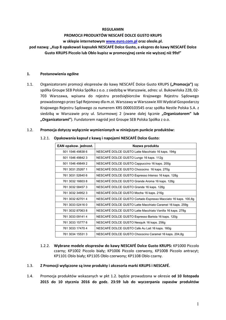 REGULAMIN PROMOCJI PRODUKTÓW NESCAFÉ DOLCE GUSTO KRUPS w sklepie internetowym www.euro.com.pl oraz oleole.pl. pod nazwą: „Kup 8 opakowań kapsułek NESCAFÉ Dolce Gusto, a ekspres do kawy NESCAFÉ Dolce Gusto KRUPS Piccolo lub Oblo kupisz w promocyjnej cenie nie wyższej niż 99zł” 1. Postanowienia ogólne 1.1. Organizatorami promocji ekspresów do kawy NESCAFÉ Dolce Gusto KRUPS („Promocja”) są: spółka Groupe SEB Polska Spółka z o.o. z siedzibą w Warszawie, adres: ul. Bukowińska 22B, 02703 Warszawa, wpisana do rejestru przedsiębiorców Krajowego Rejestru Sądowego prowadzonego przez Sąd Rejonowy dla m.st. Warszawy w Warszawie XIII Wydział Gospodarczy Krajowego Rejestru Sądowego za numerem KRS 0000103545 oraz spółka Nestle Polska S.A. z siedzibą w Warszawie przy ul. Szturmowej 2 (zwane dalej łącznie „Organizatorem” lub „Organizatorami”). Fundatorem nagród jest Groupe SEB Polska Spółka z o.o. 1.2. Promocja dotyczy wyłącznie wymienionych w niniejszym punkcie produktów: 1.2.1. Opakowania kapsuł z kawą i napojami NESCAFÉ Dolce Gusto: EAN opakow. jednost. Nazwa produktu 501 1546 49838 6 NESCAFÉ DOLCE GUSTO Latte Macchiato 16 kaps. 194g 501 1546 49842 3 NESCAFÉ DOLCE GUSTO Lungo 16 kaps. 112g 501 1546 49849 2 NESCAFÉ DOLCE GUSTO Cappuccino 16 kaps. 200g 761 3031 25267 1 NESCAFÉ DOLCE GUSTO Chococino 16 kaps. 270g 761 3031 52640 6 NESCAFÉ DOLCE GUSTO Espresso Intenso 16 kaps. 128g 761 3032 16603 8 NESCAFÉ DOLCE GUSTO Grande Aroma 16 kaps. 128g 761 3032 58457 3 NESCAFÉ DOLCE GUSTO Grande 16 kaps. 128g 761 3032 34952 3 NESCAFÉ DOLCE GUSTO Mocha 16 kaps. 216g 761 3032 82701 4 NESCAFÉ DOLCE GUSTO Cortado Espresso Macciato 16 kaps. 100,8g 761 3033 02416 0 NESCAFÉ DOLCE GUSTO Latte Macchiato Caramel 16 kaps. 259g 761 3032 87063 8 NESCAFÉ DOLCE GUSTO Latte Macchiato Vanilla 16 kaps. 278g 761 3033 09141 4 NESCAFÉ DOLCE GUSTO Espresso Barista 16 kaps. 120g 761 3033 15777 6 NESCAFÉ DOLCE GUSTO Nesquik 16 kaps. 256g 761 3033 17470 4 NESCAFÉ DOLCE GUSTO Cafe Au Lait 16 kaps. 160g 761 3034 15531 3 NESCAFÉ DOLCE GUSTO Chococino Caramel 16 kaps. 204,8g 1.2.2. Wybrane modele ekspresów do kawy NESCAFÉ Dolce Gusto KRUPS: KP1000 Piccolo czarny; KP1002 Piccolo biały; KP1006 Piccolo czerwony, KP100B Piccolo antracyt; KP1101 Oblo biały; KP1105 Oblo czerwony; KP1108 Oblo czarny. 1.3. Z Promocji wyłączone są inne produkty i akcesoria marki KRUPS i NESCAFÉ. 1.4. Promocja produktów wskazanych w pkt 1.2. będzie prowadzona w okresie od 10 listopada 2015 do 10 stycznia 2016 do godz. 23:59 lub do wyczerpania zapasów produktów 1 promocyjnych NESCAFÉ Dolce Gusto KRUPS („Okres Promocji”), w sklepie internetowym www.euro.com.pl oraz oleole.pl. 1.5. Informacja o wyczerpaniu zapasów produktów objętych Promocją będzie dostępna w Punktach Sprzedaży. 1.6. Miejscem Promocji jest terytorium Rzeczypospolitej Polskiej. 2. Zasady udziału w Promocji 2.1. Uczestnikami Promocji mogą być wyłącznie pełnoletnie osoby fizyczne, zamieszkałe na terytorium Rzeczypospolitej Polskiej, posiadające pełną zdolność do czynności prawnych oraz dokonujące zakupu produktu objętego Promocją jako osoba fizyczna, a nie jako przedsiębiorca w rozumieniu art. 4 Ustawy o swobodzie działalności gospodarczej („Uczestnik”). 2.2. Uczestnictwo w Promocji jest dobrowolne. 2.3. Każdy Uczestnik może wziąć udział w Promocji wielokrotnie, spełniając wszystkie warunki konieczne uczestnictwa w Promocji. 2.4. Warunkiem koniecznym udziału w Promocji jest dokonanie przez Uczestnika w okresie trwania Promocji, w sklepie internetowym www.euro.com.pl, jednorazowego zakupu 8 sztuk dowolnych opakowań kapsuł z kawą i napojami NESCAFÉ Dolce Gusto, wymienionych w pkt 1.2.1. niniejszego Regulaminu. 2.5. Po spełnieniu warunku wymienionego w punkcie 2.4. niniejszego Regulaminu, Uczestnikowi Promocji przysługuje prawo do zakupu ekspresu NESCAFÉ Dolce Gusto KRUPS, biorącego udział w Promocji (tj.: KP1000 Piccolo czarny; KP1002 Piccolo biały; KP1006 Piccolo czerwony, KP100B Piccolo antracyt; KP1101 Oblo biały; KP1105 Oblo czerwony; KP1108 Oblo czarny) w promocyjnej cenie nie wyższej niż 99zł brutto. Aby Uczestnik uzyskał prawo do zakupu ekspresu w promocyjnej cenie, 8 opakowań kapsułek NESCAFÉ Dolce Gusto i ekspres NESCAFÉ Dolce Gusto KRUPS, biorące udział w Promocji muszą być zakupione w ramach jednorazowego zakupu. 2.6. W przypadku skorzystania przez Uczestnika z prawa do odstąpienia od umowy zakupu ekspresu objętego niniejszą promocją bez podawania przyczyn, Uczestnik zobowiązany będzie do niezwłocznego zwrotu kaw i napojów, które zgodnie z pkt. 2.5. zostały mu wydane nieodpłatnie. Zwrot kapsułek kaw i napojów powinien nastąpić w ramach przesyłki zawierającej ekspres, zwracany przez Uczestnika w wykonaniu ww. prawa odstąpienia. 2 3. Postępowanie reklamacyjne 3.1. Reklamacje dotyczące przebiegu Promocji mogą być zgłaszane na adres Serwisu Konsumenta Nestlé, ul. Łódzka 153, 62-800 Kalisz, telefonicznie na numer 800 174 902 lub mailowo na adres [email protected] 3.2. Prawo złożenia reklamacji przysługuje jedynie Uczestnikowi Promocji przez cały Okres Promocji oraz przez 21 dni kalendarzowych po zakończeniu Okresu Promocji. 3.3. Reklamacja powinna zawierać imię, nazwisko, numer telefonu lub adres e-mail Uczestnika Promocji jak również opis i wskazanie przyczyny reklamacji. 3.4. Reklamacje rozpatrywane będą przez Komisję powołaną przez Organizatorów Promocji w terminie 14 dni kalendarzowych od dnia otrzymania reklamacji. Uczestnik zostanie powiadomiony o decyzji Komisji w sprawie jego reklamacji telefonicznie lub mailowo. 3.5. Po wyczerpaniu postępowania reklamacyjnego Uczestnikowi przysługuje prawo do dochodzenia nieuwzględnionych roszczeń na drodze postępowania sądowego. 4. Przetwarzanie danych osobowych 4.1. Uczestnik Promocji, w celu złożenia reklamacji dotyczącej przebiegu Promocji, o czym mowa w pkt 3 Re