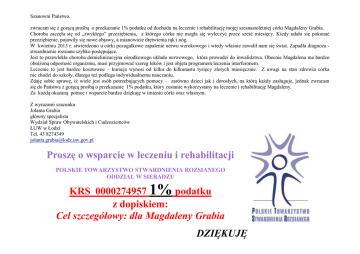 Szanowni Państwo, zwracam się z gorącą prośbą o przekazanie 1% podatku od dochodu na leczenie i rehabilitację mojej szesnastoletniej córki Magdaleny Grabia. Choroba zaczęła się od „zwykłego” przeziębienia, z którego córka nie mogła się wyleczyć przez sześć miesięcy. Kiedy udało się pokonać przeziębienie, pojawiły się nowe objawy, a mianowicie drętwienia rąk i nóg. W kwietniu 2013 r. stwierdzono u córki pozagałkowe zapalenie nerwu wzrokowego i wtedy właśnie zawalił nam się świat. Zapadła diagnoza stwardnienie rozsiane szybko postępujące. Jest to przewlekła choroba demielinizacyjna ośrodkowego układu nerwowego, która prowadzi do inwalidztwa. Obecnie Magdalena ma bardzo obniżoną odporność organizmu, musi przyjmować szereg leków i jest objęta programem leczenia interferonem. Leczenie to jest bardzo kosztowne – kuracja wynosi od kilku do kilkunastu tysięcy złotych miesięcznie. Z uwagi na stan zdrowia córka nie chodzi do szkoły, dlatego też podlega indywidualnemu nauczaniu. Zdaję sobie sprawę, iż wiele jest osób potrzebujących pomocy – zarówno dzieci jak i dorosłych, na którą każdy zasługuje, jednak zwracam się do Państwa z gorącą prośbą o przekazanie 1% podatku, który zostanie wykorzystany na leczenie i rehabilitację Magdaleny. Za każdą okazaną pomoc i wsparcie bardzo dziękuję w imieniu córki oraz własnym. Z wyrazami szacunku Jolanta Grabia główny specjalista Wydział Spraw Obywatelskich i Cudzoziemców ŁUW w Łodzi Tel. 43 8274349 [email protected] Proszę o wsparcie w leczeniu i rehabilitacji POLSKIE TOWARZYSTWO STWARDNIENIA ROZSIANEGO ODDZIAŁ W SIERADZU KRS 0000274957 1% podatku z dopiskiem: Cel szczegółowy: dla Magdaleny Grabia DZIĘKUJĘ