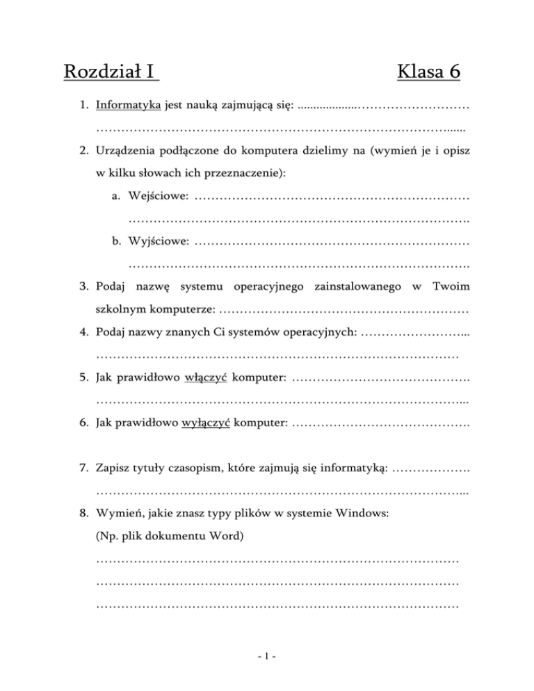 Rozdział I Klasa 6 1. Informatyka jest nauką zajmującą się: ...................……………………… …………………………………………………………………………...... 2. Urządzenia podłączone do komputera dzielimy na (wymień je i opisz w kilku słowach ich przeznaczenie): a. Wejściowe: ………………………………………………………… ………………………………………………………………………. b. Wyjściowe: ………………………………………………………… ………………………………………………………………………. 3. Podaj nazwę systemu operacyjnego zainstalowanego w Twoim szkolnym komputerze: …………………………………………………… 4. Podaj nazwy znanych Ci systemów operacyjnych: ……………………... …………………………………………………………………………… 5. Jak prawidłowo włączyć komputer: ……………………………………. ……………………………………………………………………………... 6. Jak prawidłowo wyłączyć komputer: ……………………………………. 7. Zapisz tytuły czasopism, które zajmują się informatyką: ………………. ……………………………………………………………………………... 8. Wymień, jakie znasz typy plików w systemie Windows: (Np. plik dokumentu Word) …………………………………………………………………………… …………………………………………………………………………… …………………………………………………………………………… -1- 9. Uzupełnij zdania: a. Plik to: ……………………………………………………………... b. Katalog, inaczej nazywany……………… to……………………… ………………………………………………………………………. c. Pliki i katalogi zapisane w pamięci komputera mają postać: …… …………………………………………………………………………. 10. Podaj jednostkę, w jakiej podaje się rozmiar pliku: ………………….. 11. Podaj rozmiar pustego katalogu: ……………………………………… 12. Wypisz, co przeszkadza Ci w pracy na komputerze a co pomaga: a. Przeszkadza: ……………………………………………………….. ………………………………………………………………………. b. Pomaga: …………………………………………………………… ………………………………………………………………………. 13. Omów zjawisko i zagrożenia związane z uzależnieniem od komputera: …………………………………………………………………………… …………………………………………………………………………….. 14. Wymień programy komputerowe, których kopiowanie nie jest kradzieżą: ………………………………………………………………... ……………………………………………………………………………... 15. Wyjaśnij pojęcia a. Prawo autorskie: …………………………………………………... ………………………………………………………………………. b. Programy freeware: ……………………………………………….. ………………………………………………………………………. -2- c. Programy shareware: ……………………………………………… ………………………………………………………………………. 16. * Czy możliwe jest zrobienie własnej kopii płyty instalacyjnej Windows? Czy licencja Microsoft zezwala na to? ……………………… ……………………………………………………………………………... 17. Wyjaśnij: Licencja to ………………………………………………………….. ………………………………………………………………………. 18. Co oznacza zwrot piractwo komputerowe? …………………………………………………………………………… ……………………………………………………………………………. 19. Co to jest wirus komputerowy? …………………………………………………………………………… ……………………………………………………………………………. 20. Dokończ zdanie: Program antywirusowy to program, którego zadaniem jest: …………... …………………………………………………………………………….. …………………………………………………………………………….. 21. Wymień kilka zasad profilaktyki antywirusowej: ……………………… ……………………………………………………………………………... ....................................................................................................................... 22. Wymień kilka możliwych skutków braku ochrony antywirusowej na komputerze: ………………………………………………………………. …………………………………………………………………………… …………………………………………………………………………… -3- 23. Jak uniknąć „zarażenia” wirusem komputerów domowych? …………………………………………………………………………… …………………………………………………………………………… 24. Wymień w punktach kilka zasad regulaminu pracowni komputerowej w Twojej szkole: ………………………………………………………….. ……………………………………………………………………………... ………………………………