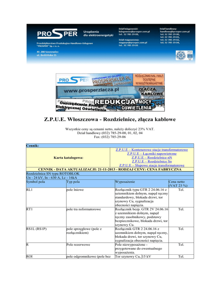 Z.P.U.E. Włoszczowa - Rozdzielnice, złącza kablowe Wszystkie ceny są cenami netto, należy doliczyć 23% VAT. Dział handlowy (032) 785-29-00, 01, 02, 04 Fax: (032) 785-29-06 Cennik: Z.P.U.E – Kontenerowe stacje transformatorowe Z.P.U.E – Łączniki napowietrzne Z.P.U.E – Rozdzielnice nN Karta katalogowa: Z.P.U.E – Rozdzielnice Sn Z.P.U.E – Słupowe stacje transformatorowe CENNIK - DATA AKTUALIZACJI: 21-11-2013 - RODZAJ CENY: CENA FABRYCZNA Rozdzielnica SN typu ROTOBLOK Un - 24 kV, In - 630 A, Lc - 16kA Symbol pola Typ pola Wyposażenie Cena netto (VAT 23 %) RL1 pole lniowe Rozłącznik typu GTR 2 24.06.16 z Tel. uziemnikiem dolnym, napęd ręczny standardowy, blokada drzwi, tor szynowy Cu, sygnalizacja obecności napięcia. RT1 pole tra nsformatorowe Rozłącznik bezp. GTR 2V 24.06.16 Tel. z uzemnikiem dolnym, napęd ręczny zasobnikowy, podstawy bezpiecznikowe, blokada drzwi, tor szynowy Cu. RS1L (RS1P) pole sprzęgłowe (pole z Rozłącznik GTR 2 24.06.16 z Tel. rozłącznikiem) uzemnikiem dolnym, napęd ręczny, blokada drzwi, tor szynowy Cu, sygnalizacja obecności napięcia. R Pole rezerwowe Pole niewyposażone Tel. przygotowane do ewentualnego wyposażenia. ROI pole odgromnikowe (pole bez Tor szynowy Cu, 15 kV Tel. aparatu) RLOS pole lniowe z odgromnikami RP1 pole pomiarowe RSP3L (RSP3P) pole pomiarowo-sekcyjne ograniczniki przepięć typ GXC-23; GXE23; Poim D-18 L. Wyposażenie: jak 24 kV wyżej lecz ograniczniki przepięć typ GXC-30; GXE30; Polim D-24 L. Rozłącznik GTR 15 kV 2 24.06.16 z uzemnikiem dolnym, napęd ręczny, blokada drzwi, tor szynowy Cu, sygnalizacja obecności napięcia ograniczniki przepięć typ GXC-23; GXE23; Poim D-18 L. Wyposażenie: jak 24 kV wyżej lecz ograniczniki przepięć typ GXC-30; GXE30; Polim D-24 L. Odłącznik GTR 4 6/15/24kV 24.06.16 z uzemnikiem dolnym, napęd ręczny, blokada drzwi, tor szynowy Cu, przekładniki prądowe IMZ szt. 3, przekładnik napięciowy UMZ szt. 3, podstawy bezpiecznikowe PBM 20 szt. 3, wkładki bezpiecznikowe WBP 20 szt. 3. Odłącznik GTR 4 6/15/24kV 24.06.16 uzemnikiem dolnym, napęd ręczny standardowy, blokada drzwi, tor szynowy Cu, sygnalizacja obecności napięcia Tel. Tel. Tel. Tel. Tel. przekładniki prądowe IMZ szt. 3, napięciowy UMZ szt. 3, podst. bezp. P Rozdzielnica SN typu ROTOBLOK Pola z napędem silnikowym Un - 24 kV, In - 630 A, Iis - 16k A Sygnały sterowania rozłącznikiem (zał/wył) wyprowadzone na istwę w górnej nadbudówce pola. Układ sterowania oraz układ UPS - wyposażenie dodatkowe. Rodzaj pola Wyposażenie Cena netto (VAT 23 %) RLM pole liniowe z napędem Rozłącznik ypu GTR 3 Tel. silnikowym 24.06.16 z uzemnikiem dolnym, napęd silnikowy, blokada drzwi, or szynowy Cu, sygnalizacja obecności napięcia. RSM Pole sprzęgłowe z napędem Rozłącznik bezp. GTR 3 Tel. silnikowym 24.06.16 z uzemnikiem dolnym, napęd silnikowy, blokada drzwi, or szynowy Cu, sekcyjny układ szynowania. dodatkowe do rozdzielnicy SN typu ROTOBLOK Rodzaj Opis Cena netto (VAT 23 %) Sygnazacja napięcia ożliwość zamontowania sygnalizacji Tel. napięcia w polu np. ansformatorowym, sekcyjnym (zainstalowany komplet rzech izolatorów z pojemnościowym dzelnikiem napięcia i neonowym wskaźnikiem z gniazdem). Zdane wyłączanie pola Zamontowany wyzwalacz napięciowy w Tel. transformatorowego cewką ozłączniku bezpiecznikowym napięciową (możliwość zdalnego wyłączania pola ansformatorowego mpulsem napięciowym). UPS Układ awaryjnego zasilania stosowany w Tel. polu ozłącznikowym z napędem silnikowym ub polu wyłącznikowym, zasilający max 3 pola. Sygnazator CPZ3M ZAE Sygnalizator przepływu prądów zwarcia Tel. Wrocław ypu CPZ 3, umożliwający szybką okalizację mejsca uszkodzenia. Sygnazator SMZ2 Time Net Sygnalizator przepływu prądów zwarcia Tel. Łódź ypu SMZ-2 (standard ZEK Kraków), umożliwiający szybką okalizację mejsca uszkodzenia. Sygnazator SZK-1 Softin Sygnalizator przepływu prądów zwarcia Tel. Wrocław ypu SZK-1 (standard ZE Wrocław), umożliwiający szybką okalizację mejsca uszkodzenia. Uzgadniacz faz Uzgadniacz faz typu WNF Tel. Rozdzielnica SN typu Mm-W/20 (Rozłącz ni ki O R 4. 51 Un - 24 kV: In - 630 A Lc - 16kA Typ pola Symbol pola Wyposażenie pole lniowe LI pole transformatorowe Tl Pole odgromnikowe 15 kV Ol Pole odgromnikowe 24 kV Ol Cena netto (VAT 23 %) Tel. Tel. Tel. Tel. pole pomiarowe PI Po g sckcii (na odłączniku) Po g sckcii (na rozłączniku) pole rezerwowe SI OR4 24PU2. OR 5 24 P2A. OW I + GXC 23, GXE 23. OW I + GXC 30, GXE 30, POLIM D-24. OW I 20/6-2/160/NRK + przekł. 3 nap. 3 prąd. 20 kV. OW I 20/6-2/160/NRK. S2 OR4 24PU2. Tel. R Pole niewyposażone. Tel. Tel. Tel. Wyposażenie dodatkowe do rozdzielnic SN typu Mm/W-20 Rodzaj Opis Cena netto (VAT 23 %) Sygnazacja napięcia ożliwość zamontowania sygnalizacji Tel. napięcia w polu np. ansformatorowym, sekcyjnym (zainstalowany komplet rzech izolatorów z pojemnościowym dzelnikiem napięcia i neonowym wskaźnikiem z gniazdem). Sygnazator CPZ3M ZAE Sygnalzator przepływu prądów zwarcia Tel. Wrocław typu CPZ 3, umożliwający szybką okalzację mejsca uszkodzenia. Sygnazator SMZ2 Time Net Sygnalzator przepływu prądów zwarcia Tel. Łódź typu SMZ-2 (standard ZEK Kraków), umożliwiający szybką okalizację mejsca uszkodzenia. Sygnazator SZK-1 Softin Sygnalzator przepływu prądów zwarcia Tel. Wrocław typu SZK-1 (standard ZE Wrocław), umożliwający szybką okalizację mejsca uszkodzenia. Uzgadniacz faz Uzgadniacz faz typu WNF Tel. Rozdzielnica SN typu Rotoblok 36 kV Un - 36 kV: In - 630 A lic - 16kA Typ pola Symbol pola Pole lniowe pole transformatorowe Pole pomiarowe pole sprzęgłowe Pole lniowe z ogranicznikami przepięć LL1 LT1 LP1 LSI LLOS Wyposażenie Rozłącznik LARC LS Rozłącznik LARC SF Rozłącznik LARC LS Rozłącznik LARC LS Rozłącznik LARC LS Wyposażenie dodatkowe do rozdzielnic SN Rotoblok 36 kV Cena netto (VAT 23 %) Tel. Tel. Tel. Tel. Tel. Rodzaj Sygnazato