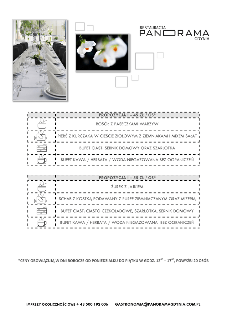 PROPOZYCJA I – 45 ZŁ / OS* ROSÓŁ Z PASECZKAMI WARZYW PIERŚ Z KURCZAKA W CIEŚCIE ZIOŁOWYM Z ZIEMNIAKAMI I MIXEM SAŁAT BUFET CIAST: SERNIK DOMOWY ORAZ SZARLOTKA BUFET KAWA / HERBATA / WODA NIEGAZOWANA BEZ OGRANICZEŃ PROPOZYCJA I – 55 ZŁ / OS* ŻUREK Z JAJKIEM SCHAB Z KOSTKĄ PODAWANY Z PUREE ZIEMNIACZANYM ORAZ MIZERIĄ BUFET CIAST: CIASTO CZEKOLADOWE, SZARLOTKA, SERNIK DOMOWY BUFET KAWA / HERBATA / WODA NIEGAZOWANA BEZ OGRANICZEŃ *CENY OBOWIĄZUJĄ W DNI ROBOCZE OD PONIEDZIAŁKU DO PIĄTKU W GODZ. 1200 – 1700, POWYŻEJ 20 OSÓB IMPREZY OKOLICZNOŚCIOWE + 48 500 192 006 [email protected]