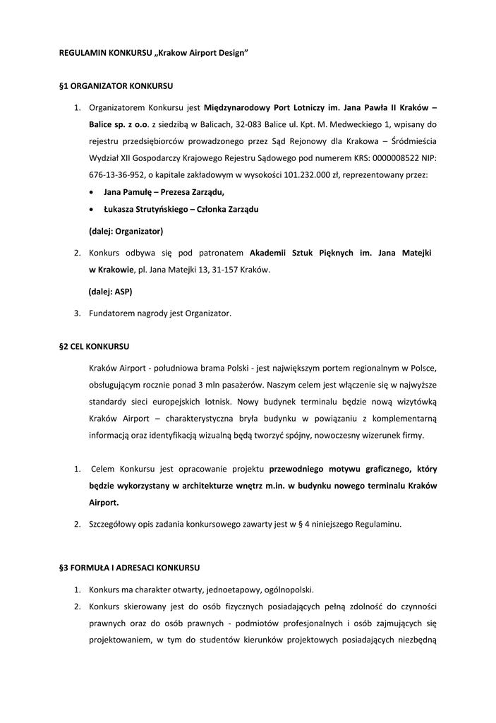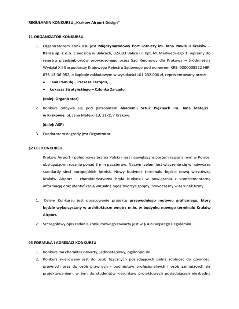REGULAMIN KONKURSU „Krakow Airport Design” §1 ORGANIZATOR KONKURSU 1. Organizatorem Konkursu jest Międzynarodowy Port Lotniczy im. Jana Pawła II Kraków – Balice sp. z o.o. z siedzibą w Balicach, 32-083 Balice ul. Kpt. M. Medweckiego 1, wpisany do rejestru przedsiębiorców prowadzonego przez Sąd Rejonowy dla Krakowa – Śródmieścia Wydział XII Gospodarczy Krajowego Rejestru Sądowego pod numerem KRS: 0000008522 NIP: 676-13-36-952, o kapitale zakładowym w wysokości 101.232.000 zł, reprezentowany przez: • Jana Pamułę – Prezesa Zarządu, • Łukasza Strutyńskiego – Członka Zarządu (dalej: Organizator) 2. Konkurs odbywa się pod patronatem Akademii Sztuk Pięknych im. Jana Matejki w Krakowie, pl. Jana Matejki 13, 31-157 Kraków. (dalej: ASP) 3. Fundatorem nagrody jest Organizator. §2 CEL KONKURSU Kraków Airport - południowa brama Polski - jest największym portem regionalnym w Polsce, obsługującym rocznie ponad 3 mln pasażerów. Naszym celem jest włączenie się w najwyższe standardy sieci europejskich lotnisk. Nowy budynek terminalu będzie nową wizytówką Kraków Airport – charakterystyczna bryła budynku w powiązaniu z komplementarną informacją oraz identyfikacją wizualną będą tworzyć spójny, nowoczesny wizerunek firmy. 1. Celem Konkursu jest opracowanie projektu przewodniego motywu graficznego, który będzie wykorzystany w architekturze wnętrz m.in. w budynku nowego terminalu Kraków Airport. 2. Szczegółowy opis zadania konkursowego zawarty jest w § 4 niniejszego Regulaminu. §3 FORMUŁA I ADRESACI KONKURSU 1. Konkurs ma charakter otwarty, jednoetapowy, ogólnopolski. 2. Konkurs skierowany jest do osób fizycznych posiadających pełną zdolność do czynności prawnych oraz do osób prawnych - podmiotów profesjonalnych i osób zajmujących się projektowaniem, w tym do studentów kierunków projektowych posiadających niezbędną wiedzę i doświadczenie do wykonania pracy określonej w § 4 niniejszego Regulaminu (dalej: Uczestnik). 3. Uczestnicy w określonym terminie zgłaszają prace przygotowane według wytycznych opisanych w Regulaminie. 4. Prace zostają poddane ocenie Jury Konkursu, które wybierze 1 zwycięską pracę. §4 OPIS ZADANIA KONKURSOWEGO 1. Zadaniem Uczestnika jest zaprojektowanie w oparciu o dostępne materiały przewodniego motywu graficznego, który będzie wykorzystany m.in. w budynku nowego terminalu Kraków Airport. 2. Projekt winien: a. charakteryzować się czytelnością oraz oryginalną i nowoczesną formą graficzną; b. konweniować z bryłą nowopowstającego budynku; c. nawiązywać do charakteru konkretnych przestrzeni – motyw przewodni może, aczkolwiek nie musi posiadać kilka spójnych wersji dla odpowiednich płaszczyzn; d. nawiązywać do miasta Krakowa i/lub regionu Małopolski. 3. Praca konkursowa powinna bazować na dokumentacji konkursowej tj. pobranych ze strony krakowairport.pl z zakładki Kraków Airport Design materiałach, w tym kluczowego materiału jakim jest dokumentacja projektowa przebudowy i rozbudowy istniejącego terminalu pasażerskiego w zakresie projektu wnętrz dla nowego obiektu, jak również Manualu Systemu Informacji Wizualnej Kraków Airport. 4. W przypadku tekstów będących częścią projektu, musi zostać zastosowana czcionka Kraków Airport, dostępna w dokumentacji konkursowej. 5. Przewodni motyw graficzny, o którym mowa w pkt. 1 niniejszego paragrafu zaimplementowany będzie m.in. na ścianach w salonach VIP i Business Lounge, na okładzinach ściennych w hali odlotów i przylotów, powierzchniach szklanych (w dokumentacji wykonawczej dla T4 są to odpowiednio dokumenty: (T4/PW/AW_14 – 17; T4/PW/AW_3 -4 ; T4/PW/AWso_2.1 oraz 2.2; T4_bls_4.1 oraz 4.2 oraz 3.1; T4_blns_4.1 oraz 4.2 oraz 3.1). 6. Zgłoszenie musi zawierać pracę konkursową, w której zakres wchodzą: a. plik graficzny obrazujący przewodni motyw graficzny Kraków Airport; b. plik graficzny obrazujący możliwe warianty motywu: warianty kolorystyczne, możliwość użycia fragmentu grafiki, ewentualne możliwości jej dzielenia, itp. c. plik graficzny obrazujący przewodni motyw graficzny Kraków Airport lub jego wersję dla salonów Business Lounge: lada recepcyjna, ściana za ladą recepcyjną, toaleta (dokumentacja: T4/bls/4.2, T4/bls/4.1; T4/bls/3.1, T4/blns/4.2, T4/W/blns/4.1, T4/blns/3.1); d. plik graficzny obrazujący przewodni motyw graficzny Kraków Airport lub jego wersję wkomponowaną na wybranej okładzinie ściennej w hallu check-in (dokumentacja: T4/PW/AW/3); e. plik graficzny obrazujący przewodni motyw graficzny Kraków Airport lub jego wersję wkomponowaną na wybranej okładzinie ściennej w sali check-in (dokumentacja: T4/PW/AW/16); f. plik graficzny obrazujący przewodni motyw graficzny Kraków Airport lub jego wersję wkomponowaną na wybranej okładzinie ściennej w sali odbioru bagażu (dokumentacja: T4/PW/AW/4); g. plik graficzny obrazujący przewodni motyw graficzny Kraków Airport lub jego wersję dla pokoju rodzica z dzieckiem i/lub placu zabaw (dokumentacja: T4/PW/AW/14, T4/PW/AW/15); h. plik graficzny obrazujący przewodni motyw graficzny Kraków Airport lub jego wersję dla powierzchni szklanej (dokumentacja:T4/PW/AW/17). i. plik graficzny obrazujący przewodni motyw graficzny Kraków Airport lub jego wersję dla stanowiska informacji lotniskowej i/lub turystycznej (dokumentacja: TP_PW_AWso_2.1, TP_PW_AWso_2.2). 7. Do rysunków powinien być dołączony opis koncepcji oraz opis wykonania na wskazanych w pkt.5 lit. c-i powierzchniach; przy czym Organizator Konkursu zastrzega sobie prawo, iż wybrany w niniejszym Konkursie motyw graficzny może być implementowany również na innych przestrzeniach kompleksu lub w materiałach marketingowych Organizatora. §5 WARUNKI UDZIAŁU W KONKURSIE 1. Warunkiem udziału w Konkursie jest wysłanie projektów wraz z formularzem zgłoszeniowym (załącznik nr 1 do Regulaminu) w formacie PDF (dowolna liczba plansz, łączni