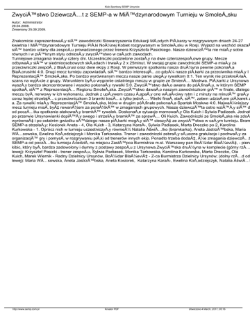 Klub Sportowy SEMP Ursynów ZwyciÄ™stwo DziewczÄ…t z SEMP-a w MiÄ™dzynarodowym Turnieju w SmoleÅ„sku Autor: Administrator 29.04.2008. Zmieniony 25.09.2009. Znakomicie zaprezentowaÅ‚y siÄ™ zawodniczki Stowarzyszenia Edukacji MÅ‚odych PiÅ‚karzy w rozgrywanym dniach 24-27 kwietnia I MiÄ™dzynarodowym Turnieju PiÅ‚ki Nożnej Kobiet rozgrywanym w SmoleÅ„sku w Rosji. Wyjazd na wschód okazaÅ siÄ™ bardzo udany dla zespoÅ‚u prowadzonego przez trenera Krzysztofa Pasickiego. Nasze dziewczÄ™ta nie miaÅ‚y sobie równych i w piÄ™knym stylu odniosÅ‚y zwyciÄ™stwo w caÅ‚ych zawodach. Turniejowe zmagania trwaÅ‚y cztery dni. Uczestniczki podzielone zostaÅ‚y na dwie czterozespoÅ‚owe grupy. Mecze odbywaÅ‚y siÄ™ w siedmioosobowych skÅ‚adach i trwaÅ‚y 2 x 25minut. W swojej grupie zawodniczki SEMP-a miaÅ‚y za przeciwniczki zespóÅ‚ z BiaÅ‚orusi oraz dwie ekipy z Rosji. W pierwszym spotkaniu nasza drużyna pewnie pokonaÅ‚a BiaÅ‚orusinki 4:0. Drugi mecz turnieju zapowiadaÅ‚ siÄ™ bardzo interesujÄ…co gdyż nasze piÅ‚karki za przeciwnika miaÅ‚y I ReprezentacjÄ™ SmoleÅ„ska. Po bardzo wyrównanym meczu nasze panie ulegÅ‚y rywalkom 0:1. Ten wynik nie przekreÅ›laÅ‚ szans na wyjÅ›cie z grupy. Warunkiem byÅ‚o wygranie ostatniego meczu w grupie ze SmienÄ… Moskwa. PiÅ‚karki z Ursynowa wyszÅ‚y bardzo skoncentrowane i wysoko pokonaÅ‚y rywalki 5:0. ZwyciÄ™stwo daÅ‚o awans do póÅ‚finaÅ‚u, w którym SEMP spotkaÅ‚ siÄ™ z ReprezentacjÄ… Regionu SmoleÅ„ska. ZwyciÄ™stwo dawaÅ‚o naszym zawodniczkom grÄ™ w finale, dlatego meczu byÅ‚ nerwowy w ich wykonaniu. Jednak z upÅ‚ywem czasu Å‚apaÅ‚y one wÅ‚aÅ›ciwy rytm i z minuty na minutÄ™ graÅ‚y coraz lepiej strzelajÄ…c przeciwniczkom 3 bramki tracÄ…c tylko jednÄ…. Wielki finaÅ‚ staÅ‚ siÄ™, zatem udziaÅ‚em piÅ‚karek z a. Za rywalki miaÅ‚y ReprezentacjÄ™ SmoleÅ„ska, która w drugim póÅ‚finale pokonaÅ‚a Spartak Moskwa 4:0. Najważniejszy mecz turnieju miaÅ‚ być rewanżem za porażkÄ™ w zmaganiach grupowych. Nasze dziewczÄ™ta ostro wzięły siÄ™ d od poczÄ…tku spotkania atakowaÅ‚y bramkÄ™ rywalek. DoskonaÅ‚e sytuacje marnowaÅ‚y Ola Kuich i Sylwia Padiasek. Jednak po przerwie Ursynowianki dopięły swego i strzeliÅ‚y bramkÄ™ za sprawÄ… Oli Kuich. Zawodniczki ze SmoleÅ„ska nie zdoÅ wyrównać i po ostatnim gwizdku sÄ™dziego nasze piÅ‚karki mogÅ‚y siÄ™ cieszyć ze zwyciÄ™stwa w caÅ‚ym turnieju. Bram SEMP-a strzelaÅ‚y: Kosiorek Aneta - 4, Ola Kuich - 3, Katarzyna KaraÅ›, Sylwia Padiasek, Marta Dreczko po 2, Karolina Kurkowska - 1. Oprócz nich w turnieju uczestniczyÅ‚y również Natalia ÅšwiÄ…tko (bramkarka), Aneta JastrzÄ™bska, Maria WÄ…sowska, Ewelina KoÅ‚odziejczyk i Monika Tarkowska. Trener i zawodniczki zebraÅ‚y sÅ‚uszne gratulacje i pochwaÅ‚y za organizacjÄ™ gry i pomysÅ‚ w rozgrywaniu piÅ‚ki od trenerów innych ekip. Ponadto trzeba dodać, że zmagania dziewczÄ…t SEMP-a od poczÄ…tku turnieju Å›ledziÅ‚ na miejscu ZastÄ™pca Burmistrza m.st. Warszawy pan Bożidar Blażević, - pierw kibic, który byÅ‚ bardzo zadowolony i dumny z postawy zespoÅ‚u z Ursynowa.ZwyciÄ™ska drużyna w komplecie (górny rzÄ… lewej): Krzysztof Pasicki - trener zespoÅ‚u, Sylwia Padiasek, Monika Tarkowska, Karolina Kurkowska, Marta Dreczko, Ola Kuich, Marek Wiernik - Radny Dzielnicy Ursynów, Bożidar Blażević - Z-ca Burmistrza Dzielnicy Ursynów; (dolny rzÄ…d od lewej): Maria WÄ…sowska, Aneta JastrzÄ™bska, Aneta Kosiorek, Katarzyna KaraÅ›, Ewelina KoÅ‚odziejczyk, Natalia ÅšwiÄ…t http://www.semp.com.pl Kreator PDF Utworzono 4 March, 2017, 05:16