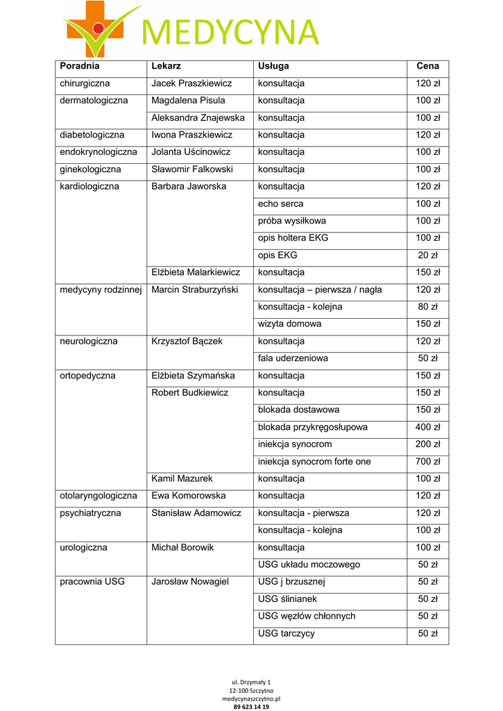 Poradnia Lekarz Usługa Cena chirurgiczna Jacek Praszkiewicz konsultacja 120 zł dermatologiczna Magdalena Pisula konsultacja 100 zł Aleksandra Znajewska konsultacja 100 zł diabetologiczna Iwona Praszkiewicz konsultacja 120 zł endokrynologiczna Jolanta Uścinowicz konsultacja 100 zł ginekologiczna Sławomir Falkowski konsultacja 100 zł kardiologiczna Barbara Jaworska konsultacja 120 zł echo serca 100 zł próba wysiłkowa 100 zł opis holtera EKG 100 zł opis EKG 20 zł Elżbieta Malarkiewicz konsultacja 150 zł Marcin Straburzyński konsultacja – pierwsza / nagła 120 zł konsultacja - kolejna 80 zł wizyta domowa 150 zł konsultacja 120 zł fala uderzeniowa 50 zł Elżbieta Szymańska konsultacja 150 zł Robert Budkiewicz konsultacja 150 zł blokada dostawowa 150 zł blokada przykręgosłupowa 400 zł iniekcja synocrom 200 zł iniekcja synocrom forte one 700 zł Kamil Mazurek konsultacja 100 zł otolaryngologiczna Ewa Komorowska konsultacja 120 zł psychiatryczna Stanisław Adamowicz konsultacja - pierwsza 120 zł konsultacja - kolejna 100 zł konsultacja 100 zł USG układu moczowego 50 zł USG j brzusznej 50 zł USG ślinianek 50 zł USG węzłów chłonnych 50 zł USG tarczycy 50 zł medycyny rodzinnej neurologiczna ortopedyczna urologiczna pracownia USG Krzysztof Bączek Michał Borowik Jarosław Nowagiel ul. Drzymały 1 12-100 Szczytno medycynaszczytno.pl 89 623 14 19 Usługi dodatkowe Cena Orzeczenie lekarskie dla celów rentowych ZUS i KRUS na wniosek zainteresowanego (wypełnienie wniosku, przygotowanie dokumentacji) 110 zł Orzeczenie dla celów epidemiologicznych z wpisem do książeczki 50 zł Orzeczenie lekarskie dla kandydatów dla kierowców 90 zł Orzeczenie lekarskie dla kandydatów dla kierowców zawodowych 160 zł Zaświadczenie lekarskie dla sądu w związku z niezdolnością uczestnictwa w rozprawie nie związane ze stanem zdrowia 50 zł Zaświadczenie lekarskie o stanie zdrowia dla celów mieszkaniowych i kwaterunkowych 50 zł Zaświadczenie lub orzeczenie lekarskie kwalifikujące zdolność do podjęcia nauki, doskonalania zawodowego, odbycia testów sprawnościowych ( nie dotyczy osób kontynuujących kształcenie) 50 zł Zaświadczenie lekarskie o stanie zdrowia dla zakładów pracy lub innych instytucji celem uzyskania świadczeń rzeczowych lub pieniężnych ( z wyjątkiem Opieki Społecznej) 50 zł Zaświadczenie lub orzeczenie lekarskie wydane dla osób wyjeżdżających za granicę (orzeczenie w języku polskim) 70 zł Zaświadczenie lekarskie o stanie zdrowia dla prywatnych ubezpieczycieli 120 zł Zaświadczenie lekarskie do urzędu mieszkaniowego o zwiększenie powierzchni lokalowej 50 zł Zaświadczenie lekarskie o braku przeciwskazań do zajęć aerobiku, pływania itp. 50 zł Orzeczenie lekarskie dla ratowników WOPR, GOPR 50 zł Obdukcja dla celów sądowo- lekarskich 100 zł ul. Drzymały 1 12-100 Szczytno medycynaszczytno.pl 89 623 14 19