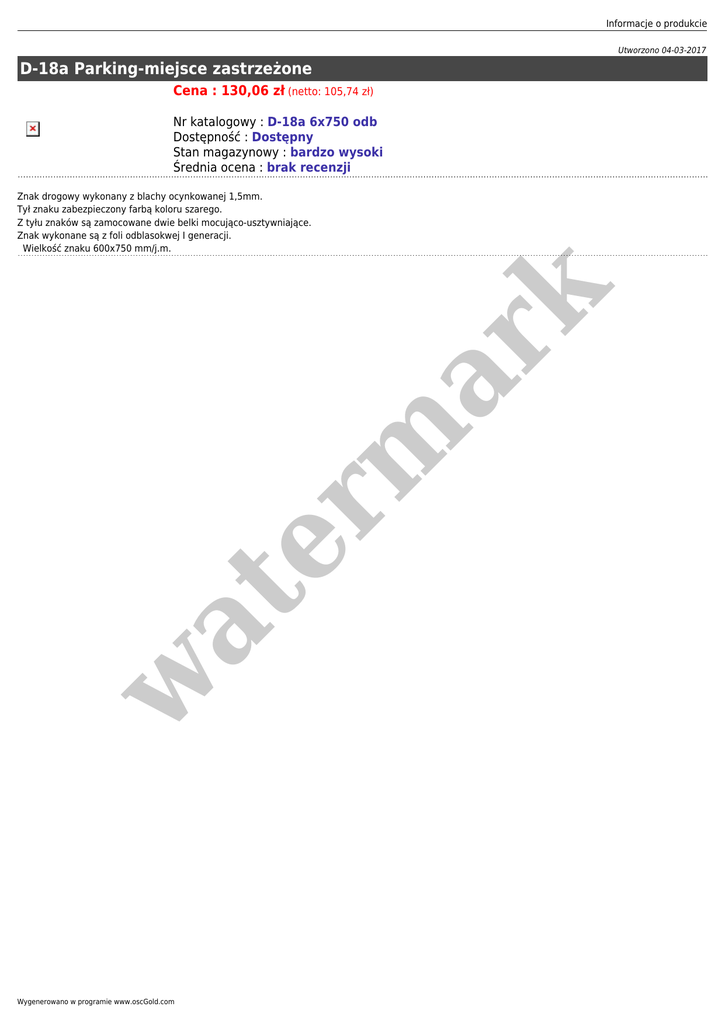 Informacje o produkcie Utworzono 04-03-2017 D-18a Parking-miejsce zastrzeżone Cena : 130,06 zł (netto: 105,74 zł) Nr katalogowy : D-18a 6x750 odb Dostępność : Dostępny Stan magazynowy : bardzo wysoki Średnia ocena : brak recenzji w at er m ar k Znak drogowy wykonany z blachy ocynkowanej 1,5mm. Tył znaku zabezpieczony farbą koloru szarego. Z tyłu znaków są zamocowane dwie belki mocująco-usztywniające. Znak wykonane są z foli odblasokwej I generacji. Wielkość znaku 600x750 mm/j.m. Wygenerowano w programie www.oscGold.com