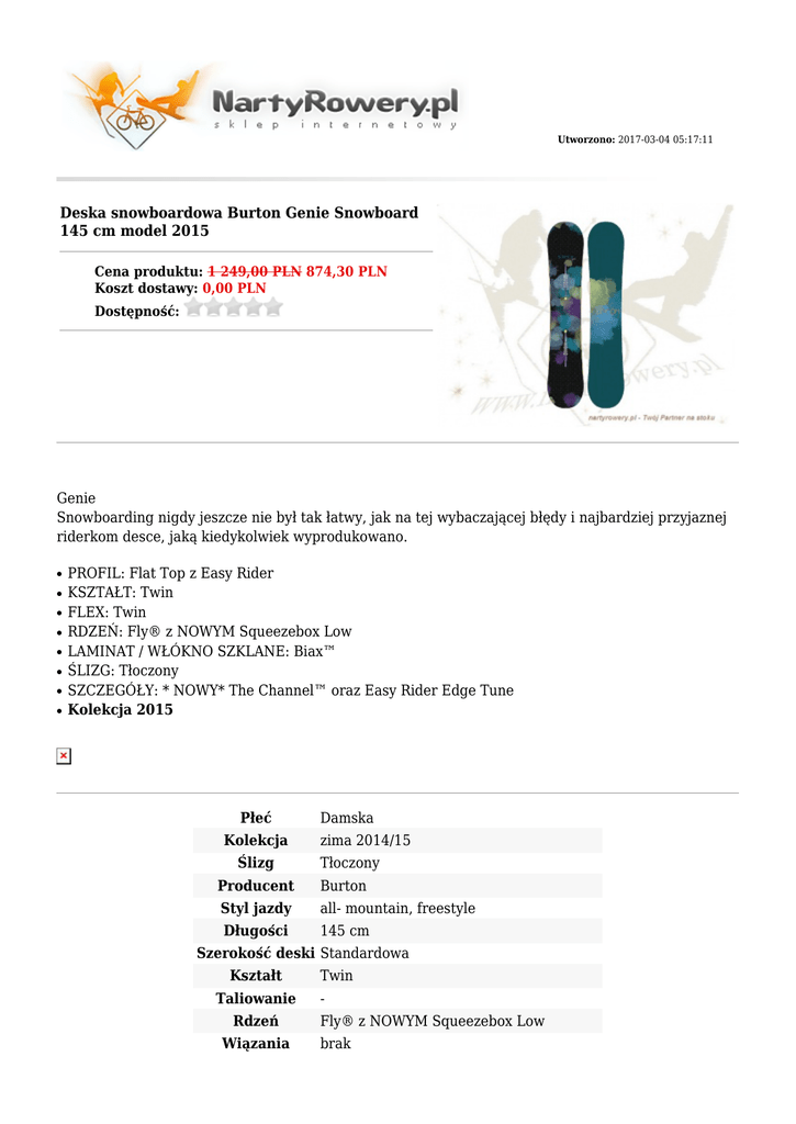 Utworzono: 2017-03-04 05:17:11 Deska snowboardowa Burton Genie Snowboard 145 cm model 2015 Cena produktu: 1 249,00 PLN 874,30 PLN Koszt dostawy: 0,00 PLN Dostępność: Genie Snowboarding nigdy jeszcze nie był tak łatwy, jak na tej wybaczającej błędy i najbardziej przyjaznej riderkom desce, jaką kiedykolwiek wyprodukowano. ● ● ● ● ● ● ● ● PROFIL: Flat Top z Easy Rider KSZTAŁT: Twin FLEX: Twin RDZEŃ: Fly® z NOWYM Squeezebox Low LAMINAT / WŁÓKNO SZKLANE: Biax™ ŚLIZG: Tłoczony SZCZEGÓŁY: * NOWY* The Channel™ oraz Easy Rider Edge Tune Kolekcja 2015 Płeć Kolekcja Ślizg Damska zima 2014/15 Tłoczony Producent Burton Styl jazdy all- mountain, freestyle Długości 145 cm Szerokość deski Standardowa Kształt Taliowanie Rdzeń Wiązania Twin Fly® z NOWYM Squeezebox Low brak Adres: http://nartyrowery.pl/ Telefon: 34 365 66 09 Email: [email protected] Gadu-Gadu: Skype:
