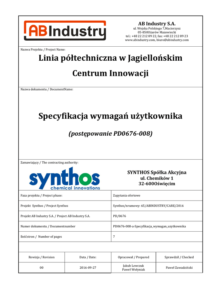 AB Industry S.A. ul. Wojska Polskiego 7,Macierzysz 05-850Ożarów Mazowiecki tel.: +48 22 212 89 22, fax: +48 22 212 89 23 www.abindustry.com, [email protected] Nazwa Projektu / Project Name: Linia półtechniczna w Jagiellońskim Centrum Innowacji Nazwa dokumentu / DocumentName: Specyfikacja wymagań użytkownika (postępowanie PD0676-008) Zamawiający / The contracting authority: SYNTHOS Spółka Akcyjna ul. Chemików 1 32-600Oświęcim Faza projektu / Project phase: Zapytania ofertowe Projekt Synthos / Project Synthos Synthos/nrumowy: 65/ABINDUSTRY/CARE/2016 Projekt AB Industry S.A. / Project AB Industry S.A. PD/0676 Numer dokumentu / Documentnumber PD0676-008-a-Specyfikacja_wymagan_uzytkownika Ilośćstron / Number of pages 7 Rewizja / Revision Data / Date: Opracował / Prepared Sprawdził / Checked 00 2016-09-27 Jakub Lewczuk Paweł Wołyniak Paweł Zawadziński SPECYFIKACJA WYMAGAŃ UŻYTKOWNIKA PD0676-008-a ZATWIERDZENIE DOKUMENTU Opracował: PODPIS Jakub Lewczuk Projektant Instalacji Procesowych AB Industry S.A. Paweł Wołyniak Projektant/Wdrożeniowiec AB Industry S.A. Akceptował: Paweł Zawadziński Kierownik Projektu AB Industry S.A. Zatwierdził Grzegorz Murzyn Specjalista ds. Inwestycji SynthosDwory S.A. Dominik Lipka Synthos S.A. Opracował / Prepared J. Lewczuk, P. Wołyniak Rewizja / Revision: Data / Date: Strona / Page: 00 2016-09-27 2 of 7 SPECYFIKACJA WYMAGAŃ UŻYTKOWNIKA PD0676-008-a I. WYMAGANIA OGÓLNE A. Opis Celem niniejszego dokumentu jest określenie wymagań użytkownika odnośnie dostawy i uruchomienia generatora azotu. Azot ma być produkowany z dostarczonego do urządzenia sprężonego powietrza z sieci zakładowej. Powietrze w sieci zakładowej ma niżej wyspecyfikowane parametry: Ciśnienie 7 bar Klasa czystości wg ISO 8573-1:2010 - pod względem zawartości oleju- klasa 1 - pod względem zawartości wilgoci i wody- klasa 2 - pod względem zawartości zanieczyszczeń stałych- klasa 1 Urządzenie będzie zainstalowane w budynku JCI nr 3 przy ulicy Bobrzyńskiego 14 w Krakowie, w pomieszczeniu technicznym 3.B.10 na poziomie -1. Schemat pomieszczenia - załącznik nr 1 Transport wewnętrzny do miejsca instalacji (pomieszczenie techniczne 3.B.10) przewidziany jest poprzez: - windę towarową o wymiarach 225cm, 205cm, 200cm (szer., głęb., wys.) - drzwi o szerokości 90 cm i wysokości 200 cm Media dostępne w pomieszczeniu instalacji: - woda oczyszczona wg aktualnych standardów zawartych w Farmakopei Polskiej - woda lodowa - sprężone powietrze 7 bar - energia elektryczna - kanalizacja Opracował / Prepared J. Lewczuk, P. Wołyniak Rewizja / Revision: Data / Date: Strona / Page: 00 2016-09-27 3 of 7 SPECYFIKACJA WYMAGAŃ UŻYTKOWNIKA PD0676-008-a 1. Wymagania funkcjonalne Numer wymagania I.1.1 I.1.2 Opis Wymagania Zapewnienie produkcji azotu na poziomie nie mniejszym niż 1,25 Nm3/h Czystość azotu 99,999% 2. Wymagania konstrukcyjne Numer wymagania I.2.1 I.2.2 I.2.3 Opis Wymagania Generator wyposażony w zbiornik buforowy o objętości minimum 100 litrów Ciśnienie azotu 2,5 bar Zasilanie urządzenia: 400 V 3 fazy 50 Hz i/lub 230 V 1 faza 50 Hz 3. Wymagania dotyczące AKPiA Numer wymagania I.3.1 Opis Wymagania Wymagania minimalne opomiarowania: - pomiar ciśnienia, z możliwością przekazania do systemu nadrzędnego - błędy i alarmy przekazywane do systemu nadrzędnego 4. Wymagania dotyczące bezpieczeństwa Numer wymagania I.4.1 I.4.2 Opis Wymagania Urządzenie musi posiadać znak "CE" oraz deklarację zgodności CE. Urządzenie powinno być zaprojektowane zgodnie z wymaganiami obowiązujących przepisów Bezpieczeństwa i Higieny Pracy. 5. Wymagania dotyczące dostępności Numer wymagania Opis Wymagania I.5.1 Standardowa obsługa urządzenia nie może wymagać podestów/drabinek dostępowych. Opracował / Prepared J. Lewczuk, P. Wołyniak Rewizja / Revision: Data / Date: Strona / Page: 00 2016-09-27 4 of 7 SPECYFIKACJA WYMAGAŃ UŻYTKOWNIKA PD0676-008-a 6. Wymagania dotyczące utrzymania urządzenia Numer wymagania I.6.1 I.6.2 I.6.3 I.6.4 I.6.5 Opis Wymagania Dostawca zobowiązany jest podczas instalacji przeszkolić personel Synthos pod kątem rutynowych czynności konserwacyjnych i technicznych. Dostawca zobowiązany jest po zakończeniu instalacji przeszkolić operatorów w zakresie obsługi urządzenia. Dostawca zobowiązany jest zapewnić reakcję serwisu gwarancyjnego w terminie 2 dni roboczych. Dostawca zobowiązany jest uwzględnić dostawę standardowych części zamiennych przez czas trwania gwarancji. Dostawca zobowiązany jest dostarczyć listę wszystkich części zamiennych i materiałów eksploatacyjnych wraz z odpowiednimi kodami. 7. Wymagania dotyczące dokumentacji Numer wymagania I.7.1 I.7.2 I.7.3 I.7.4 I.7.5 I.7.6 I.7.7 Opis Wymagania Cała dostarczana dokumentacja powinna być przygotowana w języku polskim lub angielskim. Wszystkie pliki elektroniczne w preferowanych formatach PDF oraz ODF Dostawca zobowiązany jest dostarczyć do akceptacji model 3D w wersji edytowalnej lub podkłady płaskie umożliwiające wykonanie modelu 3D. Schematy mechaniczne, schemat P&ID Świadectwa kontroli metrologicznej zainstalowanej AKP wystawione przez producenta lub akredytowane laboratorium pomiarowe Dokumentacja techniczno-ruchowa (DTR) do poszczególnych podzespołów dopuszczalna jest w wersji w języku polskim lub angielskim Instrukcja konserwacji w języku polskim 8. Wymagania dotyczące odbioru technicznego Numer wymagania I.8.1 I.8.2 Opis Wymagania FAT Dostawca zobowiązany jest wykonać testy oraz umożliwić przeprowadzenie testów przez Zamawiającego w zakładach konstrukcyjnych Dostawcy urządzenia. SAT Dostawca zobowiązany jest wykonać testy, przy obecności Zamawiającego Opracował / Prepared J. Lewczuk, P. Wołyniak Rewizja / Revision: Data / Date: Strona / Page: 00 2016-09-27 5 of 7 SPECYFIKACJA WYMAGAŃ UŻYTKOWNIKA PD0676-008-a I.8.3 I.8.4 w miejscu zainstalowania urządzenia. Dostawca zaproponuje i dostarczy Zamawiaj
