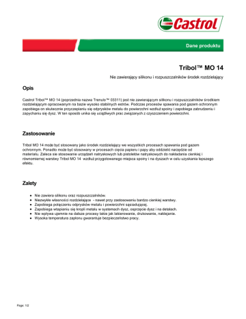 Dane produktu Tribol™ MO 14 Nie zawierający silikonu i rozpuszczalników środek rozdzielający Opis Castrol Tribol™ MO 14 (poprzednia nazwa Trenulo™ 03311) jest nie zawierającym silikonu i rozpuszczalników środkiem rozdzielającym opracowanym na bazie wysoko stabilnych estrów. Podczas procesów spawania pod gazem ochronnym zapobiega on skutecznie przyczepianiu się odprysków metalu do powierzchni wzdłuż spoiny i zapobiega zabrudzeniu i zapychaniu się dysz. W ten sposób unika się uciążliwych prac związanych z czyszczeniem powierzchni. Zastosowanie Tribol MO 14 może być stosowany jako środek rozdzielający we wszystkich procesach spawania pod gazem ochronnym. Ponadto może być stosowany w procesach cięcia papieru i papy aby oddzielić narzędzie od materiału. Zaleca sie stosowanie urządzeń natryskowych lub pistoletów natryskowych do nakładania cienkiej i równomiernej warstwy Tribol MO 14 wzdłuż przygotowanego miejsca spoiny i na dyszach w celu uzyskania lepszego efektu. Zalety Nie zawiera silikonu oraz rozpuszczalników. Niezwykłe własności rozdzielające - nawet przy zastosowaniu bardzo cienkiej warstwy. Zapobiega połączeniu odprysków metalu i powierzchni sąsiadującej. Zapobiega wtapianiu się kropli metalu w systemach dysz, osprzęcie dysz i na detalach. Nie wpływa ujemnie na dalsze procesy takie jak lakierowanie, drukowanie, naklejanie. Wysoka temperatura zapłonu gwarantuje bezpieczeństwo pracy. Page: 1/2 Dane Techniczne Parametr Metoda Jednostka Tribol MO 14 Wygląd Wzrokowo - Jasnożółty Lepkość kinematyczna przy 40°C DIN 51562 mm²/s 14 DIN 51757 / ASTM D1298 kg/m³ 908 ISO 2592 / ASTM D92 °C/°F >220 / >428 ISO 2160 / ASTM D130 - 1a Gęstość przy 15°C Temperatura zapłonu, COC Korozja na miedzi, 3 godz. przy 100°C Powyższe dane są typowymi wartościami uzyskiwanymi przy normalnych tolerancjach produkcyjnych i nie stanowią specyfikacji technicznych. Składowanie Wszystkie opakowania powinny być składowanie w pomieszczeniach zamkniętych. W przypadku magazynowania na zewnątrz budynku beczki należy składować w pozycji horyzontalnej, aby uniknąć przedostania się wody oraz zamazania oznakowania na beczkach. Produktów nie należy przechowywać w temperaturze powyżej 60°C, wystawiać na działanie promieni słonecznych. Produkt poprzednio wystepował pod nazwą Trenulo 03311. Zmiana nazwy nastąpiła w 2015. Tribol™ MO 14 07 Jun 2016 Castrol, the Castrol logo and related marks are trademarks of Castrol Limited, used under licence. Prawne wylaczenie Karta produktu i informacje w niej zawarte sa aktualne w momencie jej tworzenie i wydruku. Jednakze , nie dajemy gwarancji ze prezentowane wyrazenia lub zasugerowane zwroty , sa dokladne, precyzyjne i kompletne. Dane zawarte sa oparte na testach wykonanych w warunkach laboratoryjnych i nalezy je traktowac jako wskazówke i ogólna informacje. Uzytkownikom radzimy upewnic sie ze korzystaja z najnowszej wersji karty danych. Uzytkownicy sa odpowiedzialni za bezpieczne uzycie produktu , zgodnie z zastosowaniem i odpowiednim doborem , stosujac sie do wszystkich odpowiednich regulacji i wymagan prawnych. Karta bezpieczenstwa produktu SDS jest dostepna dla wszystkich produktów i powinna byc wykorzystana dla odpowiedniego skladowania, bezpiecznego zastosowania, oraz usuwania , utylizacji produktu. BP , jej filie oraz podmioty wspólpracujace nie ponosza odpowiedzialnosci za jakiekolwiek szkody , zniszczenia i urazy bedace rezultatem nieodpowiedniego uzycia produktu , za jakiekolwiek awarie powstale w wyniku zastosowania niezgodnie z rekomendacja produktu oraz za zagrozenia wlasciwe dla natury i srodowiska . Wszystkie produkty , serwis , obsluga i informacje sa dostarczane zgodnie z standardowymi warunkami sprzedazy. Jesli wymagane sa dodatkowe informacje nalezy sie skontaktowac z lokalnym przedstawicielem sprzedazy. BP Europa SE Oddzial w Polsce, ul. Jasnogórska 1,, 31-358 Kraków, Biuro Handlowe: ul. Chlodna 51 00-867 Warszawa Tel: 0048 22 582 65 00 Fax: 0048 22 582 65 13 www.castrol.pl Page: 2/2