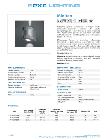 Miniten LED Naścienna oprawa oświetleniowa o rozsyle światła bezpośrednio-pośrednim zarówno do użytku zewnętrznego jak i wewnętrznego o klasie szczelności IP66. Przeznaczona głównie do iluminacji elementów architektonicznych i fasad budynków oraz podświetlania ścieżek i chodników. Wykonanie: Korpus z aluminium odlewanego ciśnieniowo, o podwyższonej odporności na środki chemiczne, korozję i opary kwasów, łączniki gwintowane ze stali nierdzewnej, szyba ochronna ze szkła hartowanego, odporna na temperatury oraz uszkodzenia mechaniczne, uszczelki silikonowe. Montaż: Naścienny. Akcesoria: soczewki optyczne o różnych kątach rozsyłu światła, przesłona modelująca strumień, soczewka podwójna (do wersji halogenowej) Zasilanie: 230 V DANE ELEKTRYCZNE Źródło światła Liczba źródeł światła Rodzaj osprzętu Napięcie znamionowe Zawiera źródło światła CERTYFIKATY I OZNACZENIA LED 2 Zasilacz 230 V Tak DANE MECHANICZNE Rodzaj montażu Materiał obudowy Naścienny Aluminium odlewane ciśnieniowo DANE INFORMACYJNE Kolor Stopień ochrony (IP) Odporność udarowa Klasa ochronności Ochrona źródła światła Klasa energetyczna CE ENEC IP66 IK10 I Tak A+ Tak Tak DANE ŚWIETLNE Rozsył światła DI/IN DANE OPTYCZNE Szary Raster / przesłona Kolor klosza/pokrywy Materiał klosza Odbłyśnik SH Brak Szkło przezroczyste Brak WYKONANIA Kod Moc źródła światła [W] Strumień świetlny źródła Strumień świetlny oprawy [lm] Temperatura barwowa [K] Kąt rozsyłu Info IV10531243 IV10231243 IV10231203 2×3 2×1,5 2×1,5 200 lm 200 lm 390 100 100 3000 3500 3500 60 60 5 60° 60° 5°/44° 14-1-2017 www.pxf.pl, [email protected] PXF Lighting, ul. Jutrzenki 73, 02-230 Warszawa, tel. +48 22 33 44 000, fax +48 22 33 44 033 WYMIARY L H L [mm] W [mm] H [mm] 125 90 104 L = Długość | W = Szerokość | H = Wysokość / głębokość W AKCESORIA Element optyczny Miniten Soczewka dla wersji LED IV28-9000-10 Miniten Przesłona dla wersji LED IV28-3099-85 14-1-2017 10° www.pxf.pl, [email protected] PXF Lighting, ul. Jutrzenki 73, 02-230 Warszawa, tel. +48 22 33 44 000, fax +48 22 33 44 033