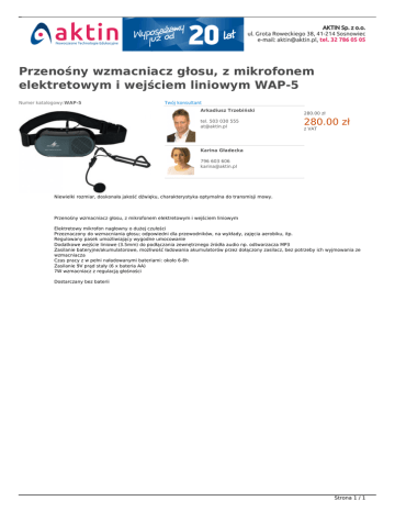 Przenośny wzmacniacz głosu, z mikrofonem elektretowym i wejściem liniowym WAP-5 Numer katalogowy:WAP-5 Twój konsultant Arkadiusz Trzebiński tel. 503 030 555 [email protected] NOWOŚĆ W OFERCIE 280.00 zł 280.00 zł z VAT Karina Gładecka 796 603 606 [email protected] Niewielki rozmiar, doskonała jakość dźwięku, charakterystyka optymalna do transmisji mowy. Przenośny wzmacniacz głosu, z mikrofonem elektretowym i wejściem liniowym Elektretowy mikrofon nagłowny o dużej czułości Przeznaczony do wzmacniania głosu; odpowiedni dla przewodników, na wykłady, zajęcia aerobiku, itp. Regulowany pasek umożliwiający wygodne umocowanie Dodatkowe wejście liniowe (3.5mm) do podłączania zewnętrznego źródła audio np. odtwarzacza MP3 Zasilanie bateryjne/akumulatorowe, możliwość ładowania akumulatorów przez dołączony zasilacz, bez potrzeby ich wyjmowania ze wzmacniacza Czas pracy z w pełni naładowanymi bateriami: około 6-8h Zasilanie 9V prąd stały (6 x bateria AA) 7W wzmacniacz z regulacją głośności Dostarczany bez baterii Strona 1 / 1 Powered by TCPDF (www.tcpdf.org)