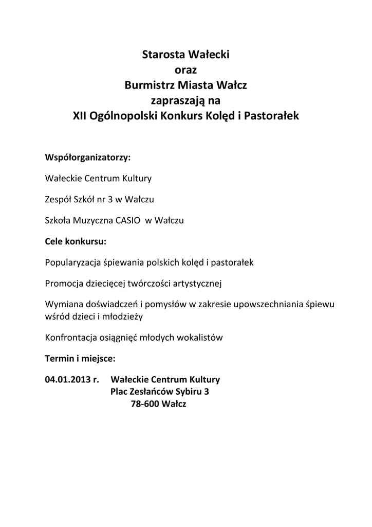 Starosta Wałecki oraz Burmistrz Miasta Wałcz zapraszają na XII Ogólnopolski Konkurs Kolęd i Pastorałek Współorganizatorzy: Wałeckie Centrum Kultury Zespół Szkół nr 3 w Wałczu Szkoła Muzyczna CASIO w Wałczu Cele konkursu: Popularyzacja śpiewania polskich kolęd i pastorałek Promocja dziecięcej twórczości artystycznej Wymiana doświadczeń i pomysłów w zakresie upowszechniania śpiewu wśród dzieci i młodzieży Konfrontacja osiągnięć młodych wokalistów Termin i miejsce: 04.01.2013 r. Wałeckie Centrum Kultury Plac Zesłańców Sybiru 3 78-600 Wałcz Regulamin Termin i miejsce: 04.01.2013 r. Wałeckie Centrum Kultury Wałcz, Plac Zesłańców Sybiru 3 Zgłoszenia do konkursu: Zgłoszenia będą przyjmowane na podstawie: Wypełnionej ankiety uczestnictwa Płyty CD z nagraniem (przez wykonawcę) utworu konkursowego Całość przesłać do dnia 28.12.2012 r. (decyduje data wpłynięcia) na adres: Wałeckie Centrum Kultury Plac Zesłańców Sybiru 3 78-600 Wałcz „Konkurs Kolęd i Pastorałek” Kontakt telefoniczny: 067 381 9553, 0-503 036 844 Dariusz Izban Warunki uczestnictwa: W konkursie mogą uczestniczyć soliści lub zespoły wokalne (max. do 6 osób) w trzech kategoriach wiekowych: 7- 12 lat 13-15 lat 16-19 lat Organizatorzy zastrzegają sobie prawo do utworzenia większej ilości kategorii . Wykonawca przygotowuje jedną kolędę lub pastorałkę w języku polskim z dowolnym akompaniamentem Wokalistom może towarzyszyć akompaniament „na żywo” lub „pólplayback” O występie zespołu w danej kategorii decyduje wiek większości członków ew. średnia wieku W konkursie nie mogą brać udziału zdobywcy Grand Prix z lat ubiegłych Uczestnicy pokrywają koszt wpisowego w wysokości 12 zł od jednego uczestnika Uczestnikom, którzy zadeklarują swój przyjazd w dniu 3.01.2013 oferujemy zakwaterowanie w jednym z wałeckich internatów Koszty noclegów pokrywają uczestnicy Przebieg konkursu: Komisja konkursowa po przesłuchaniu przesłanych nagrań wybierze uczestników konkursu, którzy zostaną powiadomieni do dnia 31.12.2012 r. Przesłuchania konkursowe odbędą się w dniu 4.01.2013 r. w sali widowiskowej Wałeckiego Centrum Kultury w Wałczu pl. Zesłańców Sybiru 3 o godz. 9.30 Poczęstunek dla uczestników ( podczas przerwy) Koncert galowy, w którym wystąpią laureaci oraz zaproszona gwiazda odbędzie się o godz. 17.30 w WCK Laureaci zobowiązani są do udziału w koncercie galowym Nagrody: Wszyscy uczestnicy otrzymają pamiątkowe dyplomy uczestnictwa Dla najlepszego wykonawcy przyznana będzie nagroda Grand Prix - jednorazowe stypendium w kwocie 1000 zł W każdej kategorii wiekowej przyznane będą nagrody rzeczowe za I, II , III miejsce Organizatorzy zastrzegają sobie prawo do innego podziału nagród Ostateczna interpretacja przepisów regulaminu należy do organizatorów