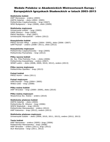 Medale Polaków w Akademickich Mistrzostwach Europy / Europejskich Igrzyskach Studenckich w latach 2003–2013 Siatkówka kobiet AWF Warszawa – srebro (2003) AWFiS Gdańsk – złoto (2004 i 2005) Politechnika Częstochowska – brąz (2007) WSG Bydgoszcz – brąz (2008), złoto (2009) Siatkówka mężczyzn Uniwersytet Łódzki – brąz (2005) UWM Olsztyn – brąz (2006) PWSZ Racibórz – brąz (2007) Uniwersytet Warszawski – srebro (2012) Koszykówka kobiet PWSZ Gorzów Wlkp. – srebro (2004 i 2005), złoto (2006 i 2007) UAM Poznań – srebro (2008 i 2011), złoto (2012) Koszykówka mężczyzn Politechnika Częstochowska – brąz (2005) Politechnika Poznańska – brąz (2012) Piłka ręczna kobiet Ak. Św. Filia Piotrków Tryb. – złoto (2006) Politechnika Koszalińska – srebro (2007) WSSP Lublin – złoto (2008, 2009, 2010, 2012), srebro (2013) Piłka ręczna mężczyzn Politechnika Opolska – brąz (2013) Futsal kobiet PWSZ Konin – złoto (2011) Futsal mężczyzn UAM Poznań – brąz (2004 i 2005) WSEZ Łódź – brąz (2008) Piłka nożna kobiet AWF Wrocław – brąz (2008 i 2009), złoto (2010) Piłka nożna mężczyzn Wszechnica Św. Kielce – srebro (2010) Siatkówka plażowa kobiet AWFiS Gdańsk – złoto (2004) Politechnika Śl. Gliwice – brąz (2006) WSFiZ Białystok – brąz (2010) Politechnika Warszawska – srebro (2012) AWF Katowice – brąz (2012), srebro (2013) Siatkówka plażowa mężczyzn Uniwersytet Łódzki – złoto (2009, 2010, 2011, 2013), srebro (2012, 2013) Tenis kobiet AWF Warszawa – srebro (2005) i brąz (2006) Politechnika Warszawska – brąz (2008) AWF Wrocław – srebro (2011), brąz (2012) ALK Warszawa – brąz (2011, 2012) Tenis mężczyzn SWPS Warszawa – srebro (2009) ALK Warszawa – złoto (2010) UAM Poznań – brąz (2011) Tenis stołowy kobiet AWF Wrocław – brąz (2007, także 1 złoty), brąz (2008, także 1 srebrny i 1 brązowy), 1 złoto w konkurencji 2009 AJD Częstochowa – złoto (2008, także 1 srebrny); złoto (2009, także 1 złoty i 1 brązowy); srebro (2010, także 1 brązowy); brąz (2013, także 1 brązowy), a także 2 brązowe w 2007 w konkurencjach Uniwersytet Warszawski – srebro (2011, także 1 złoty, 1 brązowy), brąz (2012), srebro (2013, także 1 brązowy) UE Wrocław – brąz (2011, także 1 brązowy), 1 brązowy w konkurencjach (2012) Tenis stołowy mężczyzn Uniwersytet Zielonogórski – brąz (2008) Politechnika Rzeszowska – srebro (2009, także 1 srebrny i 1 brązowy); brąz (2010, także 1 brązowy; 2011, także 2 brązowe); złoto (2012, także 1 srebrny i 2 brązowe); złoto (2013, także 1 złoty, 2 brązowe) OSW Olsztyn – złoto (2011, także 1 złoty, 1 srebrny, 1 brązowy), brąz (2012, także 1 brąz) Tenis stołowy K + M (mixty) AWF Wrocław / UE Wrocław – srebro 2008 AJD Częstochowa / Uniwersytet Zielonogórski – brąz 2008 AJD Częstochowa / Politechnika Rzeszowska – złoto i brąz 2009 Politechnika Rzeszowska / Uniwersytet Kazań – złoto 2010 UE Wrocław / Politechnika Rzeszowska – złoto 2011 Badminton AZS Polska – brąz (2004, także 2 srebrne i 4 brązowe), złoto (2005, także 2 złote, 1 srebrny, 1 brązowy), srebro (2006, także 1 złoty i 1 brązowy) AHE Łódź – złoto (2008, także 3 złote, 2 srebrne, 2 brązowe), złoto (2009, także 3 złote, 2 srebrne), złoto (2010, także 2 złote, 1 srebrny, 2 brązowe) AWF Wrocław – (2 złote w konkurencjach – 2008, 1 srebrny w konkurencjach - 2009) WSFiZ Białystok – (1 brązowy w konkurencjach – 2010) UWM Olsztyn – (1 srebrny w konkurencjach – 2012) Wioślarstwo WSG Bydgoszcz – (1 srebrny i 1 brązowy – 2006, 3 złote i 4 srebrne – 2008, 10 złotych i 2 srebrne – 2009, 4 złote, 1 srebrny, 3 brązowe – 2010; 1 złoty, 2 srebrne, 3 brązowe – 2011, 4 złote i 1 srebrny – 2013), klasyfikacja uczelniana – 1 miejsca w latach 2008, 2009, 2010, 2011, 2013 UKW Bydgoszcz – (1 srebrny i 1 brązowy – 2006, 2 złote i 1 srebrny – 2008, 1 złoty, 3 srebrne, 1 brązowy – 2009, 2 złote, 1 srebrny, 3 brązowe – 2010, 2 brązowe – 2011, 1 srebrny i 1 brązowy – 2013), klasyfikacja uczelniana – 2 miejsce (2010) UAM Poznań – (1 złoty – 2006, 2 srebrne – 2007, 2 złote i 1 brązowy – 2008, 1 złoty i 1 srebrny – 2009, 1 brązowy – 2010, 1 brązowy – 2013) ALK Warszawa – (1 brązowy – 2008) WSPiA Poznań – (1 złoty – 2009) UP Poznań – (1 złoty – 2009, 1 złoty – 2010, 2 złote, 1 srebrny, 1 brązowy - 2013) Brydż Politechnika Wrocławska – złoto (2009), srebro (2011), złoto (2013) Uniwersytet Warszawski – brąz (2011) Karate AZS Polska – 3 złote, 3 srebrne, 10 brązowych (2005) AZS Polska – 1 brązowy (2011) Politechnika Łódzka – 1 srebrny (2013) Taekwondo Uniwersytet Łódzki – 1 srebrny (2013) Podsumowanie 2003-2013 dyscyplina siatkówka K siatkówka M koszykówka K koszykówka M piłka ręczna K piłka ręczna M piłka nożna K piłka nożna M futsal K futsal M tenis stołowy K (drużynowo) tenis stołowy K (konkurencje) tenis stołowy M (drużynowo) tenis stołowy M (konkurencje) tenis stołowy K+M (konkurencje) tenis K tenis M badminton (drużynowo) badminton (konkurencje) siatkówka plażowa K siatkówka plażowa M wioślarstwo (konkurencje) wioślarstwo (drużynowo) karate (konkurencje) brydż taekwondo złoto 3 * 3 * 5 * 1 * 1 * 2 4 2 2 3 * 1 4 13 1 4 36 5 3 2 * srebro 1 1 4 * 2 * * 1 * * 3 2 1 3 1 2 1 1 10 2 2 22 1 4 1 1 brąz 2 3 * 2 * 1 2 * * 3 5 10 4 10 2 4 1 1 11 3 * 20 * 11 1 *