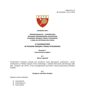 załącznik nr 6 do Protokołu z 24.11.2012 UCHWAŁA NR 3 SPRAWOZDAWCZO – WYBORCZEGO WALNEGO ZGROMADZENIA DELEGATÓW POLSKIEGO ZWIĄZKU TENISA STOŁOWEGO Z DNIA 24 LISTOPADA 2012 ROKU O CZŁONKOSTWIE W POLSKIM ZWIĄZKU TENISA STOŁOWEGO Rozdział 1. Postanowienia ogólne § 1. Zakres regulacji Przedmiotem niniejszej uchwały jest określenie zasad dotyczących uzyskiwania i utraty członkostwa w Polskim Związku Tenisa Stołowego z siedzibą Warszawie (określanego dalej jako: „Związek” lub „PZTS”), w tym szczegółowych warunków i trybu przyjmowania członków Związku. § 2. Kategorie członków Związku Związek zrzesza członków: 1) zwyczajnych; 2) wspierających; 3) honorowych. Rozdział 2. Członkowie zwyczajni § 3. Zakres podmiotowy Członkami zwyczajnymi Związku mogą być: 1) kluby sportowe posiadające sekcję tenisa stołowego; 2) wojewódzkie związki tenisa stołowego zrzeszające kluby sportowe tenisa stołowego; 3) inne osoby prawne, których statuty, umowy albo akty założycielskie przewidują prowadzenie działalności w tenisie stołowym. § 4. Tryb przyjmowania członków zwyczajnych 1. Z zastrzeżeniem postanowień § 5 niniejszej uchwały, członków zwyczajnych Związku przyjmuje Zarząd PZTS na podstawie ich pisemnego zgłoszenia. 2. Do zgłoszenia o przyjęcie na członka zwyczajnego Związku muszą być obowiązkowo dołączone następujące dokumenty: 1) uwierzytelniona 2) 3) 4) 5) kopia zarejestrowanego statutu, umowy albo aktu założycielskiego kandydata; aktualny na dzień składania zgłoszenia odpis z Krajowego Rejestru Sądowego kandydata; aktualne na dzień składania zgłoszenia zaświadczenie, wystawione przez PZTS lub właściwy wojewódzki związek tenisa stołowego, o uczestniczeniu przez zawodników kandydata we współzawodnictwie sportowym organizowanym przez PZTS lub wojewódzki związek tenisa stołowego; podpisana, zgodnie z zasadami reprezentacji kandydata, deklaracja, że kandydat będzie zawsze przestrzegać wszelkich przepisów statutów, regulaminów, wytycznych, decyzji i innych regulacji prawnych PZTS oraz międzynarodowych federacji sportowych, do których należy PZTS, w tym przepisów gry, oraz zapewniać ich przestrzeganie przez własnych członków, a w szczególności kluby, działaczy i zawodników; potwierdzenie uiszczenia opłaty członkowskiej (wpisowego). 3. Po rozpatrzeniu dokumentów, o których mowa w ust. 2, Zarząd PZTS podejmuje uchwałę o przyjęciu danej osoby prawnej jako członka zwyczajnego Związku. § 5. Tryb uzyskiwania członkostwa zwyczajnego przez kluby sportowe 1. Klub sportowy posiadający sekcję tenisa stołowego, uzyskując, zgodnie ze statutem danego wojewódzkiego związku tenisa stołowego, członkostwo w wojewódzkim związku tenisa stołowego, będącym członkiem zwyczajnym Związku, staje się równocześnie i automatycznie członkiem zwyczajnym Związku, bez konieczności podejmowania odrębnej uchwały przez Zarząd PZTS, z zastrzeżeniem postanowień ust. 3 i 4 poniżej. 2. Wojewódzkie związki tenisa stołowego są zobowiązane do uzyskania od klubów sportowych posiadających sekcję tenisa stołowego, ubiegających się o członkostwo w ich strukturze, dokumentów, o których mowa w § 4 ust. 2 pkt 1-4 niniejszej uchwały. 3. Postanowień ust. 1 nie stosuje się, jeżeli dany klub sportowy posiadający sekcję tenisa stołowego, przystępujący do wojewódzkiego związku tenisa stołowego, jednoczesne złoży oświadczenie o rezygnacji z chęci uzyskania członkostwa zwyczajnego w Związku. Nie wyklucza to możliwości uzyskania następnie przez taki klub status członka wspierającego Związku. 4. Gdy w danym województwie nie został utworzony wojewódzki związek tenisa stołowego kluby sportowe posiadające sekcję tenisa stołowego mogą uzyskać członkostwo bezpośrednio w Związku, stosownie do postanowień § 4 niniejszej uchwały, na podstawie uchwały Zarządu PZTS, jeżeli łączna liczba klubów sportowych posiadających sekcję tenisa stołowego mających siedzibę na terenie danego województwa nie jest wystarczająca do utworzenia przez te kluby wojewódzkiego związku tenisa stołowego. W przeciwnym wypadku kluby sportowe posiadające sekcję tenisa stołowego mające siedziby na terenie danego województwa, w liczbie wystarczającej do utworzenia przez te kluby wojewódzkiego związku tenisa stołowego, powinny utworzyć wojewódzki związek tenisa stołowego, który następnie wystąpi do Związku o uzyskanie członkostwa zwyczajnego. Wraz z uzyskaniem członkostwa zwyczajnego w Związku przez utworzony w ten sposób wojewódzki związek tenisa stołowego, członkami Związku staną się również zrzeszone w nim kluby sportowe posiadające sekcję tenisa stołowego. § 6. Prawa i obowiązki członków zwyczajnych 1. Członkowie zwyczajni Związku mają prawo do: 1) brania udziału i wykonywania prawa głosu na Walnych Zgromadzeniach Delegatów Związku za pośrednictwem swoich delegatów, wybieranych zgodnie z zasadami określonymi w § 22 ust. 1 lit. a Statutu PZTS; 2) biernego i czynnego udziału w wyborach do władz Związku – poprzez swych delegatów wybieranych zgodnie z zasadami określonymi w § 22 ust. 1 lit. a Statutu PZTS; 3) zgłaszania postulatów i wniosków wobec władz Związku; 4) korzystania z uprawnień członkowskich wynikających ze statutowej działalności Związku; 5) wyrażania opinii o działalności Związku wynikającej z troski o dobro Związku i jego członków; 6) uzyskiwania od organów Związku informacji o działalności i zamierzeniach Związku; 7) pomocy szkoleniowej i organizacyjnej ze strony Związku. 2. Członkowie zwyczajni Związku są zobowiązani do: 1) aktywnej działalności na rzecz rozwoju i podnoszenia poziomu sportowego tenisa stołowego; 2) dbania o dobre imię Związku; 3) przestrzegania Statutu PZTS, regulaminów PZTS oraz innych przepisów obowiązujących w sporcie; 4) uiszczania corocznych składek 