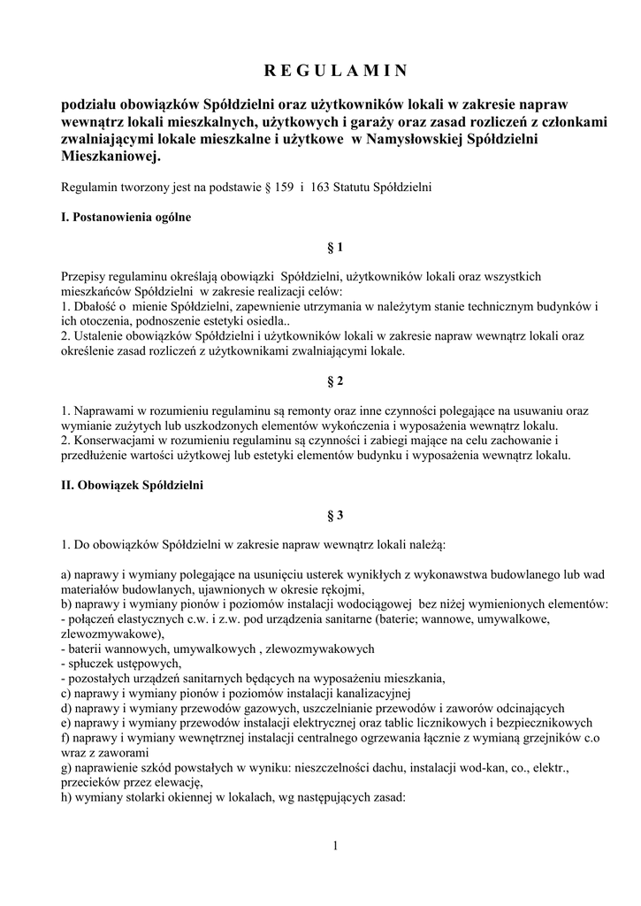 REGULAMIN podziału obowiązków Spółdzielni oraz użytkowników lokali w zakresie napraw wewnątrz lokali mieszkalnych, użytkowych i garaży oraz zasad rozliczeń z członkami zwalniającymi lokale mieszkalne i użytkowe w Namysłowskiej Spółdzielni Mieszkaniowej. Regulamin tworzony jest na podstawie § 159 i 163 Statutu Spółdzielni I. Postanowienia ogólne §1 Przepisy regulaminu określają obowiązki Spółdzielni, użytkowników lokali oraz wszystkich mieszkańców Spółdzielni w zakresie realizacji celów: 1. Dbałość o mienie Spółdzielni, zapewnienie utrzymania w należytym stanie technicznym budynków i ich otoczenia, podnoszenie estetyki osiedla.. 2. Ustalenie obowiązków Spółdzielni i użytkowników lokali w zakresie napraw wewnątrz lokali oraz określenie zasad rozliczeń z użytkownikami zwalniającymi lokale. §2 1. Naprawami w rozumieniu regulaminu są remonty oraz inne czynności polegające na usuwaniu oraz wymianie zużytych lub uszkodzonych elementów wykończenia i wyposażenia wewnątrz lokalu. 2. Konserwacjami w rozumieniu regulaminu są czynności i zabiegi mające na celu zachowanie i przedłużenie wartości użytkowej lub estetyki elementów budynku i wyposażenia wewnątrz lokalu. II. Obowiązek Spółdzielni §3 1. Do obowiązków Spółdzielni w zakresie napraw wewnątrz lokali należą: a) naprawy i wymiany polegające na usunięciu usterek wynikłych z wykonawstwa budowlanego lub wad materiałów budowlanych, ujawnionych w okresie rękojmi, b) naprawy i wymiany pionów i poziomów instalacji wodociągowej bez niżej wymienionych elementów: - połączeń elastycznych c.w. i z.w. pod urządzenia sanitarne (baterie; wannowe, umywalkowe, zlewozmywakowe), - baterii wannowych, umywalkowych , zlewozmywakowych - spłuczek ustępowych, - pozostałych urządzeń sanitarnych będących na wyposażeniu mieszkania, c) naprawy i wymiany pionów i poziomów instalacji kanalizacyjnej d) naprawy i wymiany przewodów gazowych, uszczelnianie przewodów i zaworów odcinających e) naprawy i wymiany przewodów instalacji elektrycznej oraz tablic licznikowych i bezpiecznikowych f) naprawy i wymiany wewnętrznej instalacji centralnego ogrzewania łącznie z wymianą grzejników c.o wraz z zaworami g) naprawienie szkód powstałych w wyniku: nieszczelności dachu, instalacji wod-kan, co., elektr., przecieków przez elewację, h) wymiany stolarki okiennej w lokalach, wg następujących zasad: 1 - kwalifikacja okien do wymiany w lokalach mieszkalnych i użytkowych odbywa się na pisemny wniosek członka lub właściciela, rejestr wniosków znajduje się w administracji spółdzielni.; - w terminie dwóch tygodni od daty złożenia wniosku administrator dokonuje komisyjnego przeglądu stolarki okiennej, spisując protokół z zakwalifikowania okien do wymiany i informuje na piśmie o podjętej decyzji wnioskodawcę oraz jakie warunki należy spełnić w przypadku zakwalifikowania okien do wymiany . i) naprawy ścian i sufitów polegające na uzupełnieniu z wyłączeniem zarysowań i uszkodzeń mechanicznych, j) naprawy instalacji domofonowej z wyłączeniem: - mechanicznego uszkodzenia instalacji domofonowej wewnątrz mieszkania, - zmiany usytuowania kasety domofonowej, - modernizacji lub wymiany instalacji domofonowej k) naprawy i konserwacji przewodów i kratek wentylacyjnych oraz przewodów spalinowych 2. Naprawy, o których mowa w pkt 1 nie będą wykonywane w przypadku zmian i przeróbek dokonanych przez użytkownika lokalu bez pisemnej zgody Spółdzielni 3. Naprawy, o których mowa w ust.1 od a÷i, k - finansowane będą z odpisu na remonty i konserwacje, natomiast naprawy wyszczególnione w ppkt „j” pokrywane będą z odrębnej wpłaty wnoszonej przez użytkowników mieszkań. 4. Wymiana stolarki okiennej w lokalach mieszkalnych finansowana jest z funduszu remontowego, w wysokości określonej w Uchwale Rady Nadzorczej SM . 5. Wymiana stolarki okiennej, w części wspólnej budynku finansowana jest z funduszu remontowego. III. Do obowiązków członków spółdzielni, właścicieli oraz najemców w zakresie napraw wewnątrz lokali należy: §4 1. Naprawy wewnątrz lokali, nie zaliczone do obowiązków Spółdzielni obciążają członków, właścicieli oraz najemców zajmujących lokale mieszkalne oraz lokale o innym przeznaczeniu. 2. Zakres napraw i obowiązków użytkowników lokali zasiedlonych na podstawie umowy najmu określa umowa zawarta z użytkownikiem lokalu 3. Użytkownicy lokali zobowiązani są utrzymywać zajmowany lokal oraz przynależne do niego pomieszczenia we właściwym stanie technicznym i sanitarnym poprzez wykonywanie napraw i odnowień. 4. Do szczegółowych obowiązków użytkownika lokalu należy: a) malowanie sufitów i ścian wraz z usuwaniem drobnych uszkodzeń tynków i zarysowań z częstotliwością co najmniej raz na 5 lat lub tapetowanie ścian z częstotliwością wynikającą z właściwości techniczno-estetycznych tapet, b) konserwacja stolarki 2 - drzwiowej wewnętrznej (malowanie obustronne), drzwi wejściowych do mieszkania od weewnątrz - stolarki okiennej drewnianej co najmniej raz na 4 lata, - okiennej i drzwiowej z pcw. wg zaleceń producenta c) malowanie i konserwacja mebli wbudowanych, d) malowanie lamperii w kuchni i pomieszczeniach sanitarnych, konserwacji grzejników, rur, urządzeń malowanych farbą olejną w celu zabezpieczenia ich przed korozją, e) konserwacja posadzek z drewna i materiałów drewnopochodnych (cyklinowanie oraz ich lakierowanie), f) naprawa powierzchni ściennych wyłożonych płytkami ceramicznymi (np. glazura) i tapetami, g) naprawy lub wymiana posadzek pcw, h) dopasowywanie, uszczelnianie i naprawa stolarki okiennej i drzwiowej, oraz drzwi do lokalu, łącznie z ich wymianą, dotyczy również bram garażowych, i) regulacja, konserwacja i wymiana okuć, zamków okiennych i drzwiowych, j) wymiana uszkodzonego oszklenia okien, świetlików, drzwi wewnętrznych k) naprawa i wymiana m