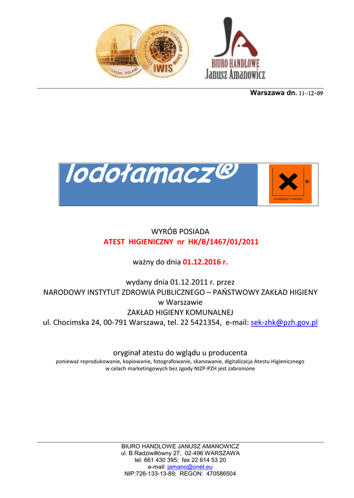 Warszawa dn. lodołamacz® WYRÓB POSIADA ATEST HIGIENICZNY nr HK/B/1467/01/2011 ważny do dnia 01.12.2016 r. wydany dnia 01.12.2011 r. przez NARODOWY INSTYTUT ZDROWIA PUBLICZNEGO – PAŃSTWOWY ZAKŁAD HIGIENY w Warszawie ZAKŁAD HIGIENY KOMUNALNEJ ul. Chocimska 24, 00-791 Warszawa, tel. 22 5421354, e-mail: [email protected] oryginał atestu do wglądu u producenta ponieważ reprodukowanie, kopiowanie, fotografowanie, skanowanie, digitalizacja Atestu Higienicznego w celach marketingowych bez zgody NIZP-PZH jest zabronione BIURO HANDLOWE JANUSZ AMANOWICZ ul. B.Radziwiłłówny 27, 02-496 WARSZAWA tel. 661 430 395; fax 22 614 53 20 e-mail: [email protected] NIP:726-133-13-89; REGON: 470586504